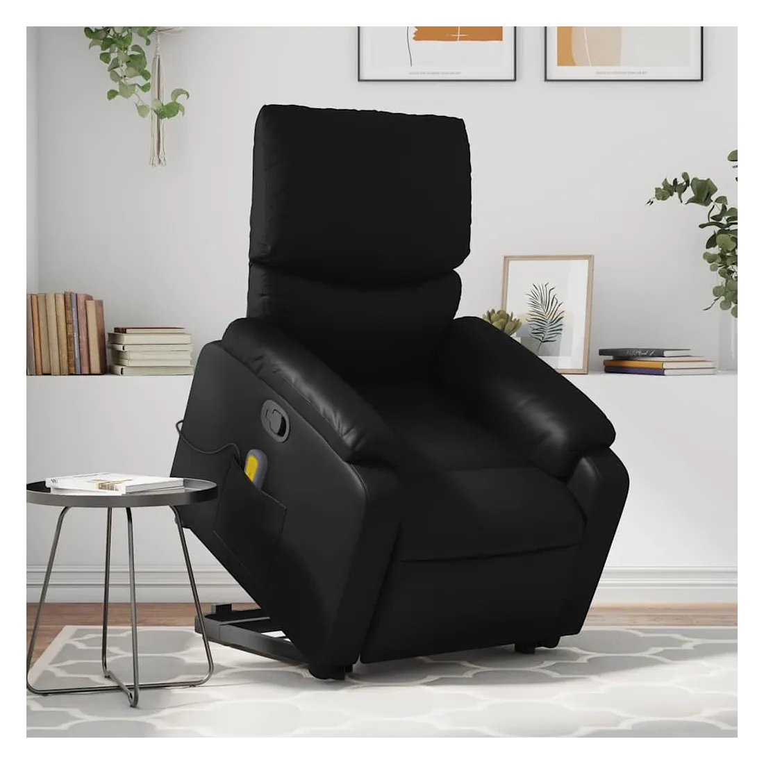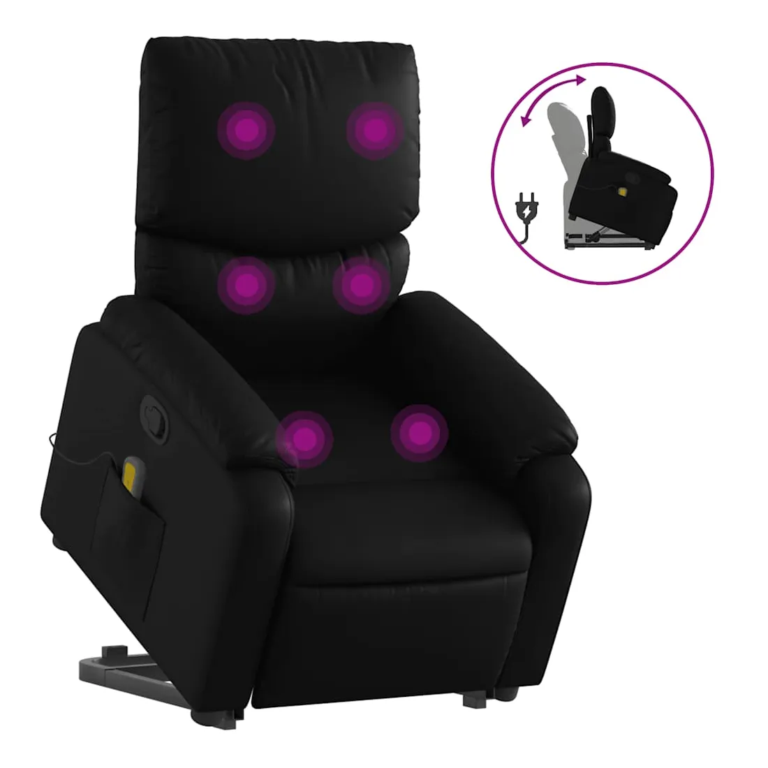Asseyez-vous et détendez-vous dans ce fauteuil inclinable de massage très confortable ! Fonction de levage électrique : ce fauteuil inclinable pour personnes âgées est équipé d'un moteur électrique pour la fonction de levage. Grâce à la fonction qui pousse toute la chaise vers le haut, vous pouvez facilement vous tenir debout sans stresser votre dos et vos genoux en appuyant simplement sur le bouton.Fonction d'inclinaison manuelle : ce fauteuil inclinable est doté d'une poignée du côté droit. Vous pouvez régler manuellement le repose-pieds et le dossier dans n'importe quelle position selon votre confort en tirant simplement sur la poignée. Cette fonction permet une inclinaison maximale de 135 degrés. De plus, le dossier peut revenir rapidement à sa position d'origine en tirant simplement sur la poignée.Fonction de vibration : les 6 points de massage vous permettent de faire l'expérience d'un massage mieux ciblé. De plus, la télécommande incluse vous permet de choisir différents programmes de massage. La fonction de massage est alimentée par le connecteur USB qui nécessite une source d'alimentation USB certifiée de 5 V (non fournie).Expérience de siège confortable : le siège, le dossier et les larges accoudoirs rembourrés épais recouverts de similicuir procurent une sensation confortable, vous faisant vous sentir enlacé lorsque vous êtes assis. Le similicuir est un matériau très résistant. Il est résistant aux taches, ce qui le rend facile à nettoyer avec un chiffon humide. La surface lisse donne également un aspect luxueux et la beauté du cuir véritable.Poche latérale pratique : ce fauteuil est doté d'une poche latérale pour ranger votre télécommande ou garder vos objets essentiels à portée de main.Cadre solide et stable : le cadre en bois et en métal offre une structure solide et une grande stabilité. Ce fauteuil inclinable est confortable et durable.