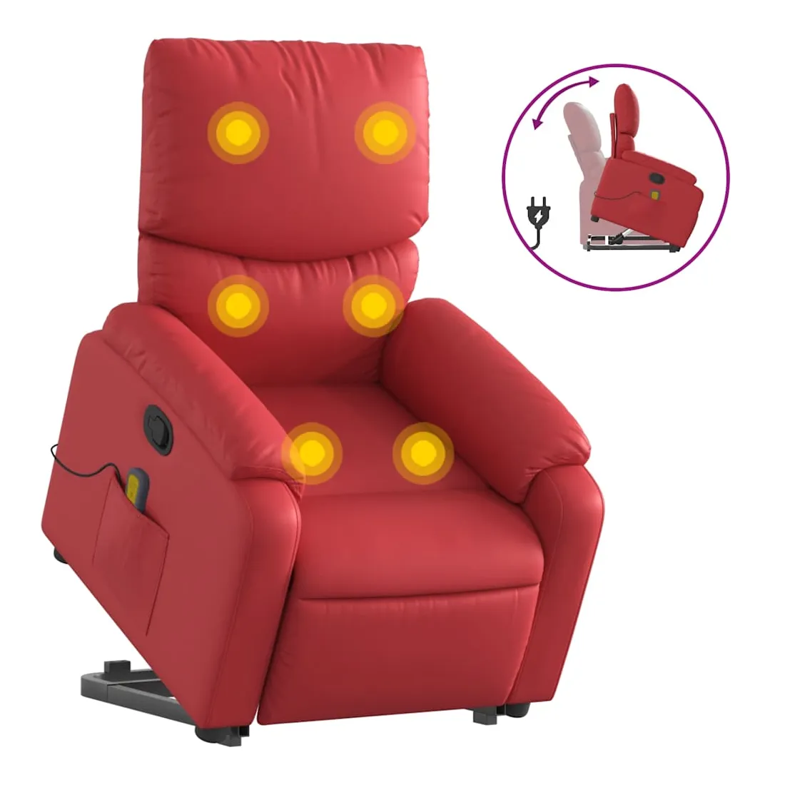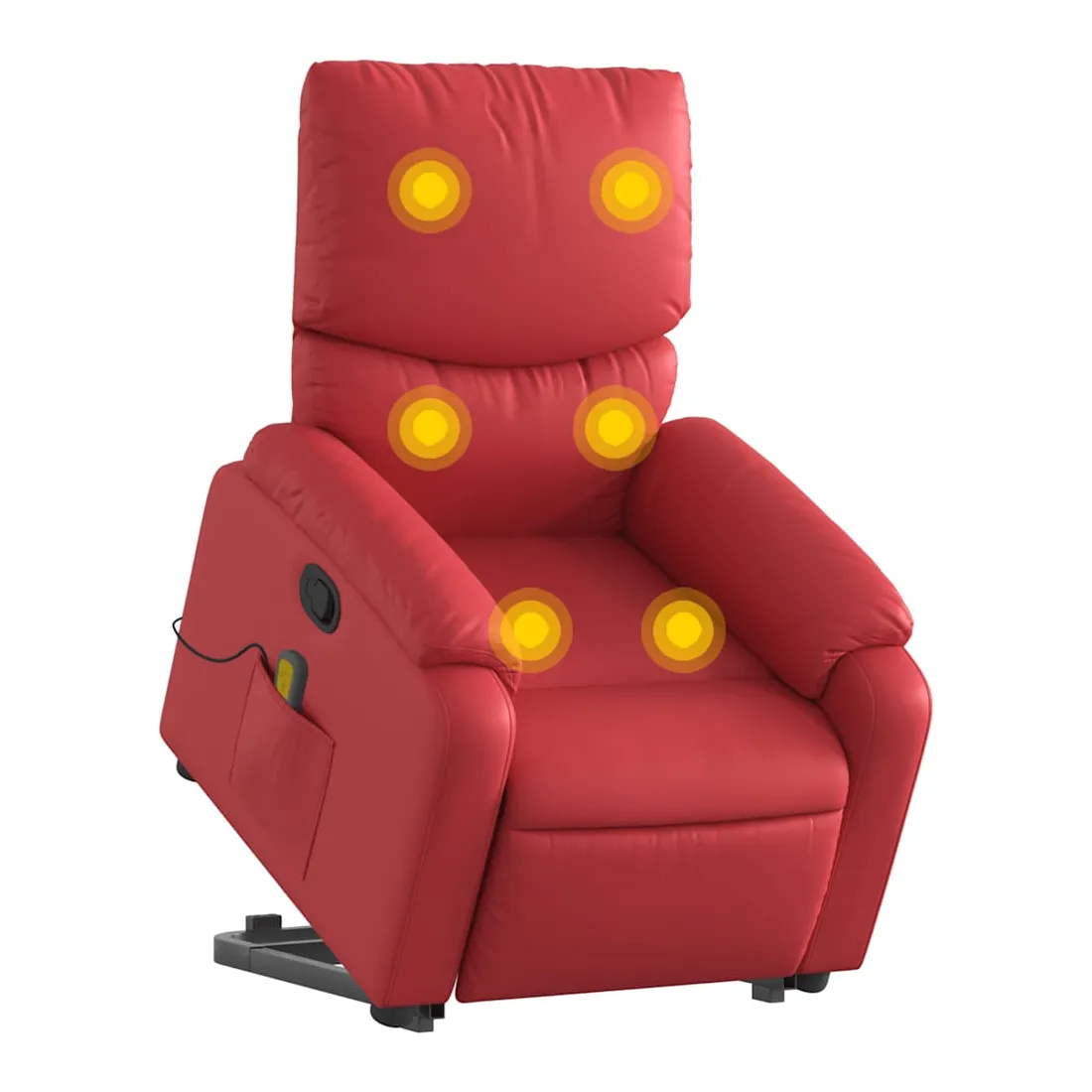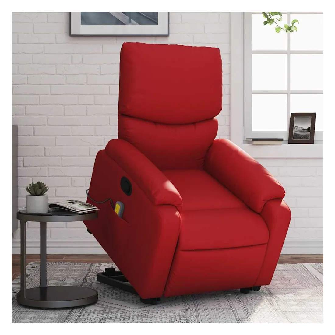 Asseyez-vous et détendez-vous dans ce fauteuil inclinable de massage très confortable ! Fonction de levage électrique : ce fauteuil inclinable pour personnes âgées est équipé d'un moteur électrique pour la fonction de levage. Grâce à la fonction qui pousse toute la chaise vers le haut, vous pouvez facilement vous tenir debout sans stresser votre dos et vos genoux en appuyant simplement sur le bouton.Fonction d'inclinaison manuelle : ce fauteuil inclinable est doté d'une poignée du côté droit. Vous pouvez régler manuellement le repose-pieds et le dossier dans n'importe quelle position selon votre confort en tirant simplement sur la poignée. Cette fonction permet une inclinaison maximale de 135 degrés. De plus, le dossier peut revenir rapidement à sa position d'origine en tirant simplement sur la poignée.Fonction de vibration : les 6 points de massage vous permettent de faire l'expérience d'un massage mieux ciblé. De plus, la télécommande incluse vous permet de choisir différents programmes de massage. La fonction de massage est alimentée par le connecteur USB qui nécessite une source d'alimentation USB certifiée de 5 V (non fournie).Expérience de siège confortable : le siège, le dossier et les larges accoudoirs rembourrés épais recouverts de similicuir procurent une sensation confortable, vous faisant vous sentir enlacé lorsque vous êtes assis. Le similicuir est un matériau très résistant. Il est résistant aux taches, ce qui le rend facile à nettoyer avec un chiffon humide. La surface lisse donne également un aspect luxueux et la beauté du cuir véritable.Poche latérale pratique : ce fauteuil est doté d'une poche latérale pour ranger votre télécommande ou garder vos objets essentiels à portée de main.Cadre solide et stable : le cadre en bois et en métal offre une structure solide et une grande stabilité. Ce fauteuil inclinable est confortable et durable.