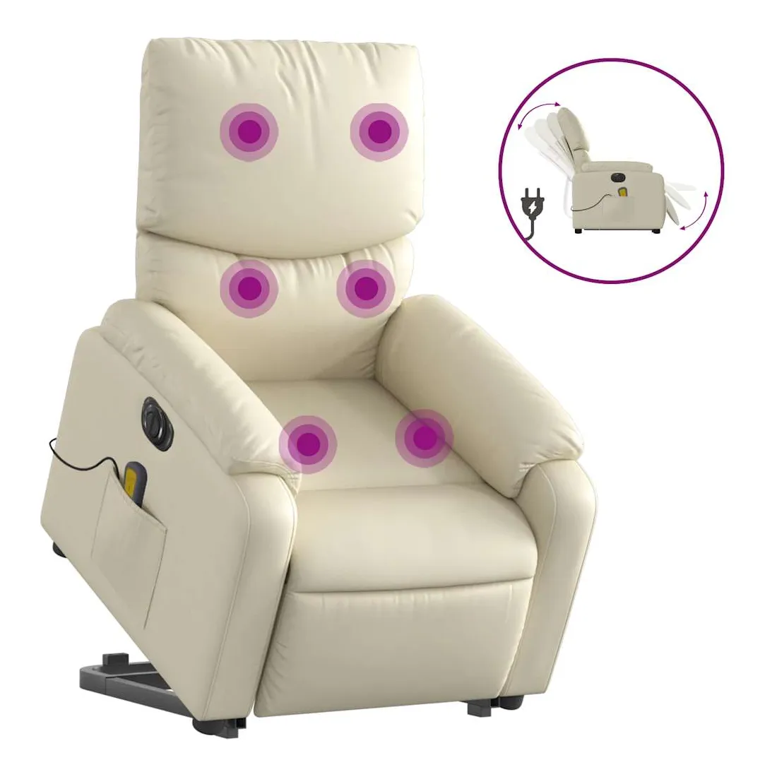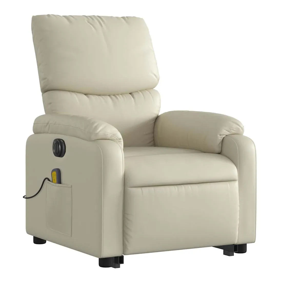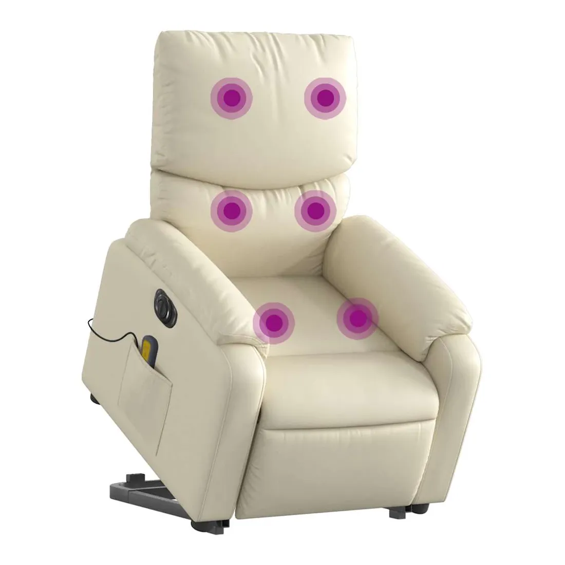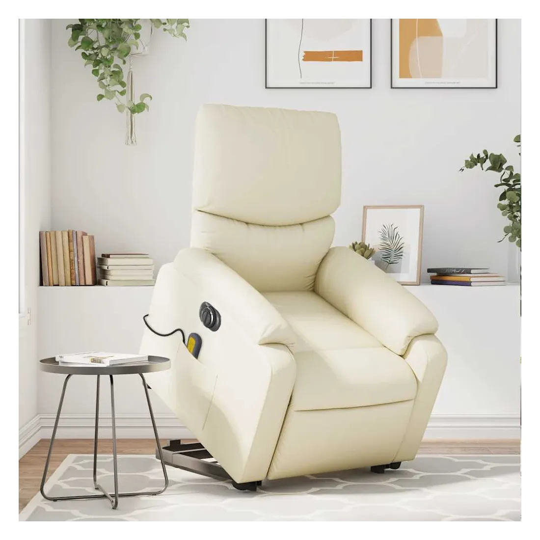 Asseyez-vous et détendez-vous dans ce fauteuil inclinable de massage électrique très confortable ! Fonction de levage électrique : ce fauteuil inclinable pour personnes âgées est équipé d'un moteur électrique pour la fonction de levage. Grâce à la fonction qui pousse toute la chaise vers le haut, vous pouvez facilement vous tenir debout sans stresser votre dos et vos genoux en appuyant simplement sur le bouton.Fonction d'inclinaison électrique : ce fauteuil inclinable est également équipé d'un moteur électrique qui permet de régler automatiquement le repose-pied et le dossier dans n'importe quelle position, selon votre confort, en appuyant simplement sur le bouton situé sur le côté du fauteuil. Cette fonction permet une inclinaison maximale de 135 degrés. En outre, le dossier peut revenir automatiquement à sa position d'origine par une simple pression sur le bouton.Fonction de vibration : les 6 points de massage vous permettent de faire l'expérience d'un massage mieux ciblé. De plus, la télécommande incluse vous permet de choisir différents programmes de massage. La fonction de massage est alimentée par le connecteur USB qui nécessite une source d'alimentation USB certifiée de 5 V (non fournie).Expérience de siège confortable : le siège, le dossier et les larges accoudoirs rembourrés épais recouverts de similicuir procurent une sensation confortable, vous faisant vous sentir enlacé lorsque vous êtes assis. Le similicuir est un matériau très résistant. Il est résistant aux taches, ce qui le rend facile à nettoyer avec un chiffon humide. La surface lisse donne également un aspect luxueux et la beauté du cuir véritable.Poche latérale pratique : ce fauteuil est doté d'une poche latérale pour ranger votre télécommande ou garder vos objets essentiels à portée de main.Cadre solide et stable : le cadre en bois et en métal offre une structure solide et une grande stabilité. Ce fauteuil inclinable est confortable et durable.