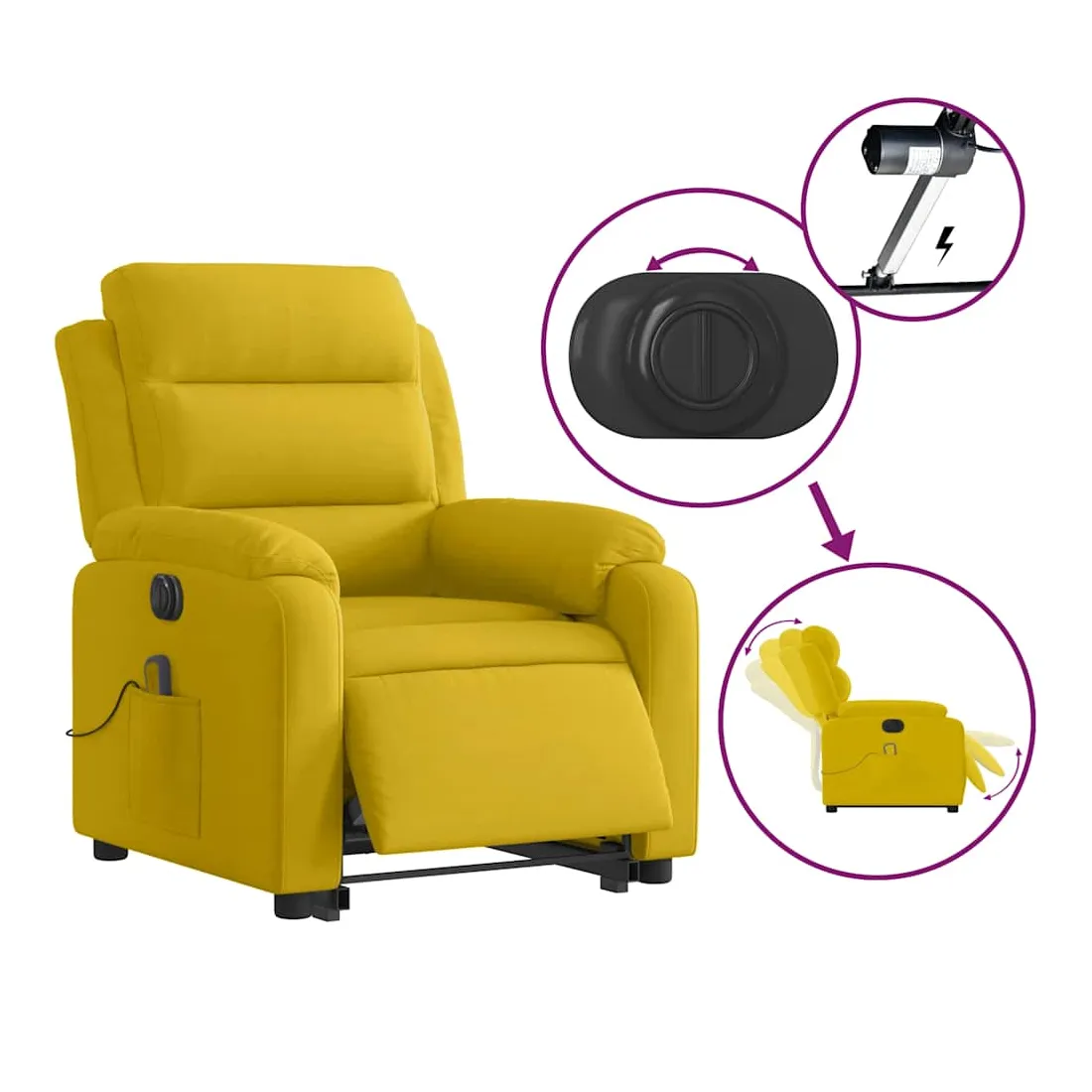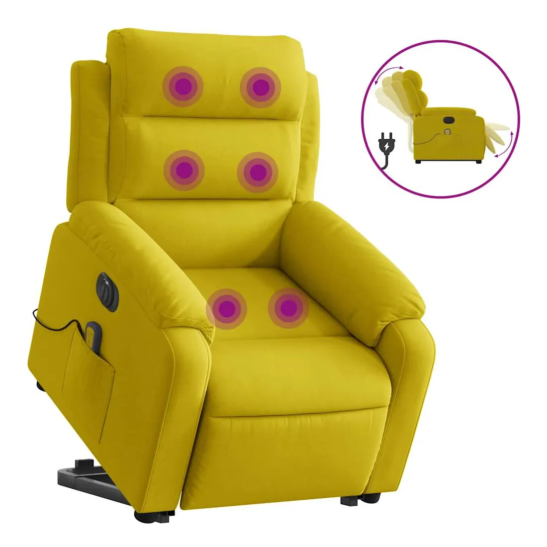 vidaXLAsseyez-vous et détendez-vous dans ce fauteuil inclinable de massage électrique très confortable ! Fonction de levage électrique : ce fauteuil inclinable pour personnes âgées est équipé d'un moteur électrique pour la fonction de levage. Grâce à la fonction qui pousse toute la chaise vers le haut, vous pouvez facilement vous tenir debout sans stresser votre dos et vos genoux en appuyant simplement sur le bouton.Fonction d'inclinaison électrique : ce fauteuil inclinable est également équipé d'un moteur électrique qui permet de régler automatiquement le repose-pied et le dossier dans n'importe quelle position, selon votre confort, en appuyant simplement sur le bouton situé sur le côté du fauteuil. Cette fonction permet une inclinaison maximale de 135 degrés. En outre, le dossier peut revenir automatiquement à sa position d'origine par une simple pression sur le bouton.Fonction de vibration : les 6 points de massage vous permettent de faire l'expérience d'un massage mieux ciblé. De plus, la télécommande incluse vous permet de choisir différents programmes de massage. La fonction de massage est alimentée par le connecteur USB qui nécessite une source d'alimentation USB certifiée de 5 V (non fournie).Expérience d'assise confortable : le siège, le dossier et les larges accoudoirs rembourrés épais recouverts de velours procurent une sensation confortable et chaleureuse, vous faisant vous sentir enlacé lorsque vous êtes assis. Le velours est un tissu doux et confortable qui est agréable sur la peau.Poche latérale pratique : ce fauteuil est doté d'une poche latérale pour ranger votre télécommande ou garder vos objets essentiels à portée de main.Cadre solide et stable : le cadre en bois et en métal offre une structure solide et une grande stabilité. Ce fauteuil inclinable est confortable et durable.