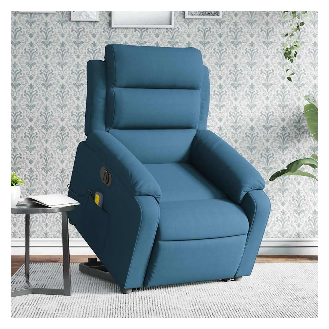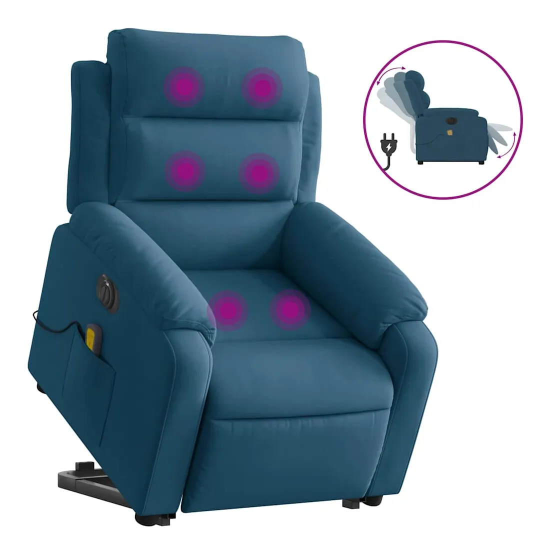 Asseyez-vous et détendez-vous dans ce fauteuil inclinable de massage électrique très confortable ! Fonction de levage électrique : ce fauteuil inclinable pour personnes âgées est équipé d'un moteur électrique pour la fonction de levage. Grâce à la fonction qui pousse toute la chaise vers le haut, vous pouvez facilement vous tenir debout sans stresser votre dos et vos genoux en appuyant simplement sur le bouton.Fonction d'inclinaison électrique : ce fauteuil inclinable est également équipé d'un moteur électrique qui permet de régler automatiquement le repose-pied et le dossier dans n'importe quelle position, selon votre confort, en appuyant simplement sur le bouton situé sur le côté du fauteuil. Cette fonction permet une inclinaison maximale de 135 degrés. En outre, le dossier peut revenir automatiquement à sa position d'origine par une simple pression sur le bouton.Fonction de vibration : les 6 points de massage vous permettent de faire l'expérience d'un massage mieux ciblé. De plus, la télécommande incluse vous permet de choisir différents programmes de massage. La fonction de massage est alimentée par le connecteur USB qui nécessite une source d'alimentation USB certifiée de 5 V (non fournie).Expérience d'assise confortable : le siège, le dossier et les larges accoudoirs rembourrés épais recouverts de velours procurent une sensation confortable et chaleureuse, vous faisant vous sentir enlacé lorsque vous êtes assis. Le velours est un tissu doux et confortable qui est agréable sur la peau.Poche latérale pratique : ce fauteuil est doté d'une poche latérale pour ranger votre télécommande ou garder vos objets essentiels à portée de main.Cadre solide et stable : le cadre en bois et en métal offre une structure solide et une grande stabilité. Ce fauteuil inclinable est confortable et durable.