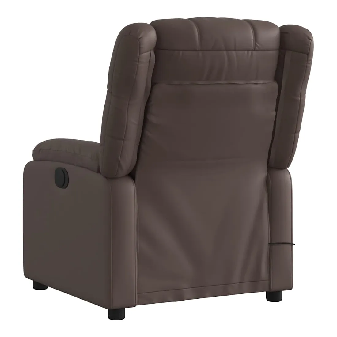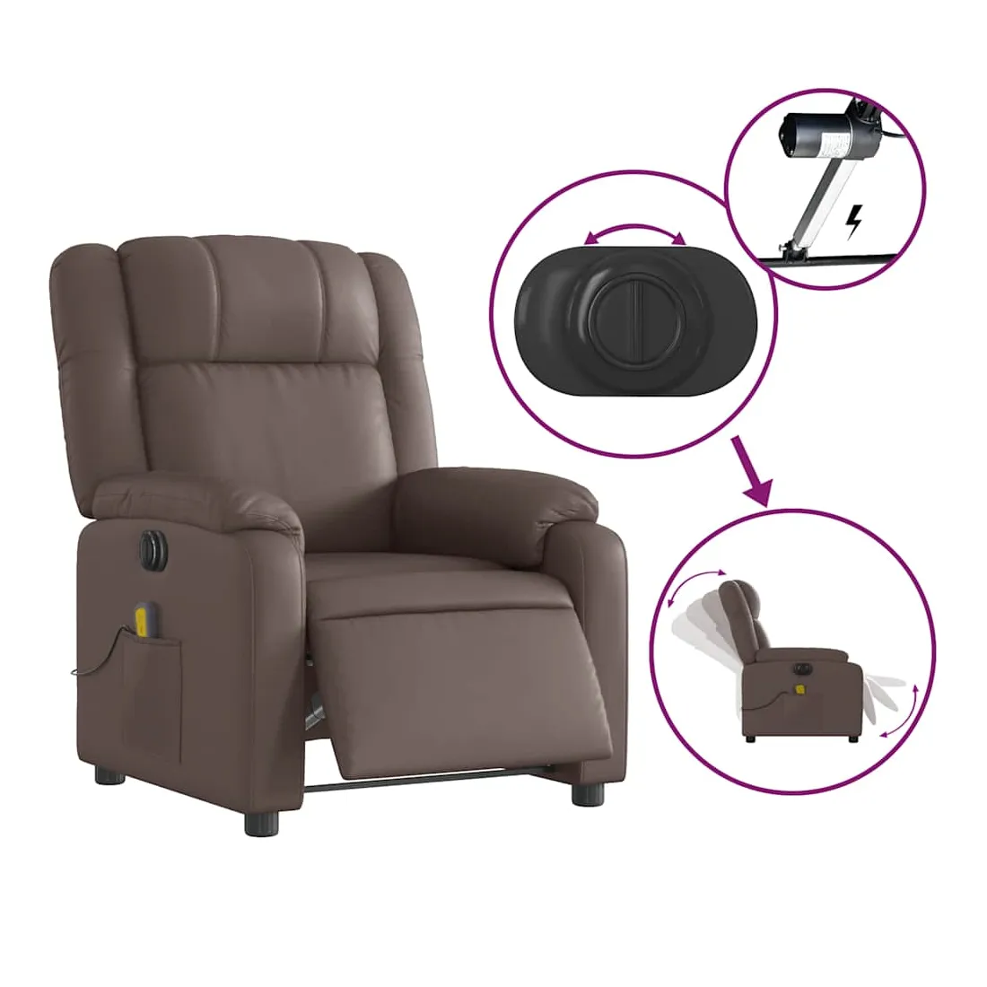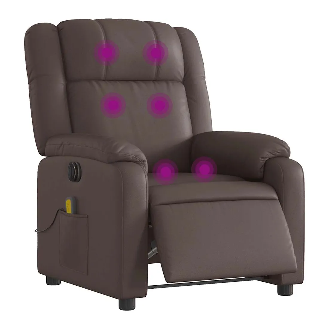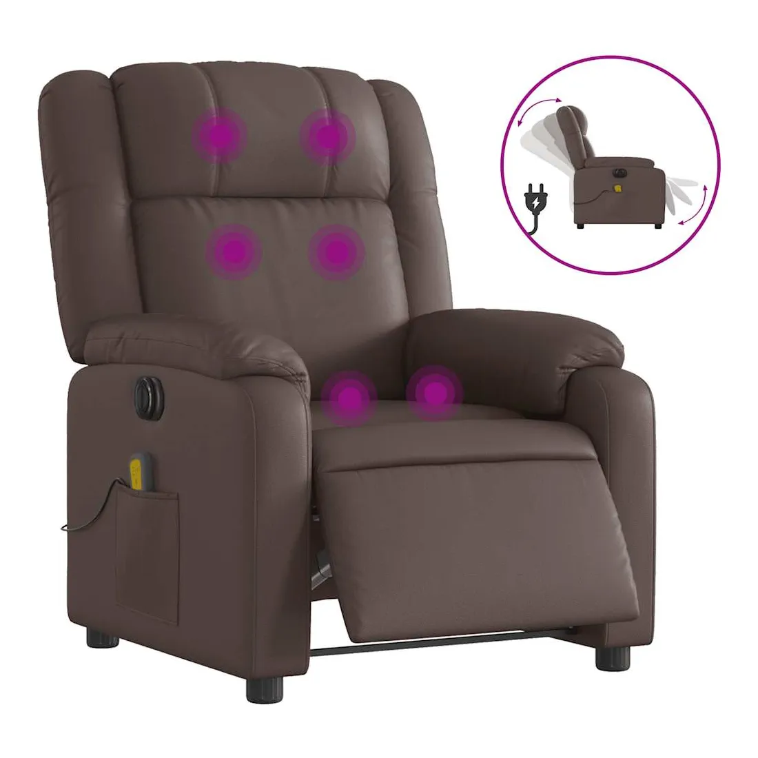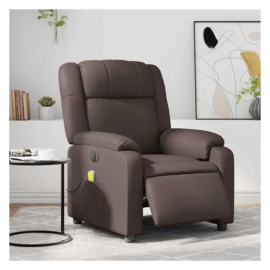 Asseyez-vous et détendez-vous dans ce fauteuil inclinable de massage électrique très confortable ! Fonction d'inclinaison électrique : ce fauteuil inclinable est équipé d'un moteur électrique qui permet de régler automatiquement le repose-pied et le dossier dans n'importe quelle position, selon votre confort, en appuyant simplement sur le bouton situé sur le côté du fauteuil. Cette fonction permet une inclinaison maximale de 135 degrés. En outre, le dossier peut revenir automatiquement à sa position d'origine par une simple pression sur le bouton.Fonction de vibration : les 6 points de massage vous permettent de faire l'expérience d'un massage mieux ciblé. De plus, la télécommande incluse vous permet de choisir différents programmes de massage. La fonction de massage est alimentée par le connecteur USB qui nécessite une source d'alimentation USB certifiée de 5 V (non fournie).Expérience de siège confortable : le siège, le dossier et les larges accoudoirs rembourrés épais recouverts de similicuir procurent une sensation confortable et chaleureuse, vous faisant vous sentir enlacé lorsque vous êtes assis. Le simili cuir est un matériau très résistant. Il est résistant aux taches, ce qui le rend facile à nettoyer avec un chiffon humide. La surface lisse donne également un aspect luxueux et la beauté du cuir véritable.Poche latérale pratique : ce fauteuil est doté d'une poche latérale pour ranger votre télécommande ou garder vos objets essentiels à portée de main.Cadre solide et stable : le cadre en bois et en métal offre une structure solide et une grande stabilité. Ce fauteuil inclinable est confortable et durable.