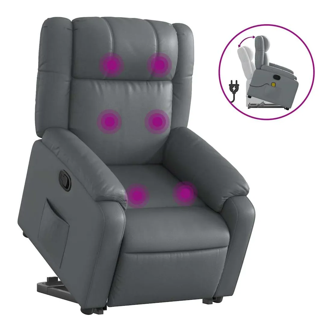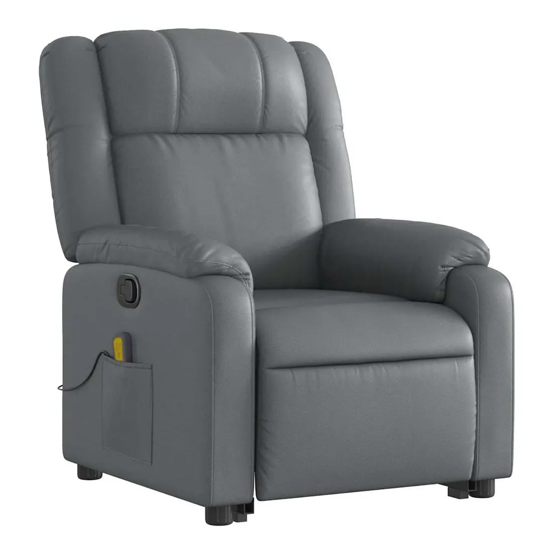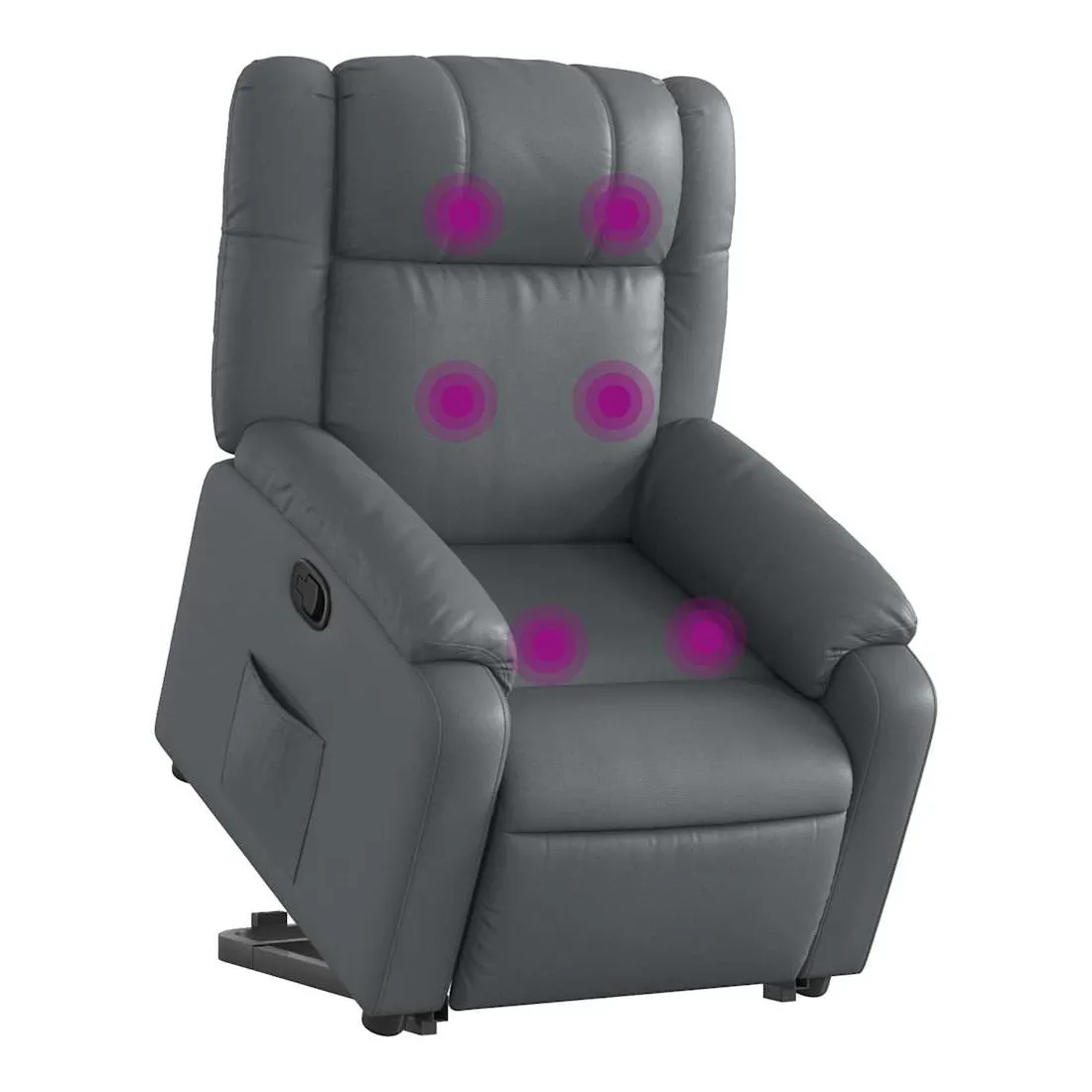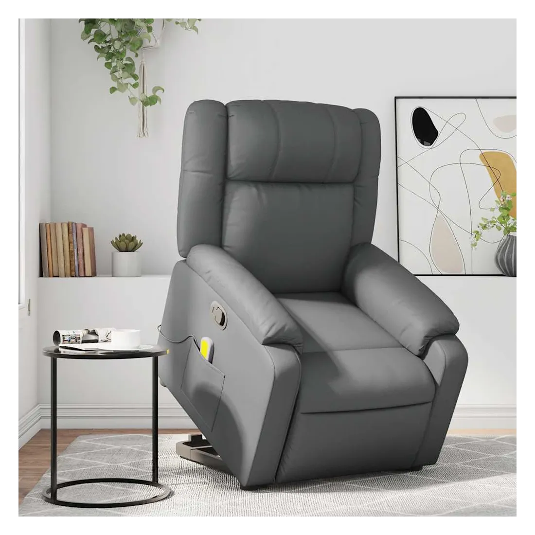Asseyez-vous et détendez-vous dans ce fauteuil inclinable de massage très confortable ! Fonction de levage électrique : ce fauteuil inclinable pour personnes âgées est équipé d'un moteur électrique pour la fonction de levage. Grâce à la fonction qui pousse toute la chaise vers le haut, vous pouvez facilement vous tenir debout sans stresser votre dos et vos genoux en appuyant simplement sur le bouton.Fonction d'inclinaison manuelle : ce fauteuil inclinable est doté d'une poignée du côté droit. Vous pouvez régler manuellement le repose-pieds et le dossier dans n'importe quelle position selon votre confort en tirant simplement sur la poignée. Cette fonction permet une inclinaison maximale de 135 degrés. De plus, le dossier peut revenir rapidement à sa position d'origine en tirant simplement sur la poignée.Fonction de vibration : les 6 points de massage vous permettent de faire l'expérience d'un massage mieux ciblé. De plus, la télécommande incluse vous permet de choisir différents programmes de massage. La fonction de massage est alimentée par le connecteur USB qui nécessite une source d'alimentation USB certifiée de 5 V (non fournie).Expérience de siège confortable : le siège, le dossier et les larges accoudoirs rembourrés épais recouverts de similicuir procurent une sensation confortable et chaleureuse, vous faisant vous sentir enlacé lorsque vous êtes assis. Le simili cuir est un matériau très résistant. Il est résistant aux taches, ce qui le rend facile à nettoyer avec un chiffon humide. La surface lisse donne également un aspect luxueux et la beauté du cuir véritable.Poche latérale pratique : ce fauteuil est doté d'une poche latérale pour ranger votre télécommande ou garder vos objets essentiels à portée de main.Cadre solide et stable : le cadre en bois et en métal offre une structure solide et une grande stabilité. Ce fauteuil inclinable est confortable et durable.
