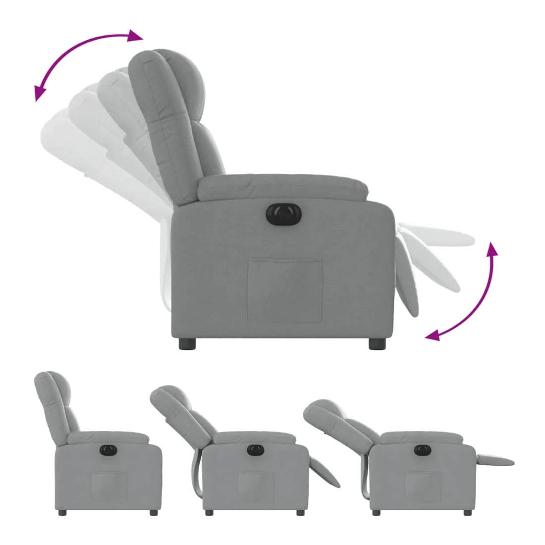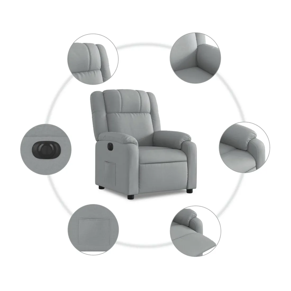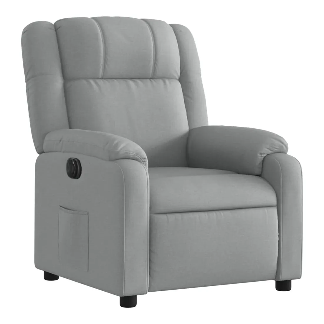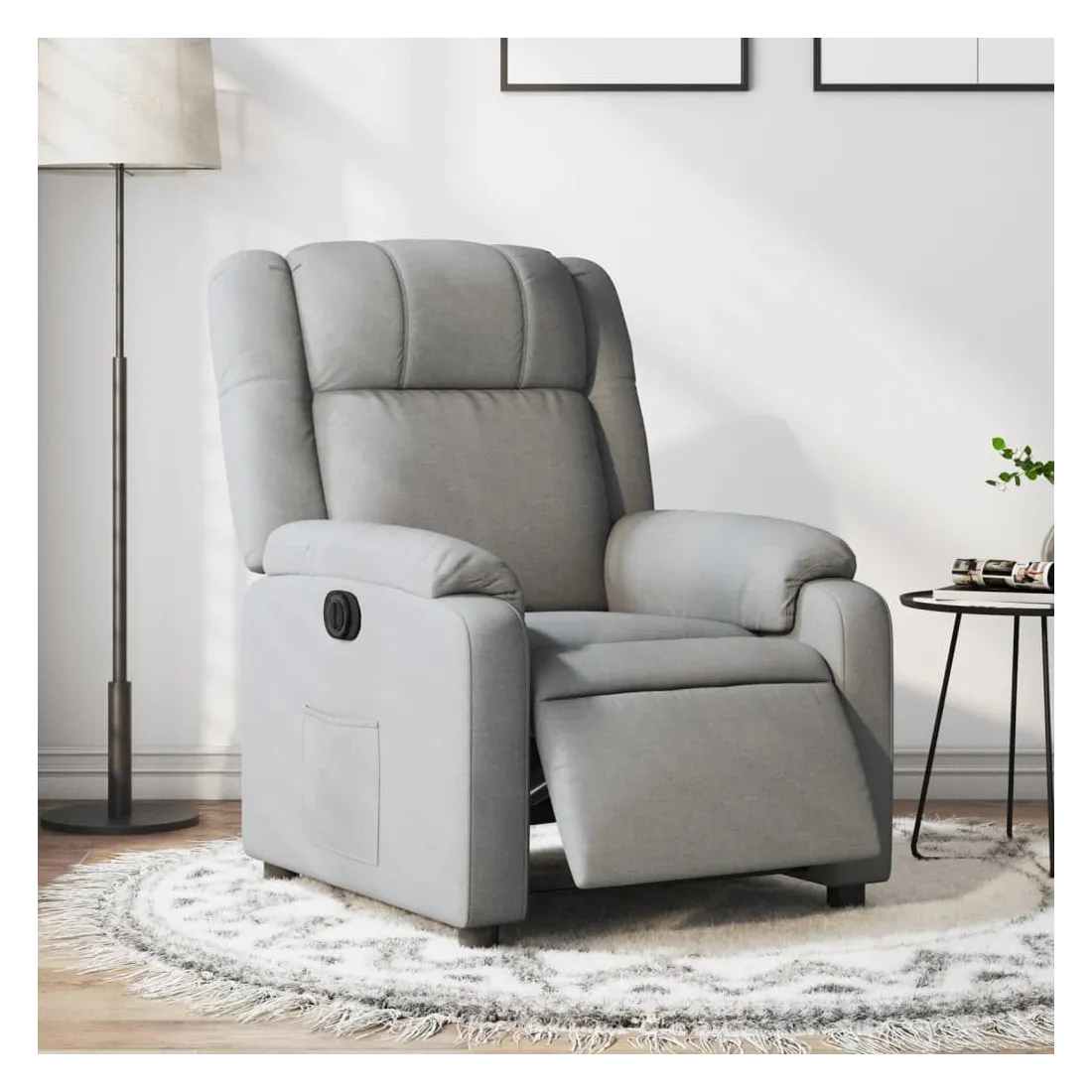 Asseyez-vous et détendez-vous dans ce fauteuil inclinable électrique très confortable ! Fonction d'inclinaison électrique : ce fauteuil inclinable est équipé d'un moteur électrique qui permet de régler automatiquement le repose-pied et le dossier dans n'importe quelle position, selon votre confort, en appuyant simplement sur le bouton situé sur le côté du fauteuil. Cette fonction permet une inclinaison maximale de 135 degrés. En outre, le dossier peut revenir automatiquement à sa position d'origine par une simple pression sur le bouton.Expérience d'assise confortable : le siège, le dossier et les larges accoudoirs bien rembourrés recouverts de tissu procurent une sensation confortable et chaleureuse, vous permettant de vous sentir enveloppé lorsque vous êtes assis. Le tissu présente un aspect simple et épuré et est respirant et durable.Poche latérale pratique : ce fauteuil est doté d'une poche latérale pour vous permettre de garder vos objets essentiels à portée de main.Cadre solide et stable : le cadre en bois et en métal offre une structure solide et une grande stabilité. Ce fauteuil inclinable est confortable et durable.