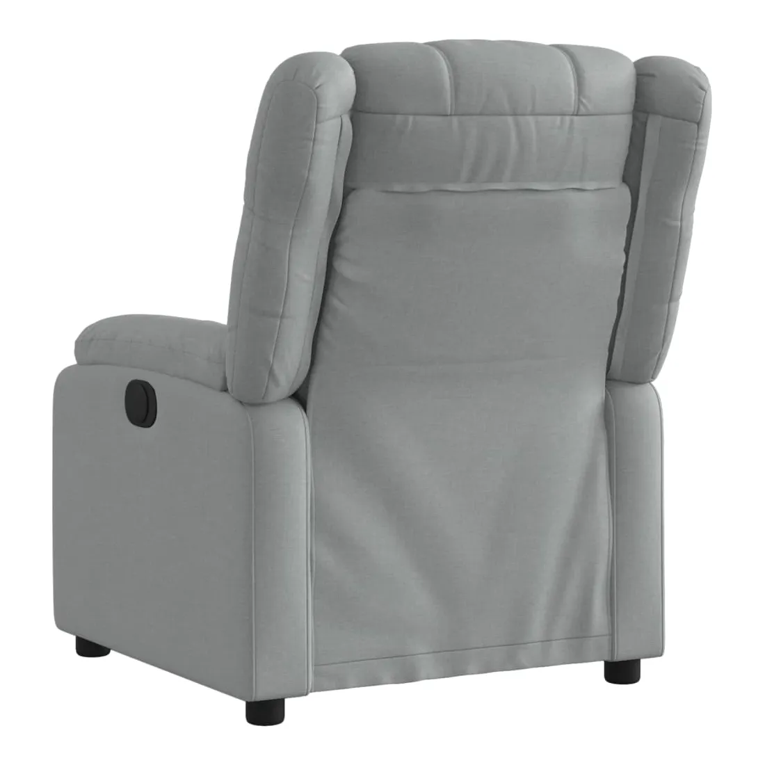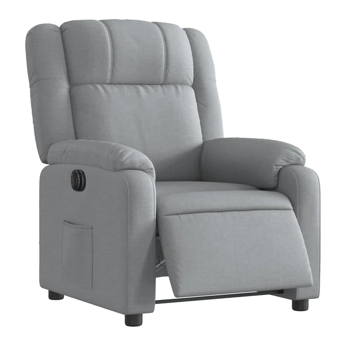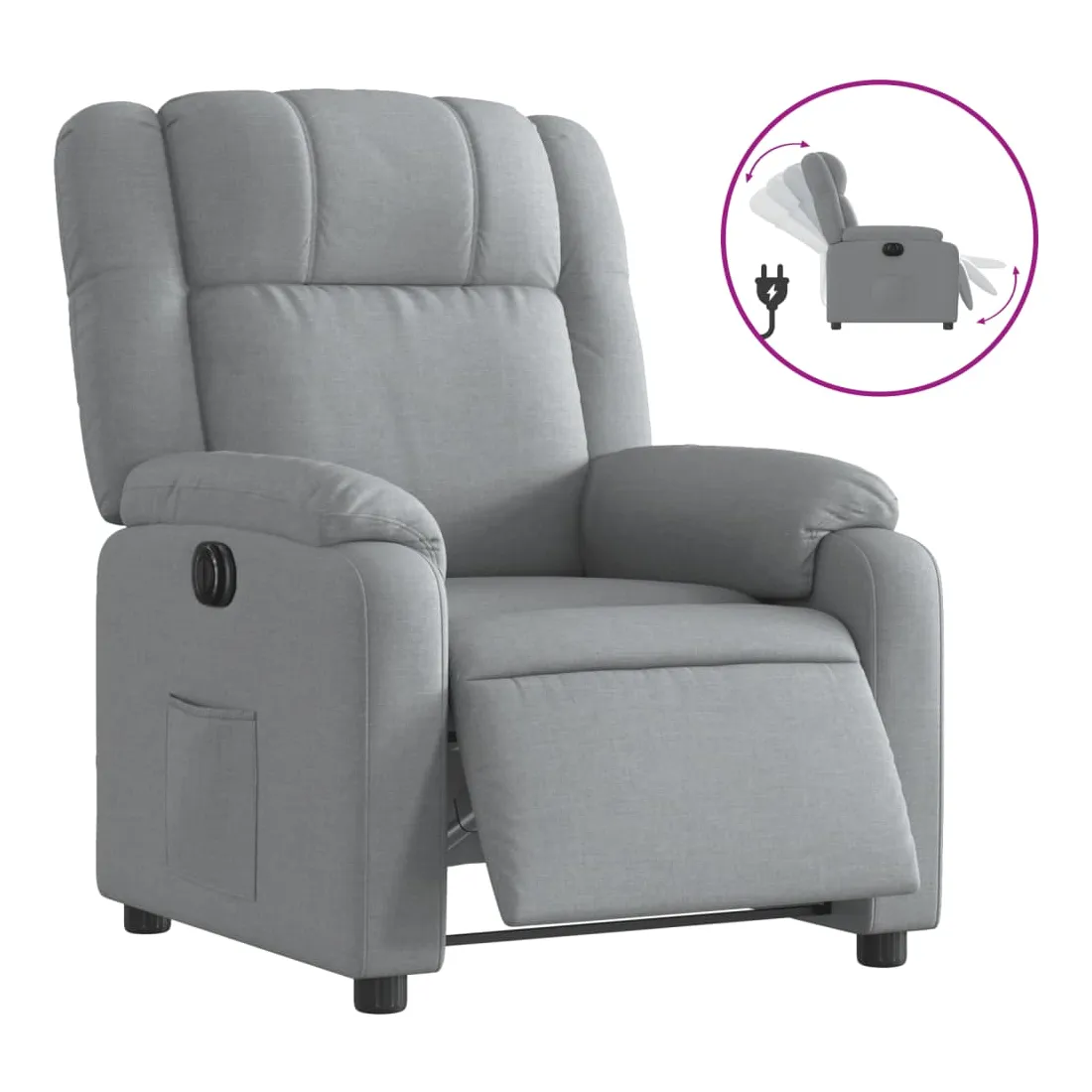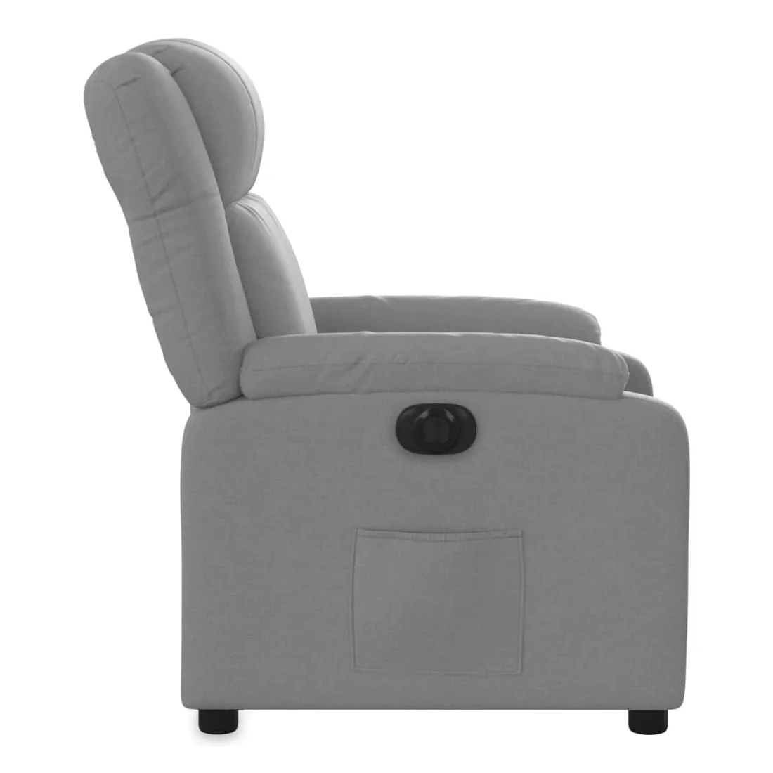 Asseyez-vous et détendez-vous dans ce fauteuil inclinable électrique très confortable ! Fonction d'inclinaison électrique : ce fauteuil inclinable est équipé d'un moteur électrique qui permet de régler automatiquement le repose-pied et le dossier dans n'importe quelle position, selon votre confort, en appuyant simplement sur le bouton situé sur le côté du fauteuil. Cette fonction permet une inclinaison maximale de 135 degrés. En outre, le dossier peut revenir automatiquement à sa position d'origine par une simple pression sur le bouton.Expérience d'assise confortable : le siège, le dossier et les larges accoudoirs bien rembourrés recouverts de tissu procurent une sensation confortable et chaleureuse, vous permettant de vous sentir enveloppé lorsque vous êtes assis. Le tissu présente un aspect simple et épuré et est respirant et durable.Poche latérale pratique : ce fauteuil est doté d'une poche latérale pour vous permettre de garder vos objets essentiels à portée de main.Cadre solide et stable : le cadre en bois et en métal offre une structure solide et une grande stabilité. Ce fauteuil inclinable est confortable et durable.