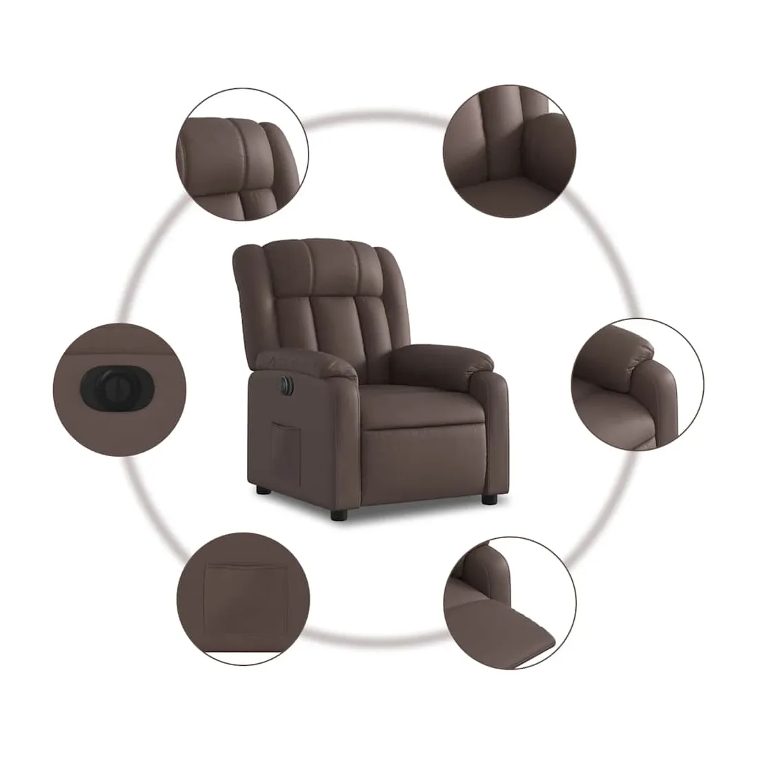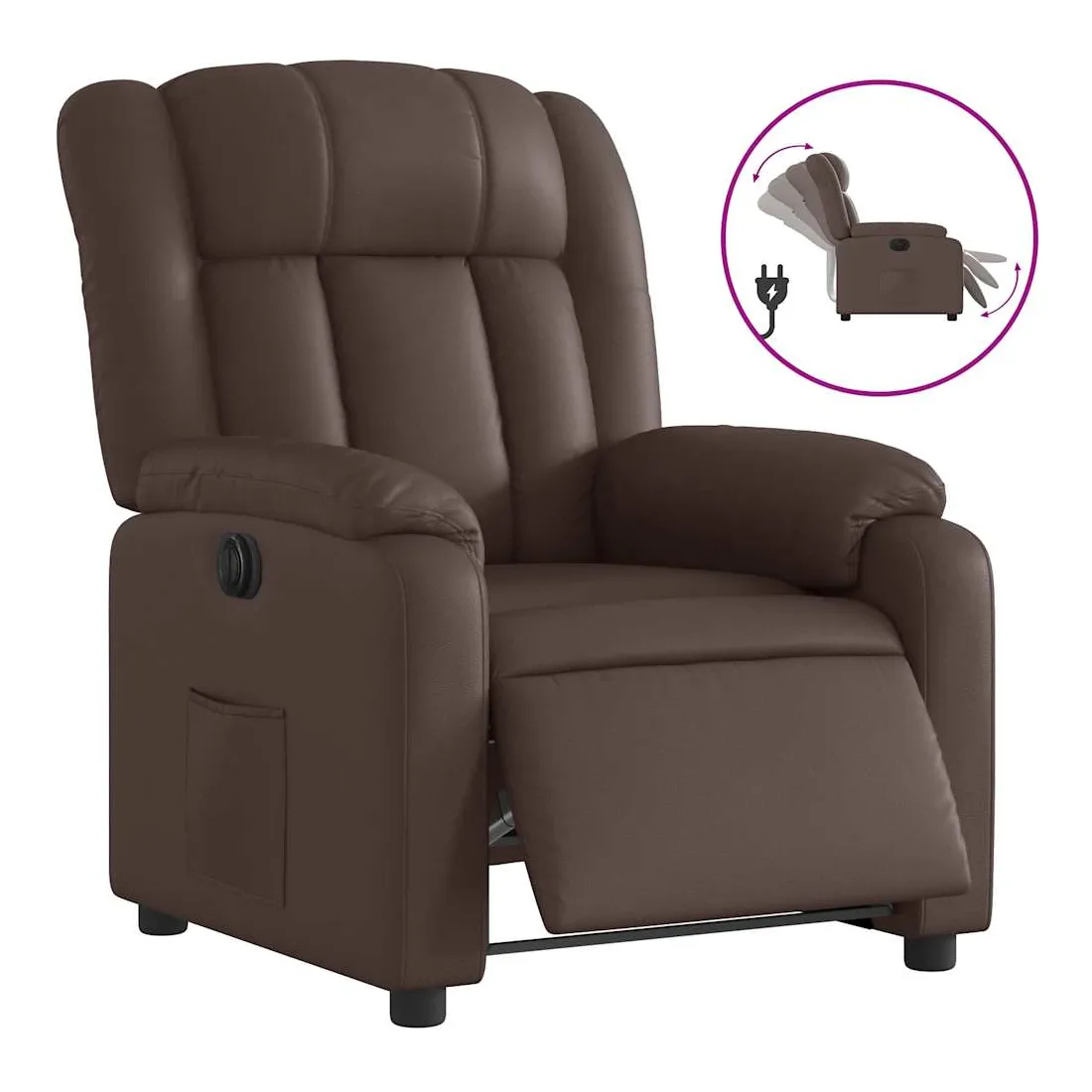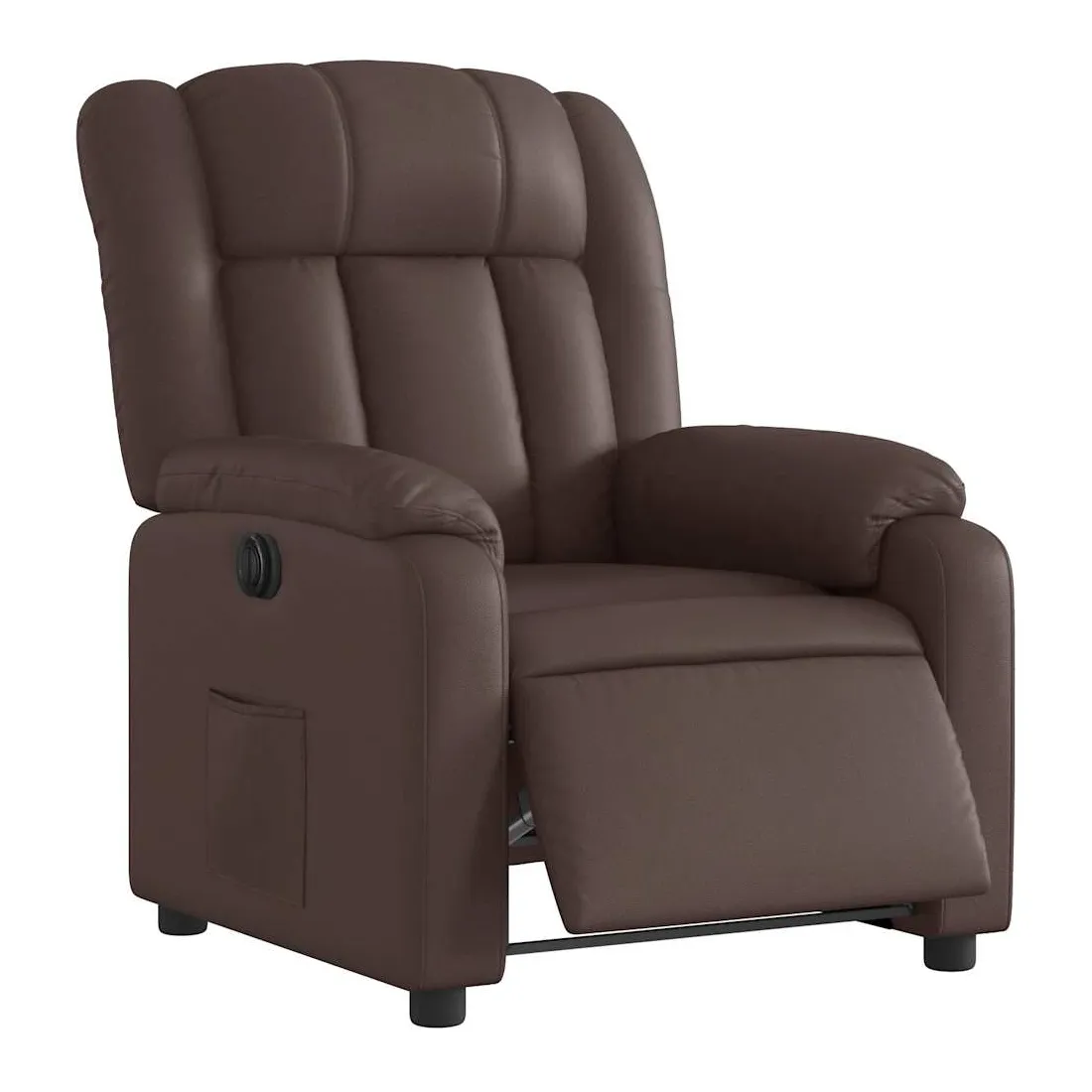 Asseyez-vous et détendez-vous dans ce fauteuil inclinable électrique très confortable ! Fonction d'inclinaison électrique : ce fauteuil inclinable est équipé d'un moteur électrique qui permet de régler automatiquement le repose-pied et le dossier dans n'importe quelle position, selon votre confort, en appuyant simplement sur le bouton situé sur le côté du fauteuil. Cette fonction permet une inclinaison maximale de 135 degrés. En outre, le dossier peut revenir automatiquement à sa position d'origine par une simple pression sur le bouton.Expérience de siège confortable : le siège, le dossier et les larges accoudoirs rembourrés épais recouverts de similicuir procurent une sensation confortable et chaleureuse, vous faisant vous sentir enlacé lorsque vous êtes assis. Le simili cuir est un matériau très résistant. Il est résistant aux taches, ce qui le rend facile à nettoyer avec un chiffon humide. La surface lisse donne également un aspect luxueux et la beauté du cuir véritable.Poche latérale pratique : ce fauteuil est doté d'une poche latérale pour vous permettre de garder vos objets essentiels à portée de main.Cadre solide et stable : le cadre en bois et en métal offre une structure solide et une grande stabilité. Ce fauteuil inclinable est confortable et durable.
