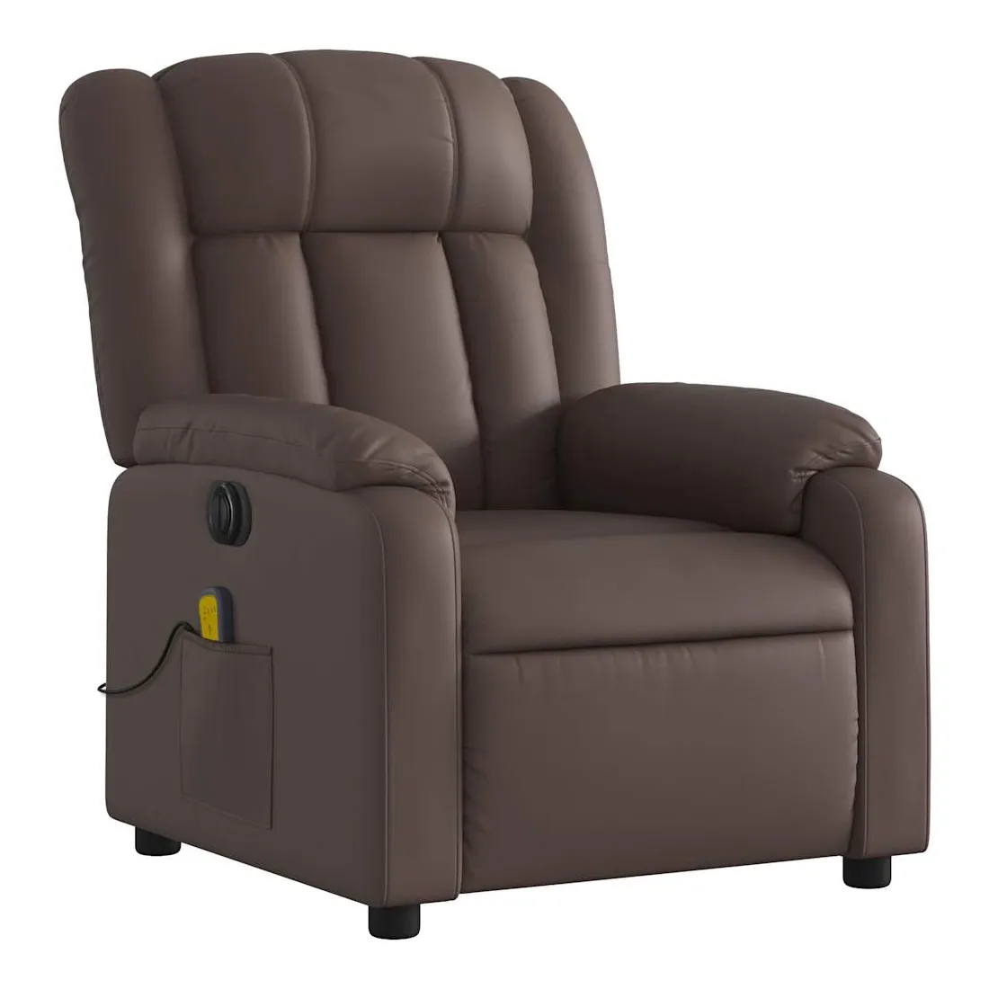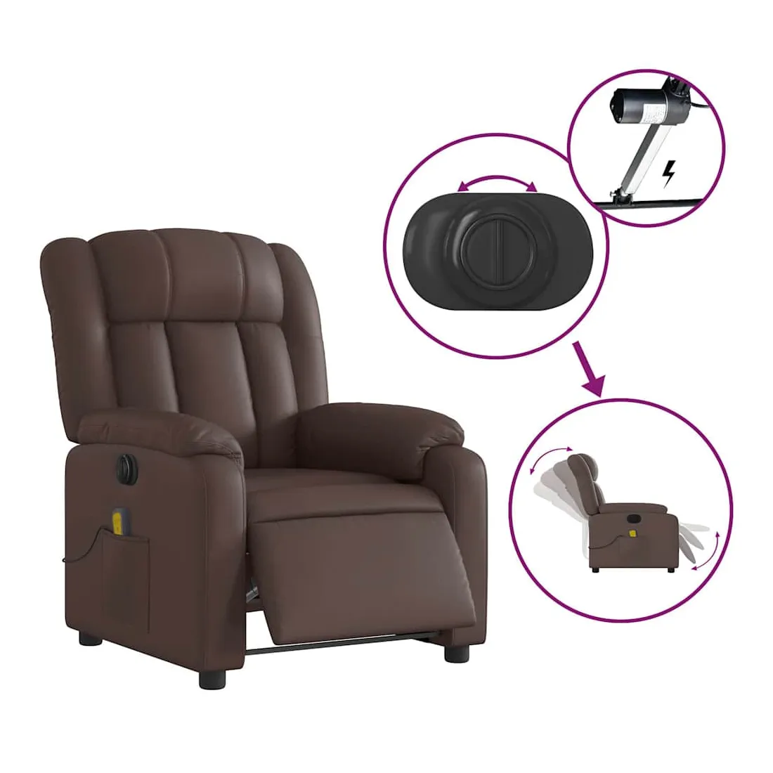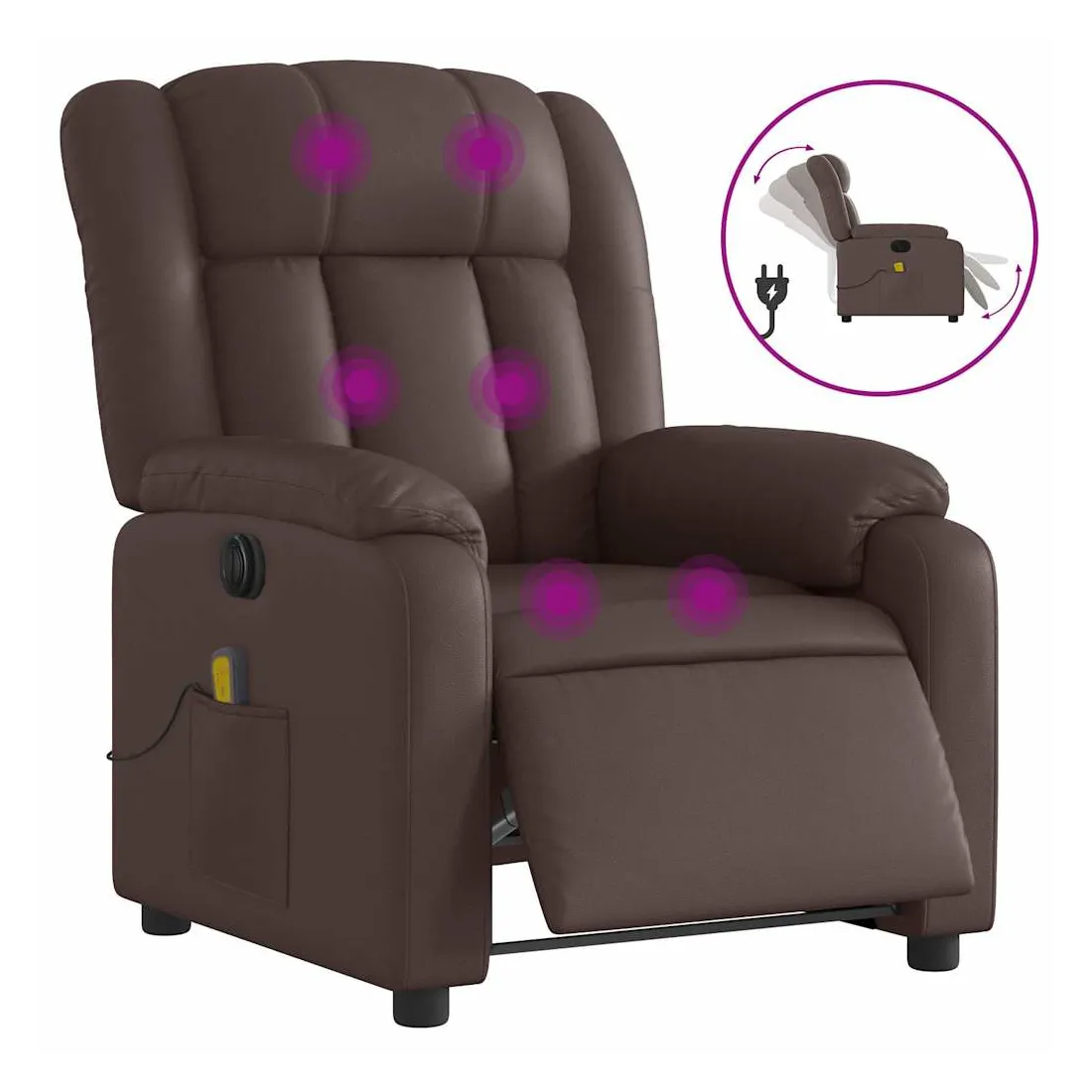 Asseyez-vous et détendez-vous dans ce fauteuil inclinable de massage électrique très confortable ! Fonction d'inclinaison électrique : ce fauteuil inclinable est équipé d'un moteur électrique qui permet de régler automatiquement le repose-pied et le dossier dans n'importe quelle position, selon votre confort, en appuyant simplement sur le bouton situé sur le côté du fauteuil. Cette fonction permet une inclinaison maximale de 135 degrés. En outre, le dossier peut revenir automatiquement à sa position d'origine par une simple pression sur le bouton.Fonction de vibration : les 6 points de massage vous permettent de faire l'expérience d'un massage mieux ciblé. De plus, la télécommande incluse vous permet de choisir différents programmes de massage. La fonction de massage est alimentée par le connecteur USB qui nécessite une source d'alimentation USB certifiée de 5 V (non fournie).Expérience de siège confortable : le siège, le dossier et les larges accoudoirs rembourrés épais recouverts de similicuir procurent une sensation confortable et chaleureuse, vous faisant vous sentir enlacé lorsque vous êtes assis. Le simili cuir est un matériau très résistant. Il est résistant aux taches, ce qui le rend facile à nettoyer avec un chiffon humide. La surface lisse donne également un aspect luxueux et la beauté du cuir véritable.Poche latérale pratique : ce fauteuil est doté d'une poche latérale pour ranger votre télécommande ou garder vos objets essentiels à portée de main.Cadre solide et stable : le cadre en bois et en métal offre une structure solide et une grande stabilité. Ce fauteuil inclinable est confortable et durable.