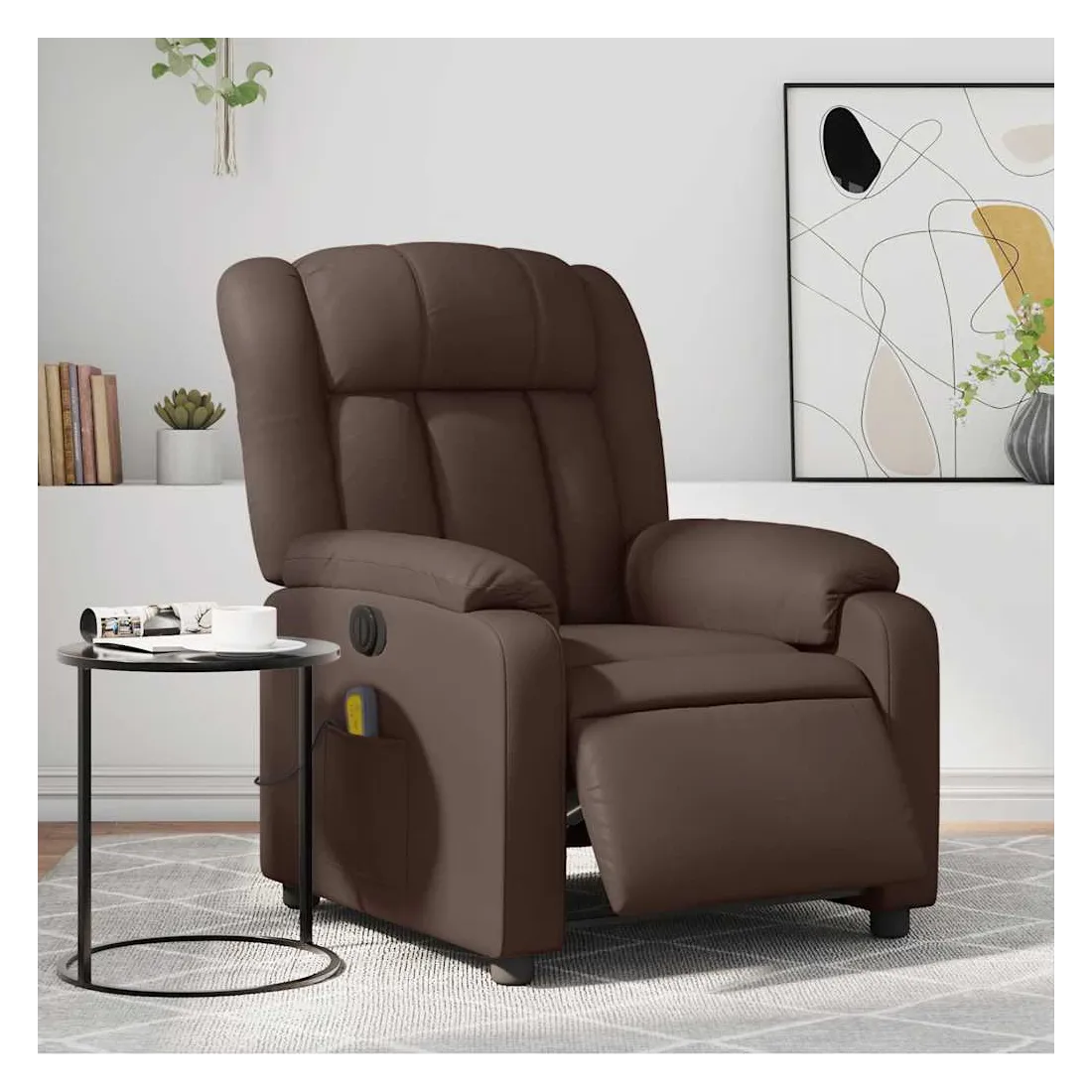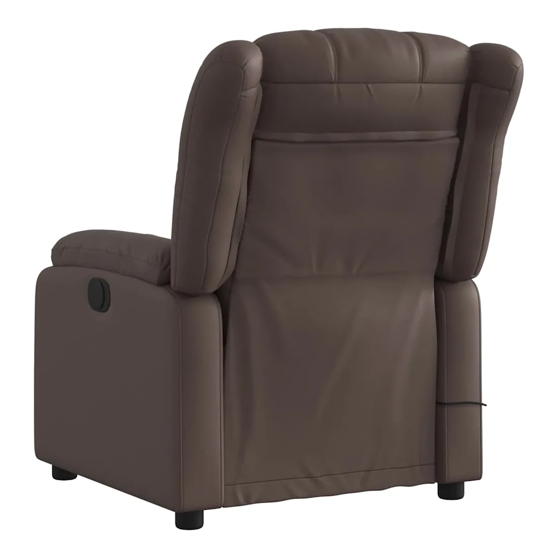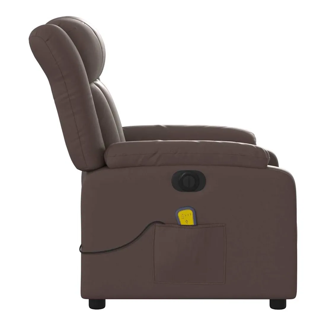Asseyez-vous et détendez-vous dans ce fauteuil inclinable de massage électrique très confortable ! Fonction d'inclinaison électrique : ce fauteuil inclinable est équipé d'un moteur électrique qui permet de régler automatiquement le repose-pied et le dossier dans n'importe quelle position, selon votre confort, en appuyant simplement sur le bouton situé sur le côté du fauteuil. Cette fonction permet une inclinaison maximale de 135 degrés. En outre, le dossier peut revenir automatiquement à sa position d'origine par une simple pression sur le bouton.Fonction de vibration : les 6 points de massage vous permettent de faire l'expérience d'un massage mieux ciblé. De plus, la télécommande incluse vous permet de choisir différents programmes de massage. La fonction de massage est alimentée par le connecteur USB qui nécessite une source d'alimentation USB certifiée de 5 V (non fournie).Expérience de siège confortable : le siège, le dossier et les larges accoudoirs rembourrés épais recouverts de similicuir procurent une sensation confortable et chaleureuse, vous faisant vous sentir enlacé lorsque vous êtes assis. Le simili cuir est un matériau très résistant. Il est résistant aux taches, ce qui le rend facile à nettoyer avec un chiffon humide. La surface lisse donne également un aspect luxueux et la beauté du cuir véritable.Poche latérale pratique : ce fauteuil est doté d'une poche latérale pour ranger votre télécommande ou garder vos objets essentiels à portée de main.Cadre solide et stable : le cadre en bois et en métal offre une structure solide et une grande stabilité. Ce fauteuil inclinable est confortable et durable.
