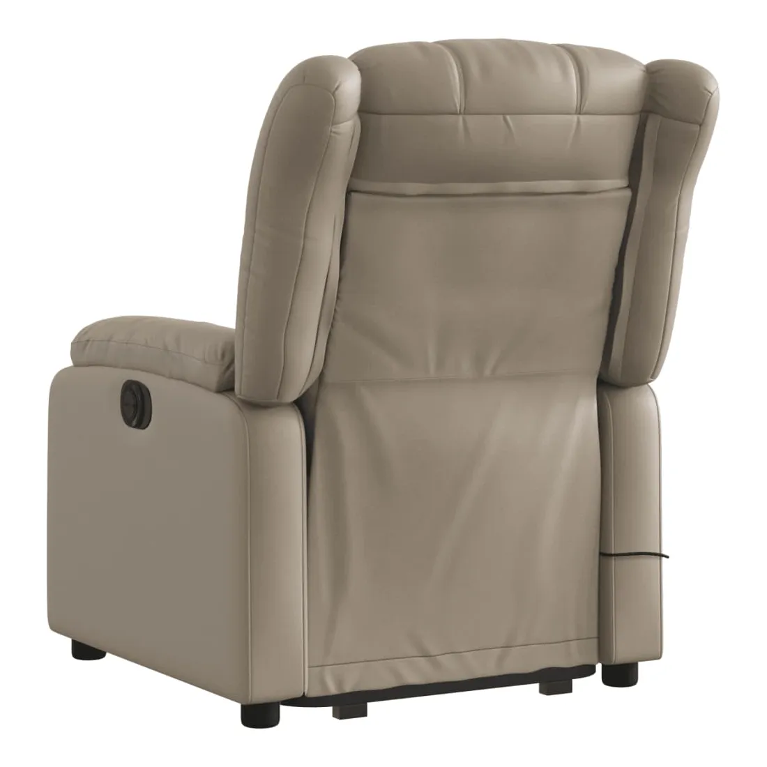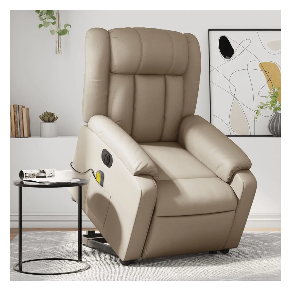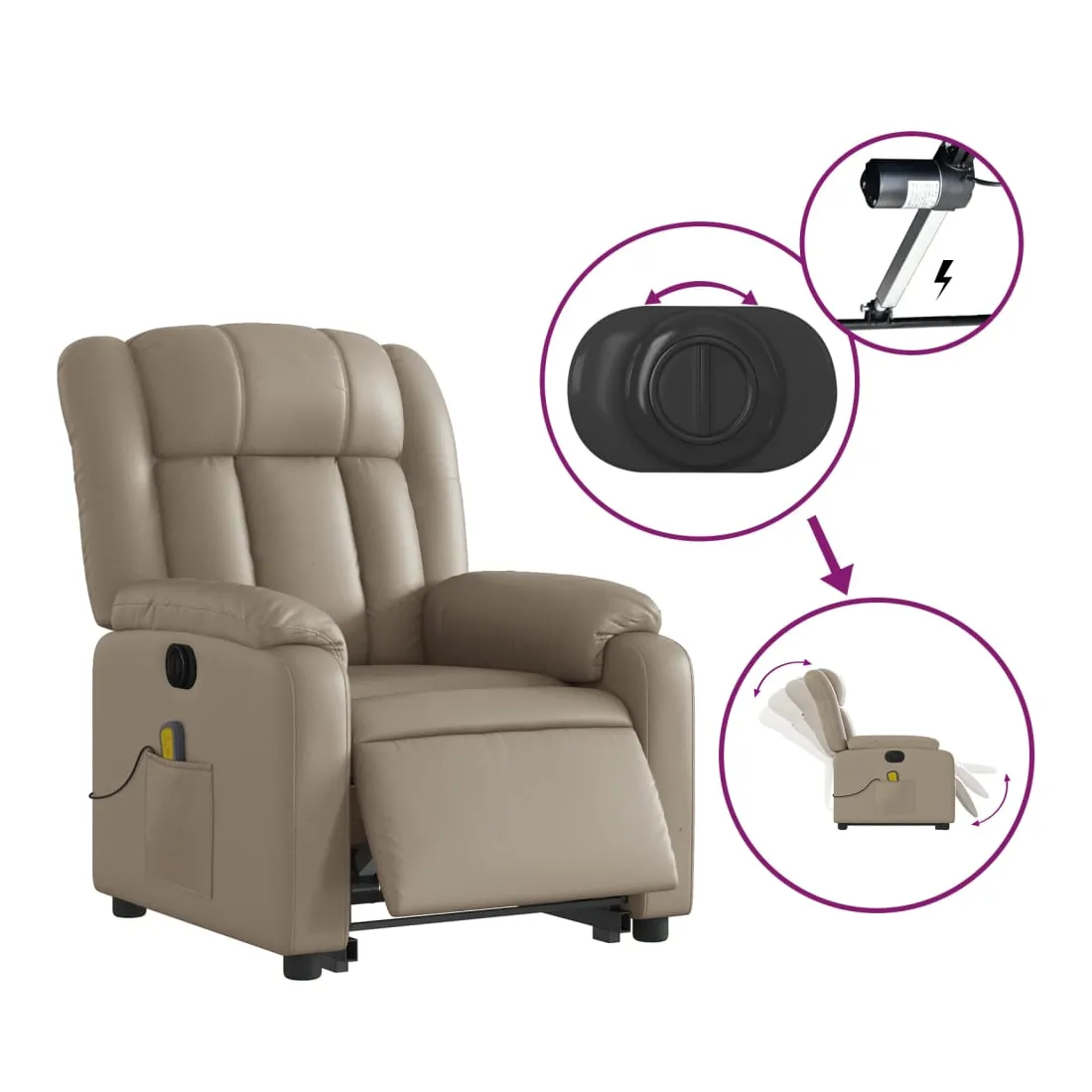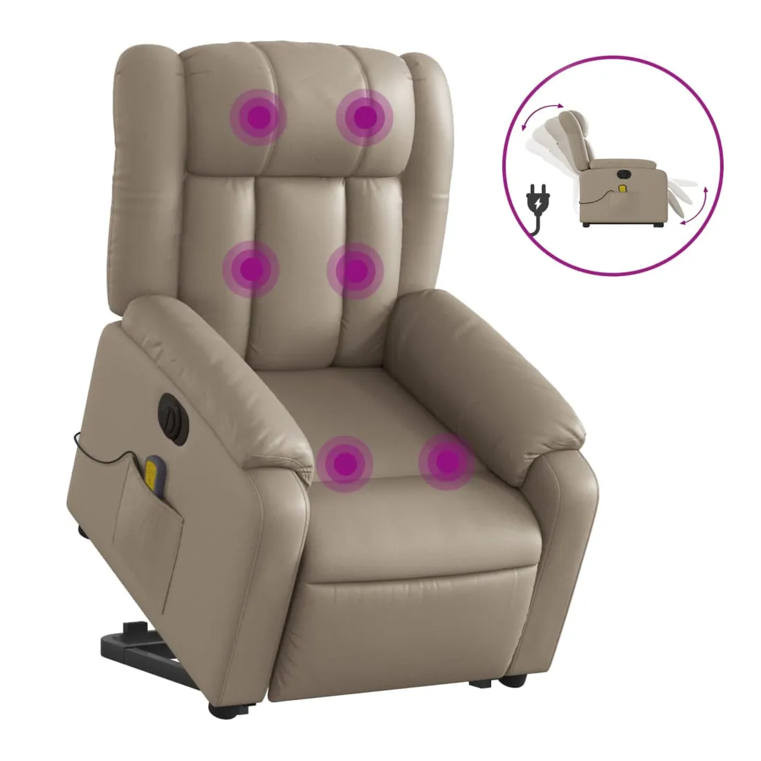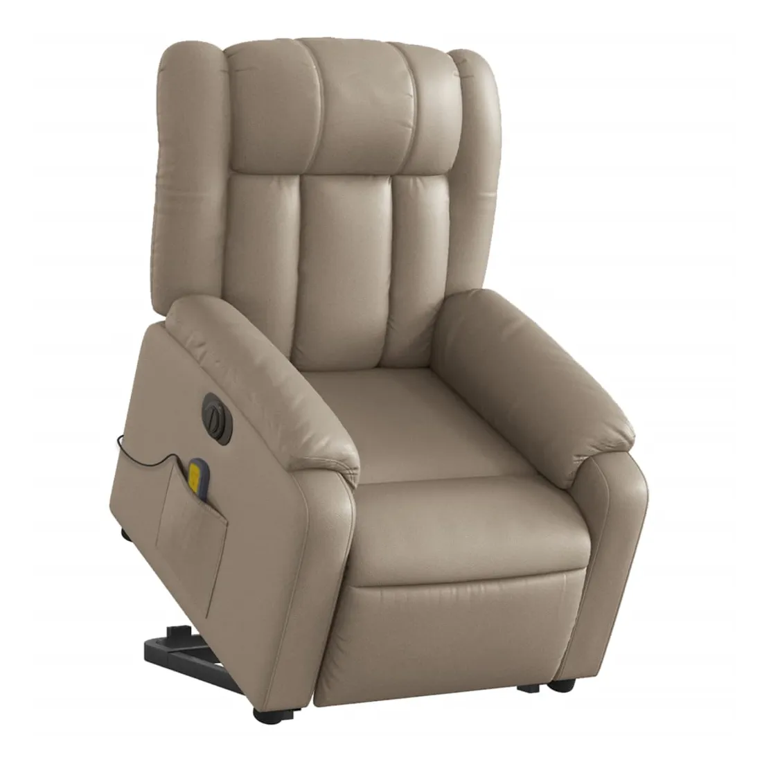 Asseyez-vous et détendez-vous dans ce fauteuil inclinable de massage électrique très confortable ! Fonction de levage électrique : ce fauteuil inclinable pour personnes âgées est équipé d'un moteur électrique pour la fonction de levage. Grâce à la fonction qui pousse toute la chaise vers le haut, vous pouvez facilement vous tenir debout sans stresser votre dos et vos genoux en appuyant simplement sur le bouton.Fonction d'inclinaison électrique : ce fauteuil inclinable est également équipé d'un moteur électrique qui permet de régler automatiquement le repose-pied et le dossier dans n'importe quelle position, selon votre confort, en appuyant simplement sur le bouton situé sur le côté du fauteuil. Cette fonction permet une inclinaison maximale de 135 degrés. En outre, le dossier peut revenir automatiquement à sa position d'origine par une simple pression sur le bouton.Fonction de vibration : les 6 points de massage vous permettent de faire l'expérience d'un massage mieux ciblé. De plus, la télécommande incluse vous permet de choisir différents programmes de massage. La fonction de massage est alimentée par le connecteur USB qui nécessite une source d'alimentation USB certifiée de 5 V (non fournie).Expérience de siège confortable : le siège, le dossier et les larges accoudoirs rembourrés épais recouverts de similicuir procurent une sensation confortable et chaleureuse, vous faisant vous sentir enlacé lorsque vous êtes assis. Le simili cuir est un matériau très résistant. Il est résistant aux taches, ce qui le rend facile à nettoyer avec un chiffon humide. La surface lisse donne également un aspect luxueux et la beauté du cuir véritable.Poche latérale pratique : ce fauteuil est doté d'une poche latérale pour ranger votre télécommande ou garder vos objets essentiels à portée de main.Cadre solide et stable : le cadre en bois et en métal offre une structure solide et une grande stabilité. Ce fauteuil inclinable est confortable et durable.