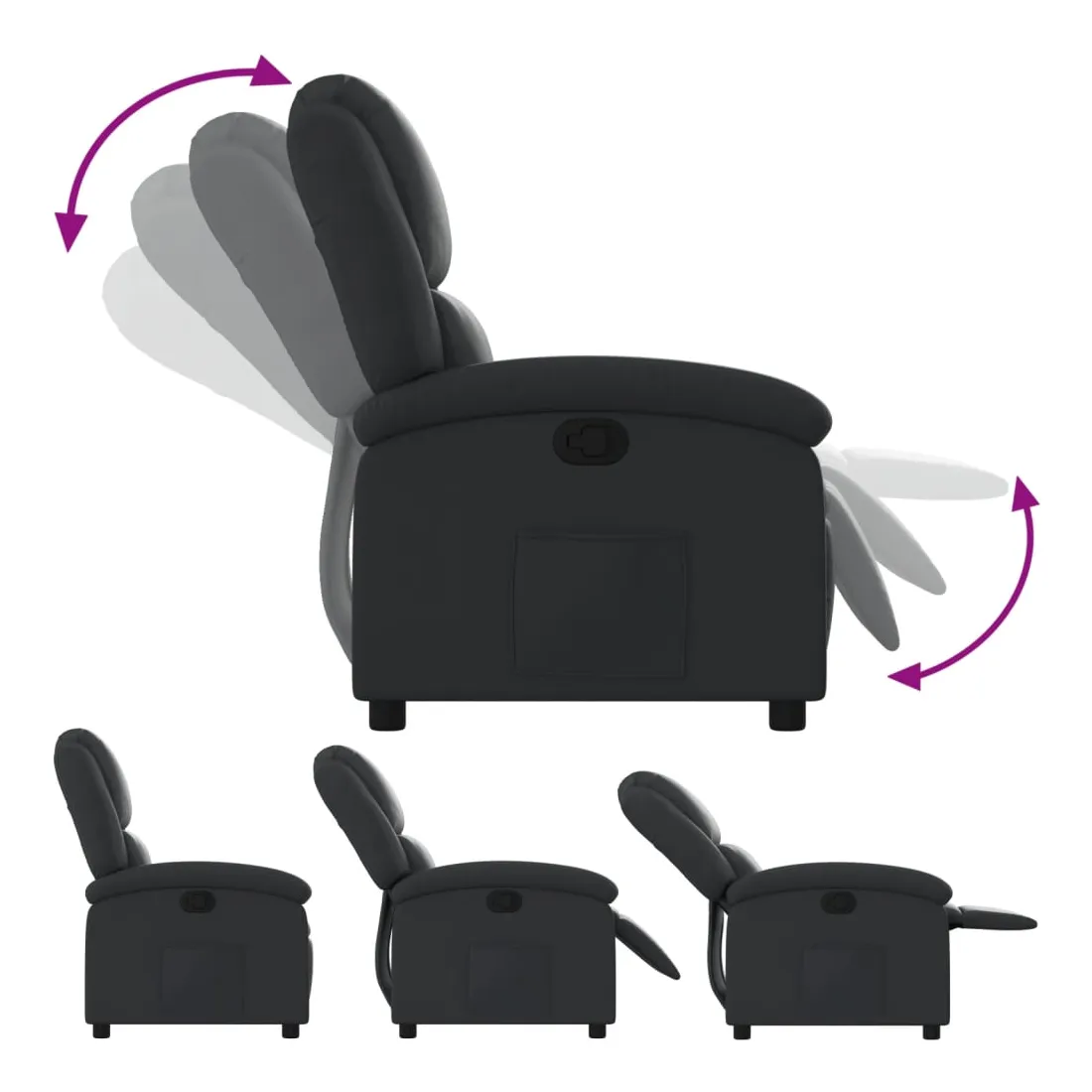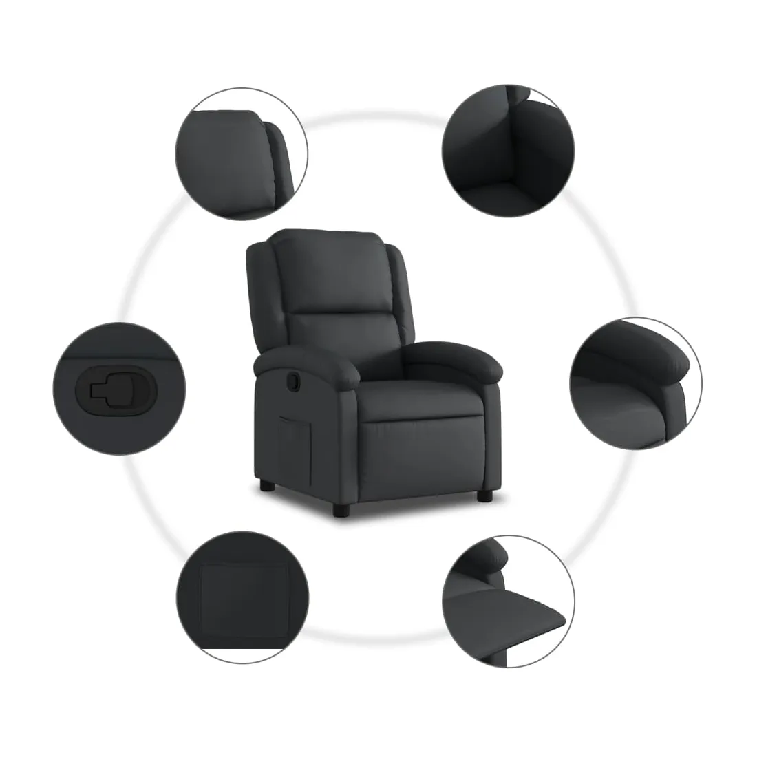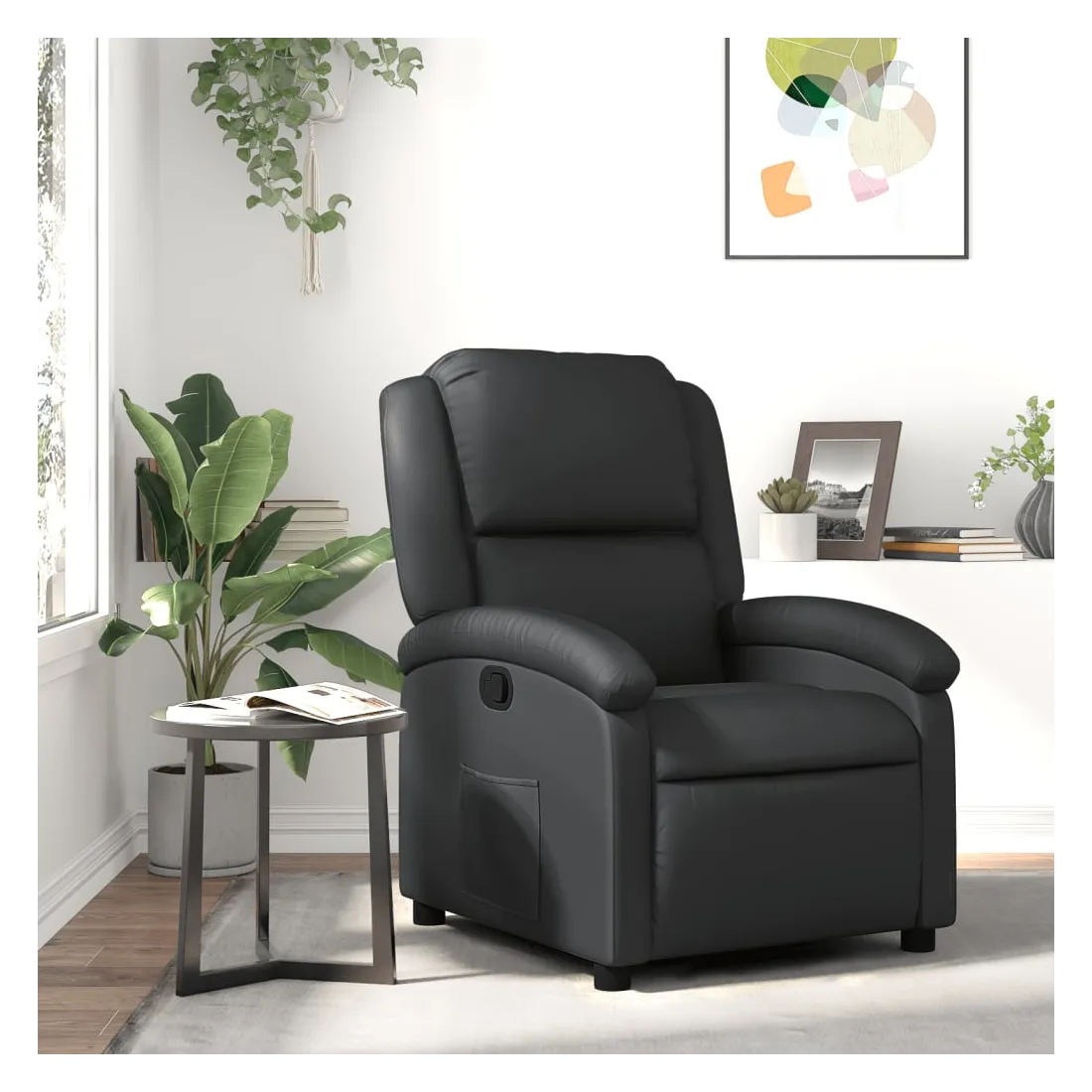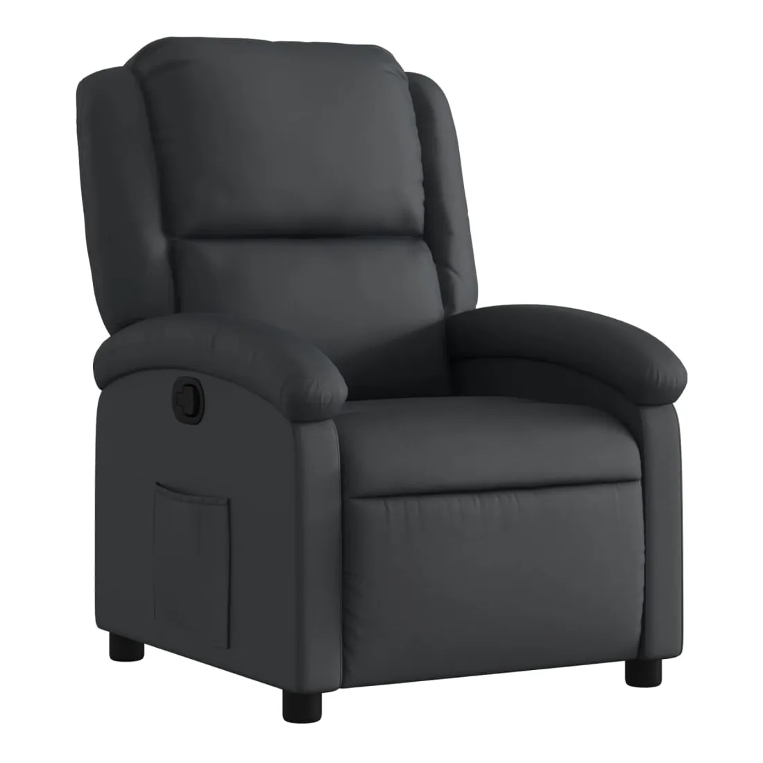 Asseyez-vous et détendez-vous dans ce fauteuil inclinable très confortable ! Fonction d'inclinaison manuelle : ce fauteuil inclinable est doté d'un bouton du côté droit. Vous pouvez régler manuellement le repose-pieds et le dossier dans n'importe quelle position selon votre confort en tirant simplement sur la poignée. Cette fonction permet une inclinaison maximale de 135 degrés. De plus, le dossier peut revenir rapidement à sa position d'origine en tirant simplement sur la poignée.Expérience de siège confortable : le siège, le dossier et les larges accoudoirs rembourrés épais recouverts de cuir véritable procurent une sensation confortable, vous faisant vous sentir enlacé lorsque vous êtes assis. Le cuir véritable est un matériau naturellement intemporel. Il peut durer toute une vie avec des soins et un entretien appropriés. La surface lisse lui donne également un aspect élégant tout en garantissant un confort optimal.Poche latérale pratique : ce fauteuil est doté d'une poche latérale pour vous permettre de garder vos objets essentiels à portée de main.Cadre solide et stable : le cadre en bois et en métal offre une structure solide et une grande stabilité. Ce fauteuil inclinable est confortable et durable.