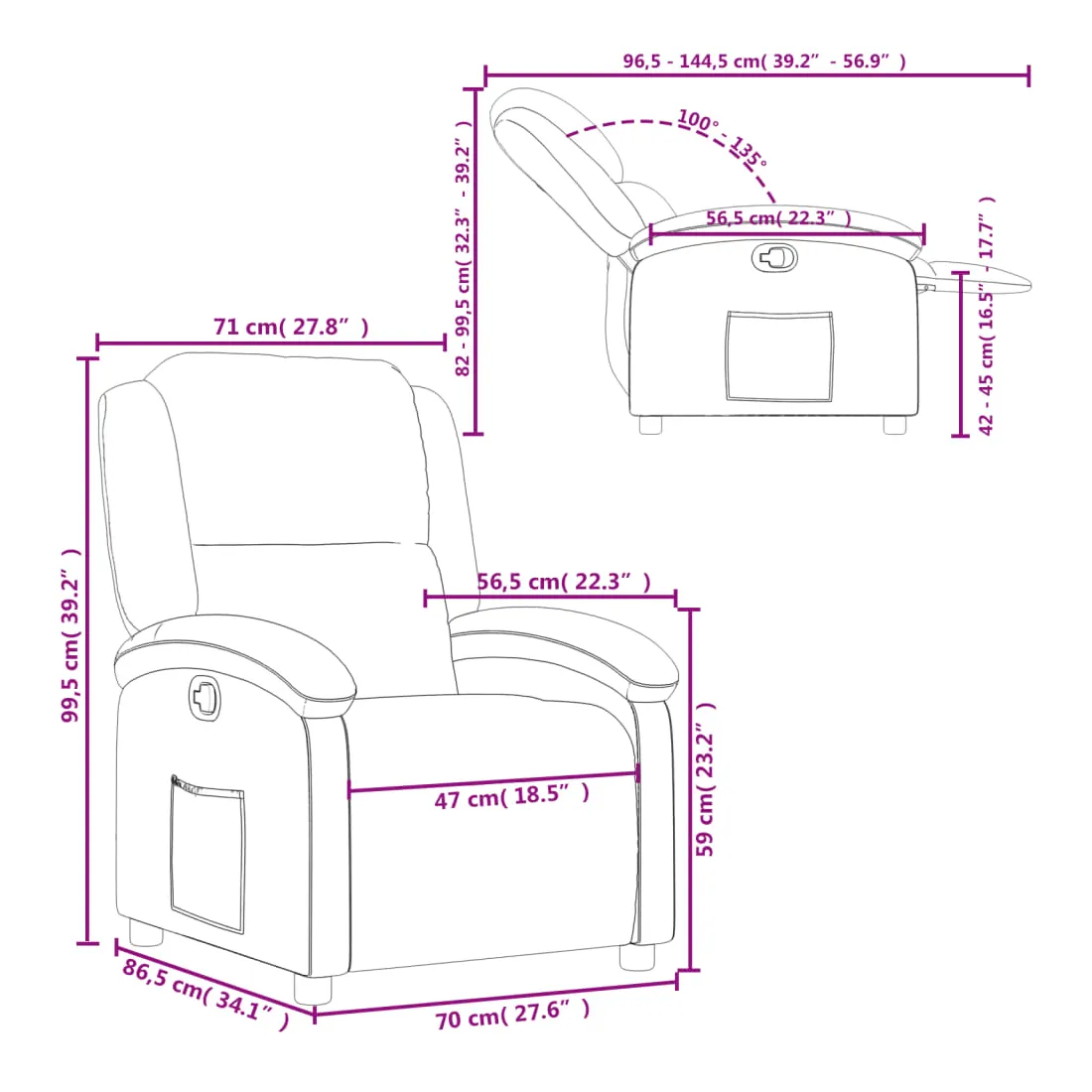 - Dimensions en position assise : 71 x 86,5 x 99,5 cm (l x P x H)