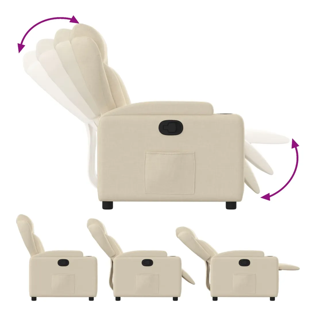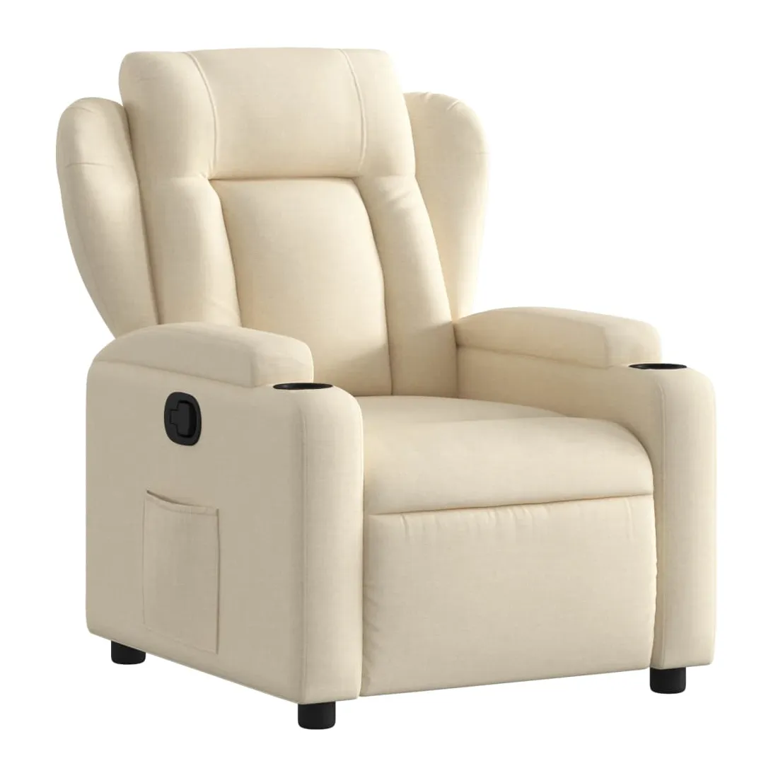 Asseyez-vous et laissez-vous emporter par ce fauteuil inclinable très confortable ! Fonction d'inclinaison manuelle : Ce fauteuil inclinable est doté d'un bouton sur le côté droit. Vous pouvez régler manuellement le repose-pieds et le dossier dans n'importe quelle position selon votre confort en tirant simplement sur la poignée. Cette fonction permet une inclinaison maximale de 135 degrés. De plus, le dossier peut revenir rapidement à sa position initiale en tirant facilement sur la poignée.Expérience d'assise confortable : L'assise, le dossier et les larges accoudoirs rembourrés et recouverts de tissu offrent une sensation de confort et de chaleur, vous donnant l'impression d'être bien installé. Le tissu présente un aspect simple et épuré, est respirant et durable.Porte-gobelets pratiques et poche latérale : Ce fauteuil est doté de deux porte-gobelets pratiques pour vos boissons et d'une poche latérale pour garder vos objets essentiels à portée de main.Cadre solide et stable : Le cadre en bois et en métal offre une structure solide et stable. Ce fauteuil inclinable est confortable et durable.