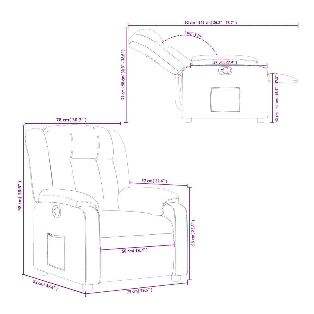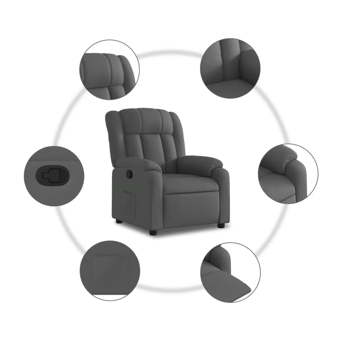 Asseyez-vous et laissez-vous emporter par ce fauteuil inclinable ultra-confortable ! Fonction d'inclinaison manuelle : Ce fauteuil inclinable est doté d'une poignée sur le côté droit. Vous pouvez régler manuellement le repose-pieds et le dossier à votre convenance d'une simple traction sur la poignée. Cette fonction permet une inclinaison maximale de 135 degrés. De plus, le dossier peut revenir rapidement à sa position initiale d'une simple traction sur la poignée.Assise confortable : L'assise, le dossier et les larges accoudoirs rembourrés et recouverts de tissu offrent une sensation de confort et de chaleur, vous permettant de vous sentir bien installé. Le tissu, au look simple et épuré, est respirant et durable.Poche latérale pratique : Ce fauteuil est doté d'une poche latérale pour garder vos objets essentiels à portée de main.Cadre solide et stable : Le cadre en bois et en métal offre une structure solide et stable. Ce fauteuil inclinable est confortable et durable.