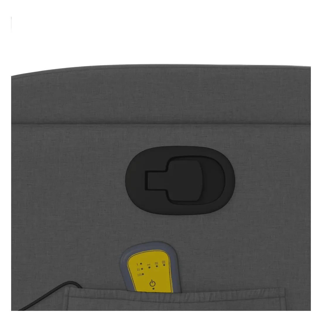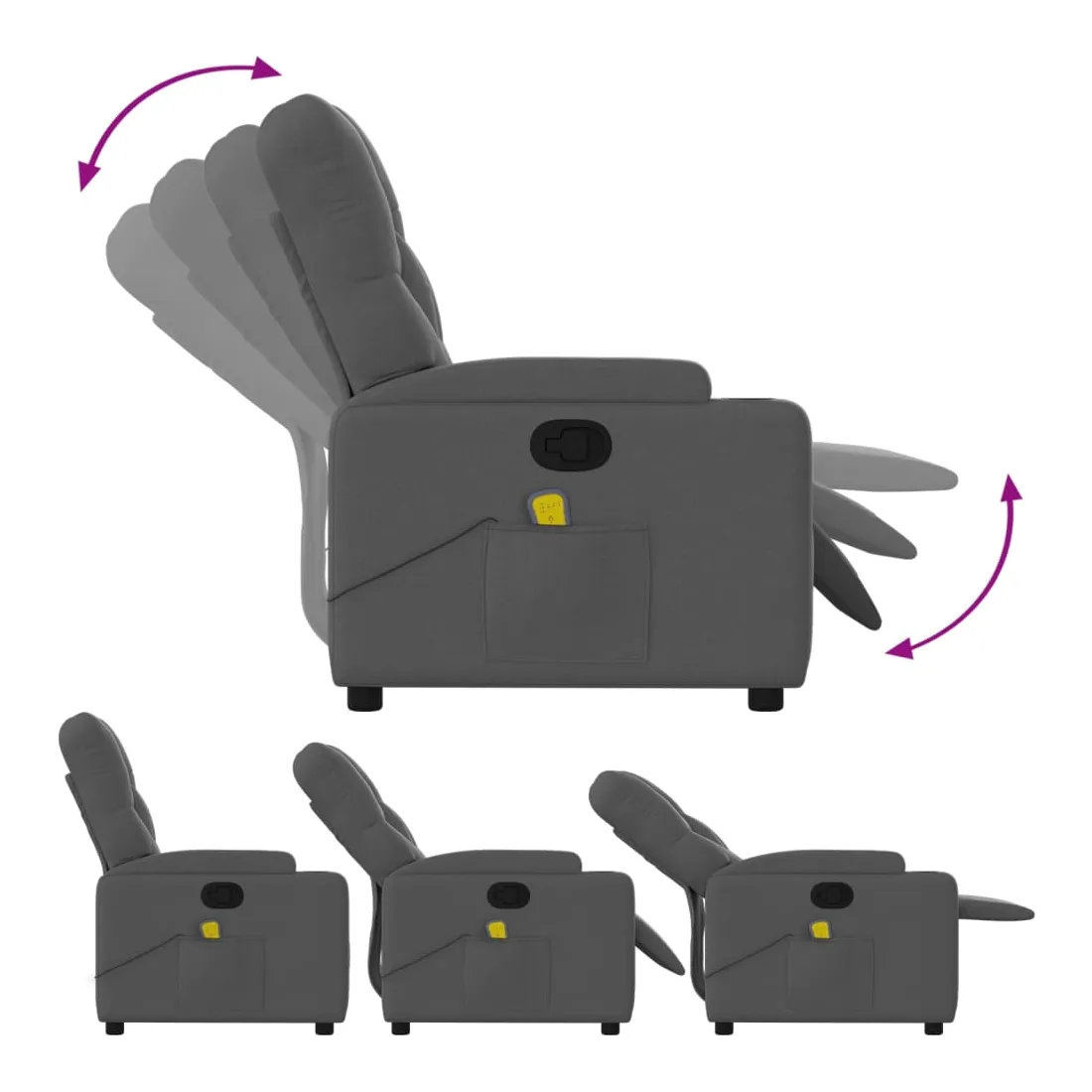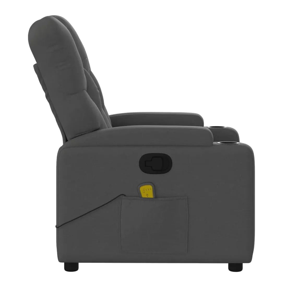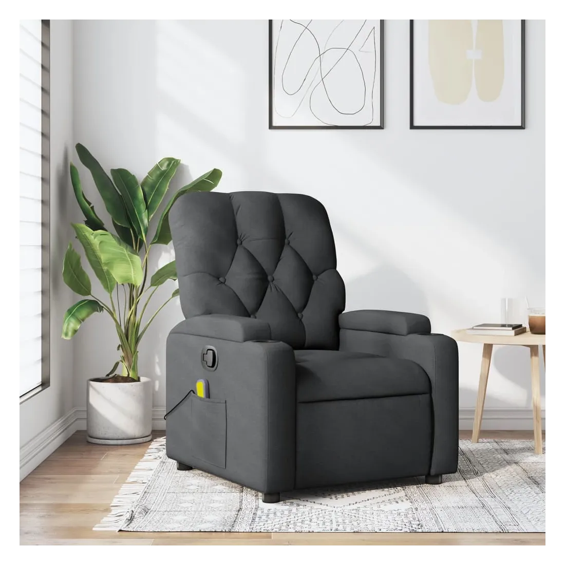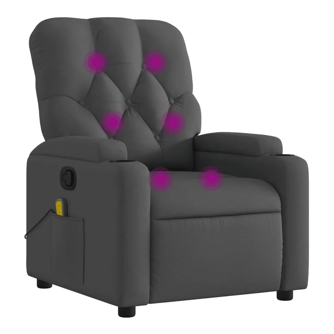 Asseyez-vous et détendez-vous dans ce fauteuil inclinable de massage très confortable ! Fonction d'inclinaison manuelle : ce fauteuil inclinable est doté d'une poignée du côté droit. Vous pouvez régler manuellement le repose-pieds et le dossier dans n'importe quelle position selon votre confort en tirant simplement sur la poignée. Cette fonction permet une inclinaison maximale de 135 degrés. De plus, le dossier peut revenir rapidement à sa position d'origine en tirant simplement sur la poignée.Fonction de vibration : les 6 points de massage vous permettent de faire l'expérience d'un massage mieux ciblé. De plus, la télécommande incluse vous permet de choisir différents programmes de massage. La fonction de massage est alimentée par le connecteur USB, mais la source d'alimentation USB 5V certifiée n'est pas incluse.Expérience d'assise confortable : le siège, le dossier et les larges accoudoirs bien rembourrés recouverts de tissu procurent une sensation confortable et chaleureuse, vous permettant de vous sentir enveloppé lorsque vous êtes assis. Le tissu présente un aspect simple et épuré et est respirant et durable.Porte-gobelets et poche latérale pratiques : ce fauteuil dispose de deux porte-gobelets pratiques pour vos boissons et d'une poche latérale pour votre télécommande ou pour garder vos objets essentiels à portée de main.Cadre solide et stable : le cadre en bois et en métal offre une structure solide et une grande stabilité. Ce fauteuil inclinable est confortable et durable.