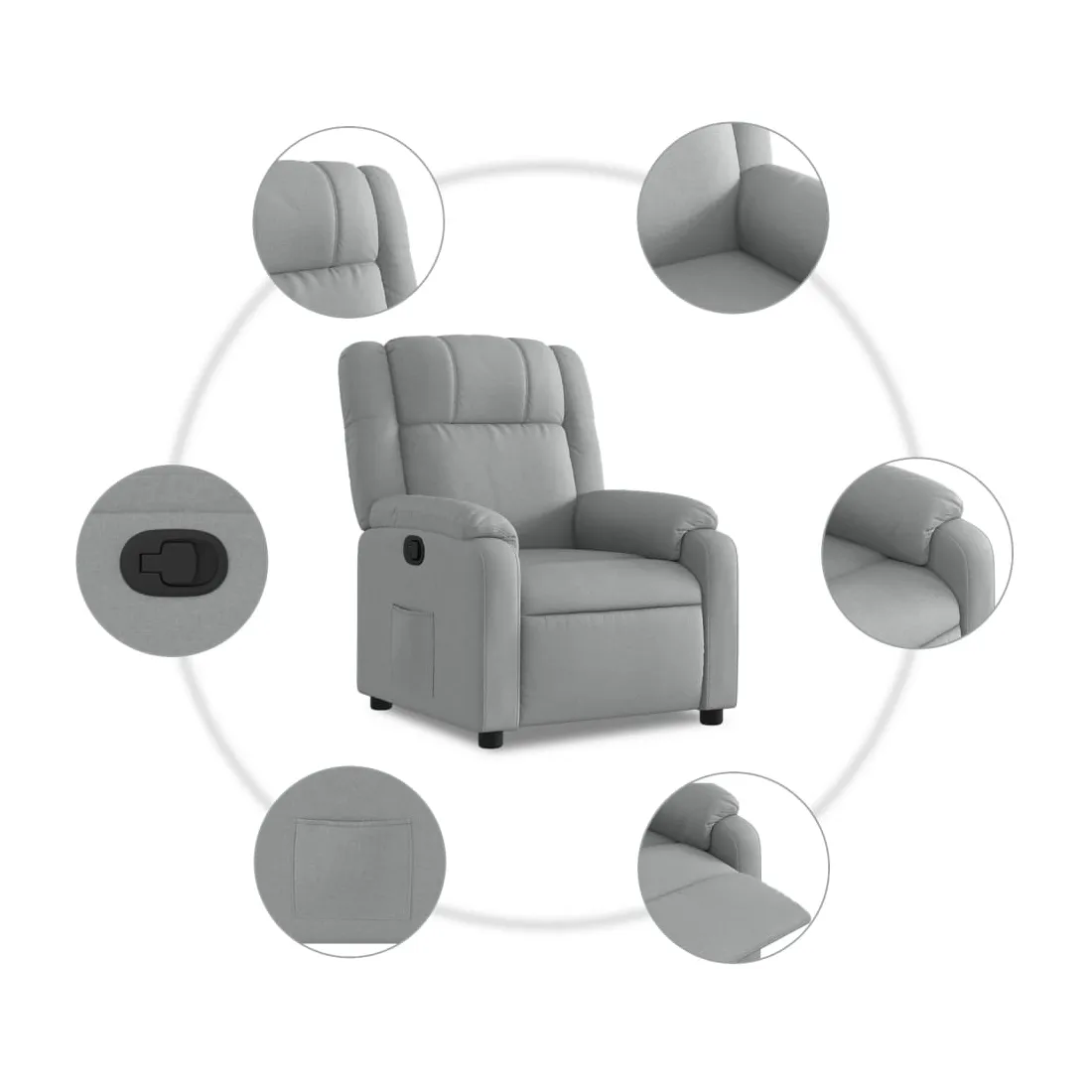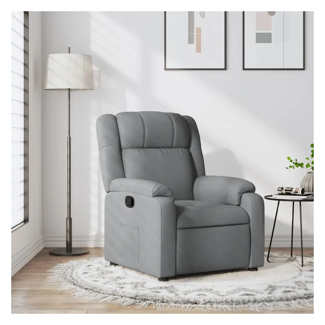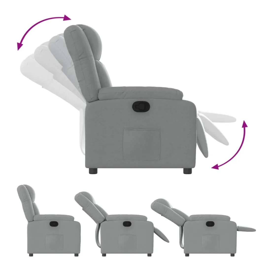 Asseyez-vous et détendez-vous dans ce fauteuil inclinable très confortable ! Fonction d'inclinaison manuelle : ce fauteuil inclinable est doté d'une poignée du côté droit. Vous pouvez régler manuellement le repose-pieds et le dossier dans n'importe quelle position selon votre confort en tirant simplement sur la poignée. Cette fonction permet une inclinaison maximale de 135 degrés. De plus, le dossier peut revenir rapidement à sa position d'origine en tirant simplement sur la poignée.Expérience d'assise confortable : le siège, le dossier et les larges accoudoirs bien rembourrés recouverts de tissu procurent une sensation confortable et chaleureuse, vous permettant de vous sentir enveloppé lorsque vous êtes assis. Le tissu présente un aspect simple et épuré et est respirant et durable.Poche latérale pratique : ce fauteuil est doté d'une poche latérale pour vous permettre de garder vos objets essentiels à portée de main.Cadre solide et stable : le cadre en bois et en métal offre une structure solide et une grande stabilité. Ce fauteuil inclinable est confortable et durable.