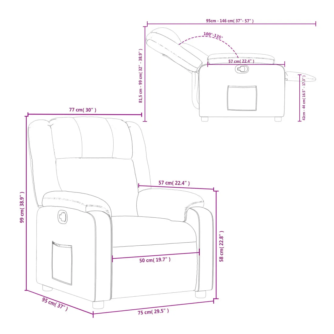 - Dimensions en position assise : 77 x 95 x 99 cm (l x P x H)