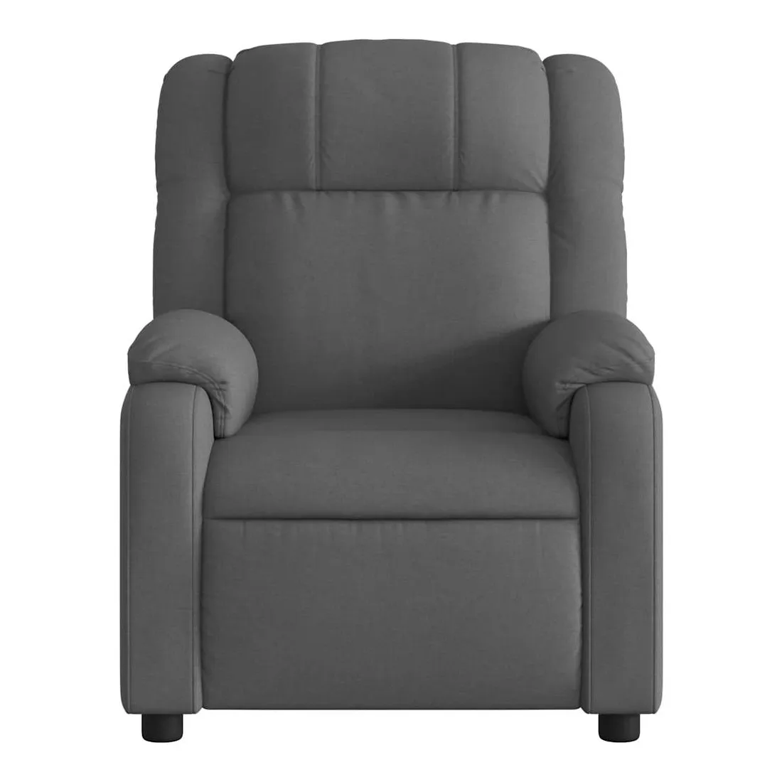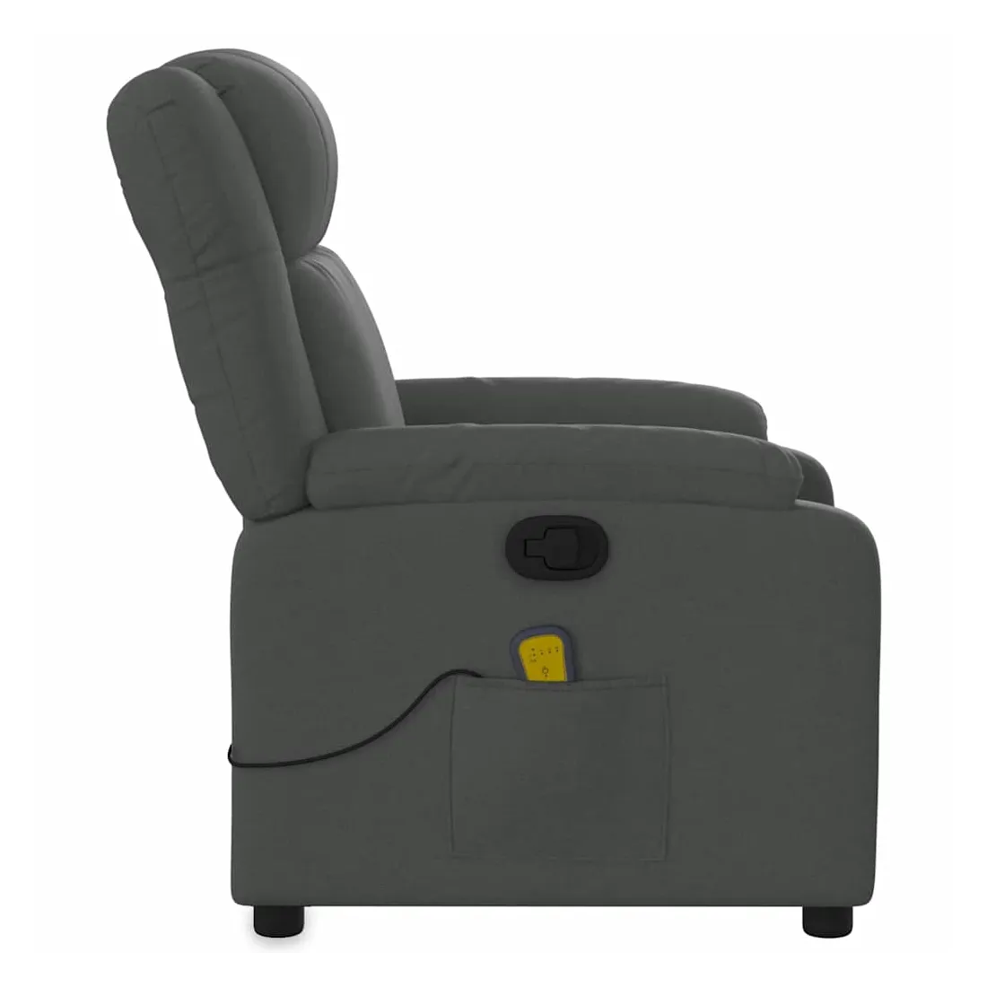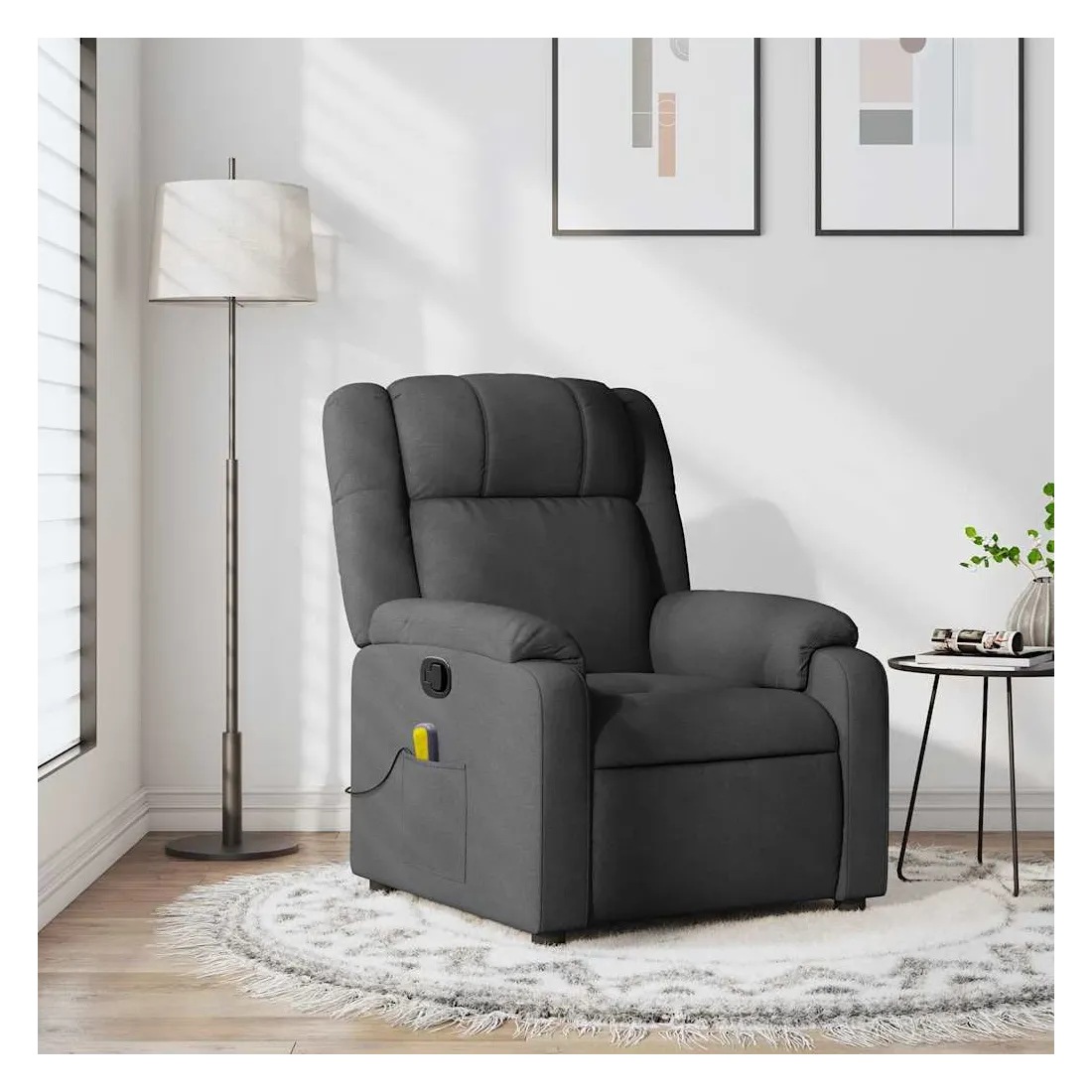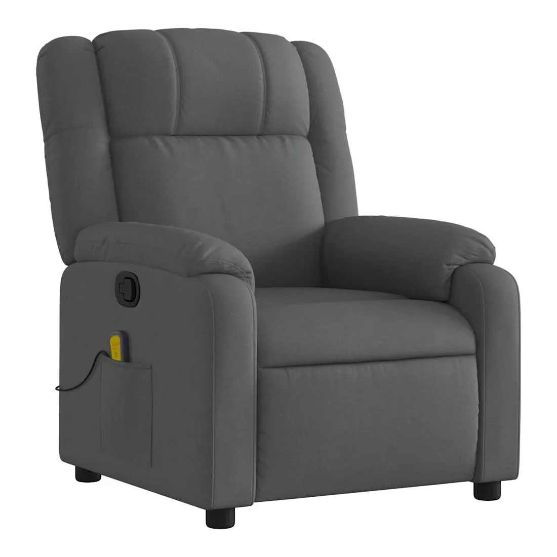 Asseyez-vous et détendez-vous dans ce fauteuil inclinable de massage très confortable ! Fonction d'inclinaison manuelle : ce fauteuil inclinable est doté d'une poignée du côté droit. Vous pouvez régler manuellement le repose-pieds et le dossier dans n'importe quelle position selon votre confort en tirant simplement sur la poignée. Cette fonction permet une inclinaison maximale de 135 degrés. De plus, le dossier peut revenir rapidement à sa position d'origine en tirant simplement sur la poignée.Fonction de vibration : les 6 points de massage vous permettent de faire l'expérience d'un massage mieux ciblé. De plus, la télécommande incluse vous permet de choisir différents programmes de massage. La fonction de massage est alimentée par le connecteur USB, mais la source d'alimentation USB 5V certifiée n'est pas incluse.Expérience d'assise confortable : le siège, le dossier et les larges accoudoirs bien rembourrés recouverts de tissu procurent une sensation confortable et chaleureuse, vous permettant de vous sentir enveloppé lorsque vous êtes assis. Le tissu présente un aspect simple et épuré et est respirant et durable.Poche latérale pratique : ce fauteuil est doté d'une poche latérale pour ranger votre télécommande ou garder vos objets essentiels à portée de main.Cadre solide et stable : le cadre en bois et en métal offre une structure solide et une grande stabilité. Ce fauteuil inclinable est confortable et durable.