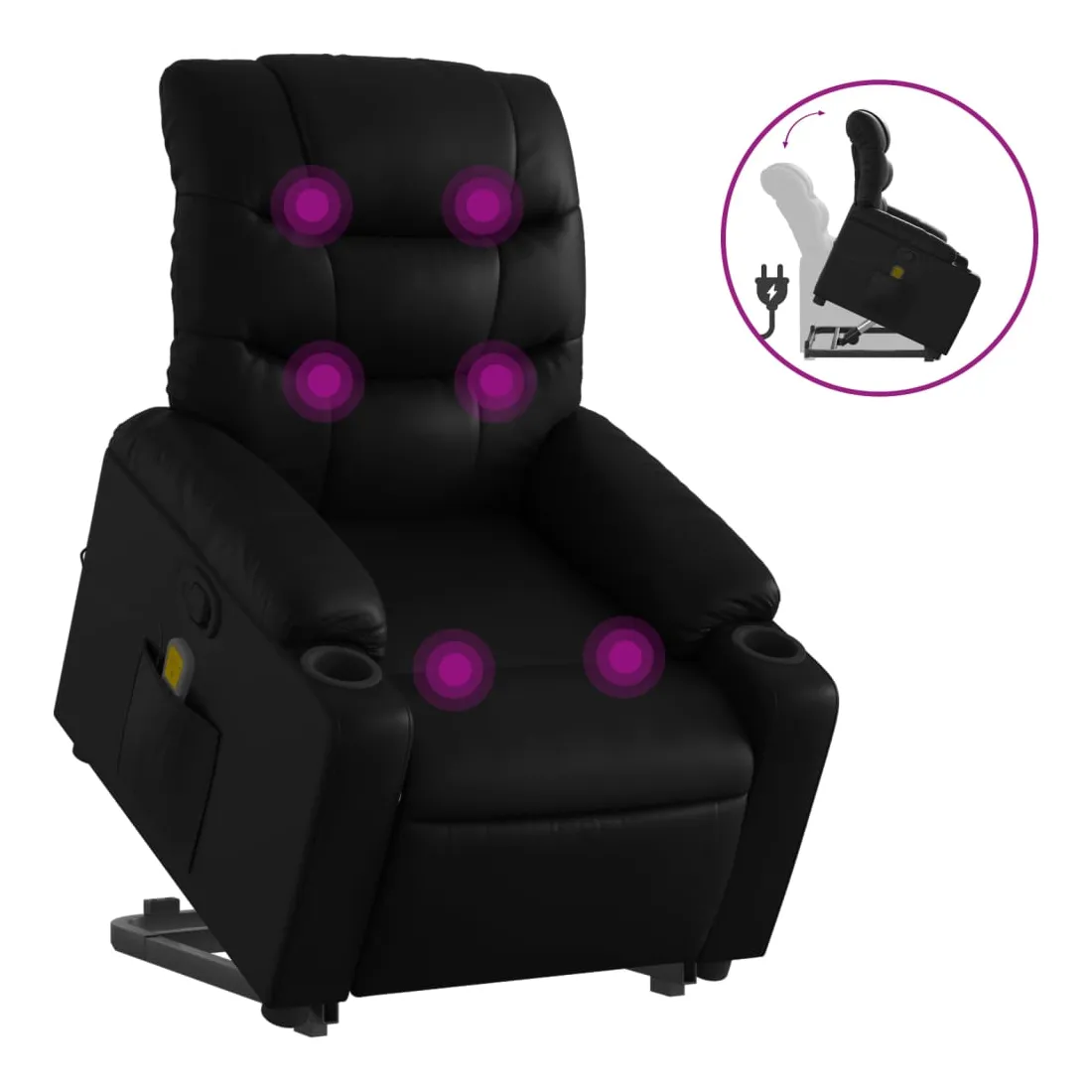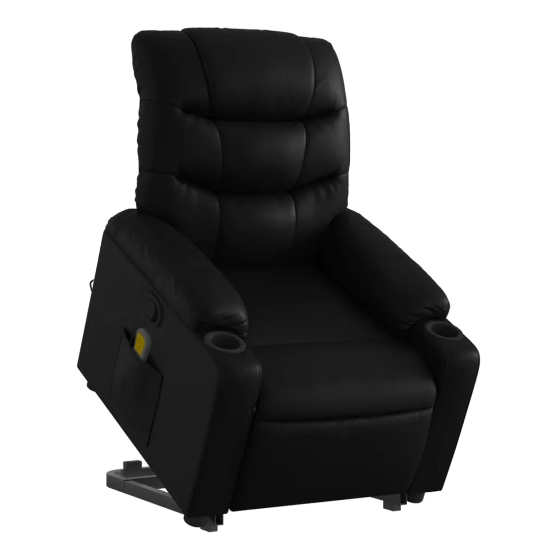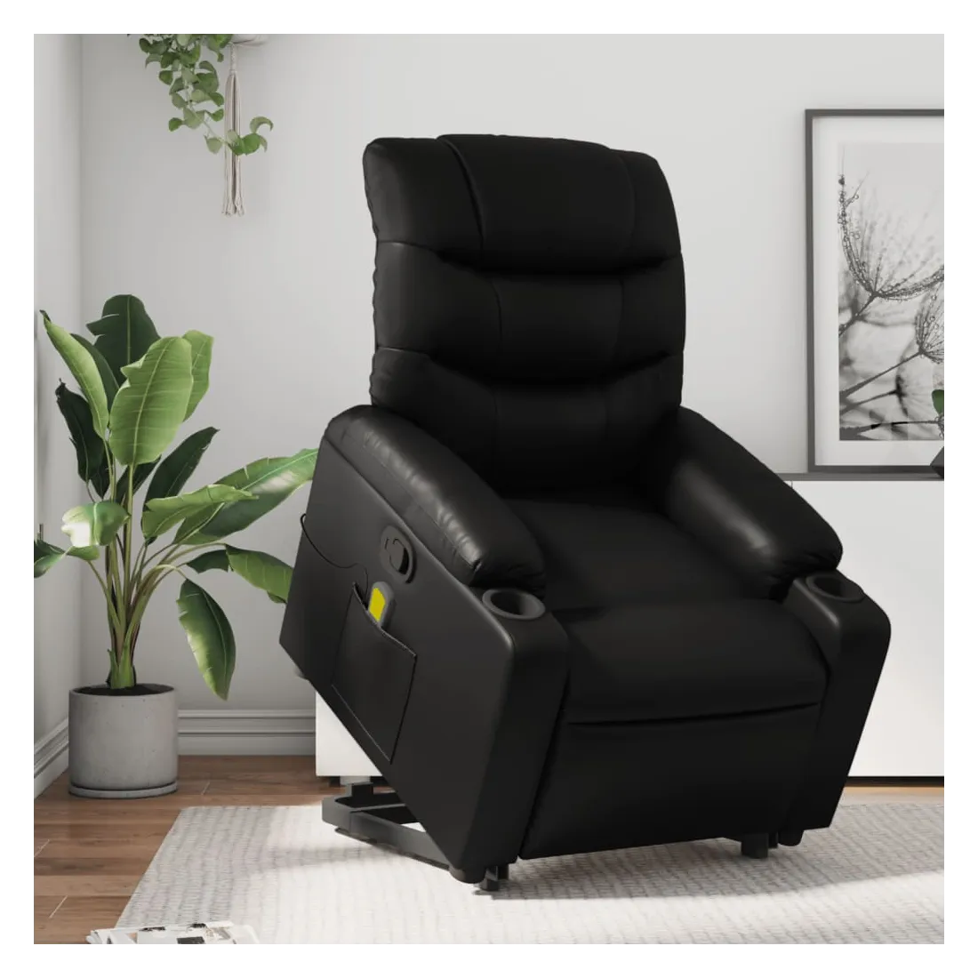 Asseyez-vous et détendez-vous dans ce fauteuil inclinable de massage très confortable ! Fonction de levage électrique : ce fauteuil inclinable pour personnes âgées est équipé d'un moteur électrique pour la fonction de levage. Grâce à la fonction qui pousse toute la chaise vers le haut, vous pouvez facilement vous tenir debout sans stresser votre dos et vos genoux en appuyant simplement sur le bouton.Fonction d'inclinaison manuelle : ce fauteuil inclinable est doté d'une poignée du côté droit. Vous pouvez régler manuellement le repose-pieds et le dossier dans n'importe quelle position selon votre confort en tirant simplement sur la poignée. Cette fonction permet une inclinaison maximale de 135 degrés. De plus, le dossier peut revenir rapidement à sa position d'origine en tirant simplement sur la poignée.Fonction de vibration : les 6 points de massage vous permettent de faire l'expérience d'un massage mieux ciblé. De plus, la télécommande incluse vous permet de choisir différents programmes de massage. La fonction de massage est alimentée par le connecteur USB qui nécessite une source d'alimentation USB certifiée de 5 V (non fournie).Expérience de siège confortable : le siège, le dossier et les larges accoudoirs rembourrés épais recouverts de similicuir procurent une sensation confortable et chaleureuse, vous faisant vous sentir enlacé lorsque vous êtes assis. Le simili cuir est un matériau très résistant. Il est résistant aux taches, ce qui le rend facile à nettoyer avec un chiffon humide. La surface lisse donne également un aspect luxueux et la beauté du cuir véritable.Poche latérale pratique : ce fauteuil est doté d'une poche latérale pour ranger votre télécommande ou garder vos objets essentiels à portée de main.Cadre solide et stable : le cadre en bois et en métal offre une structure solide et une grande stabilité. Ce fauteuil inclinable est confortable et durable.
