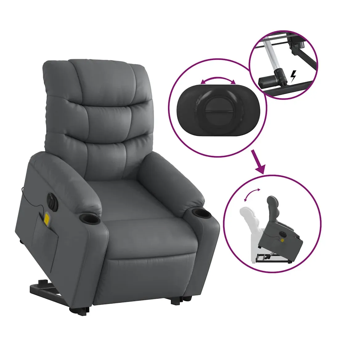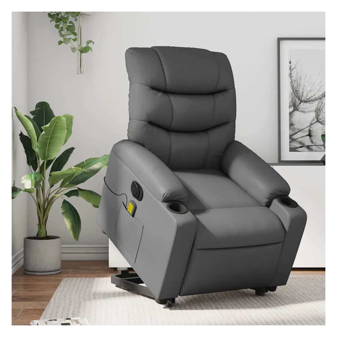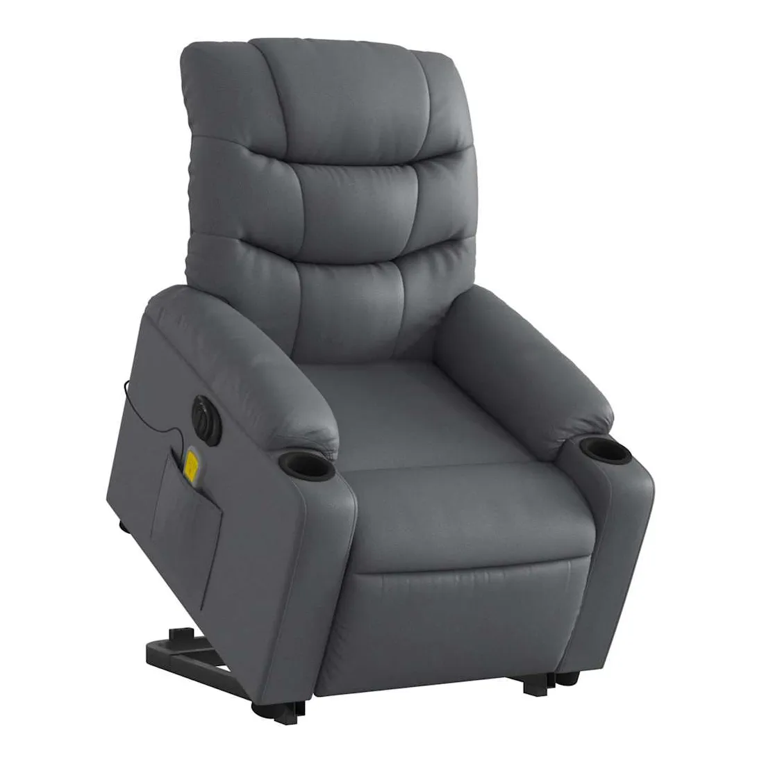 Asseyez-vous et détendez-vous dans ce fauteuil inclinable de massage électrique très confortable ! Fonction de levage électrique : ce fauteuil inclinable pour personnes âgées est équipé d'un moteur électrique pour la fonction de levage. Grâce à la fonction qui pousse toute la chaise vers le haut, vous pouvez facilement vous tenir debout sans stresser votre dos et vos genoux en appuyant simplement sur le bouton.Fonction d'inclinaison électrique : ce fauteuil inclinable est également équipé d'un moteur électrique qui permet de régler automatiquement le repose-pied et le dossier dans n'importe quelle position, selon votre confort, en appuyant simplement sur le bouton situé sur le côté du fauteuil. Cette fonction permet une inclinaison maximale de 135 degrés. En outre, le dossier peut revenir automatiquement à sa position d'origine par une simple pression sur le bouton.Fonction de vibration : les 6 points de massage vous permettent de faire l'expérience d'un massage mieux ciblé. De plus, la télécommande incluse vous permet de choisir différents programmes de massage. La fonction de massage est alimentée par le connecteur USB qui nécessite une source d'alimentation USB certifiée de 5 V (non fournie).Expérience de siège confortable : le siège, le dossier et les larges accoudoirs rembourrés épais recouverts de similicuir procurent une sensation confortable et chaleureuse, vous faisant vous sentir enlacé lorsque vous êtes assis. Le simili cuir est un matériau très résistant. Il est résistant aux taches, ce qui le rend facile à nettoyer avec un chiffon humide. La surface lisse donne également un aspect luxueux et la beauté du cuir véritable.Poche latérale pratique : ce fauteuil est doté d'une poche latérale pour ranger votre télécommande ou garder vos objets essentiels à portée de main.Cadre solide et stable : le cadre en bois et en métal offre une structure solide et une grande stabilité. Ce fauteuil inclinable est confortable et durable.