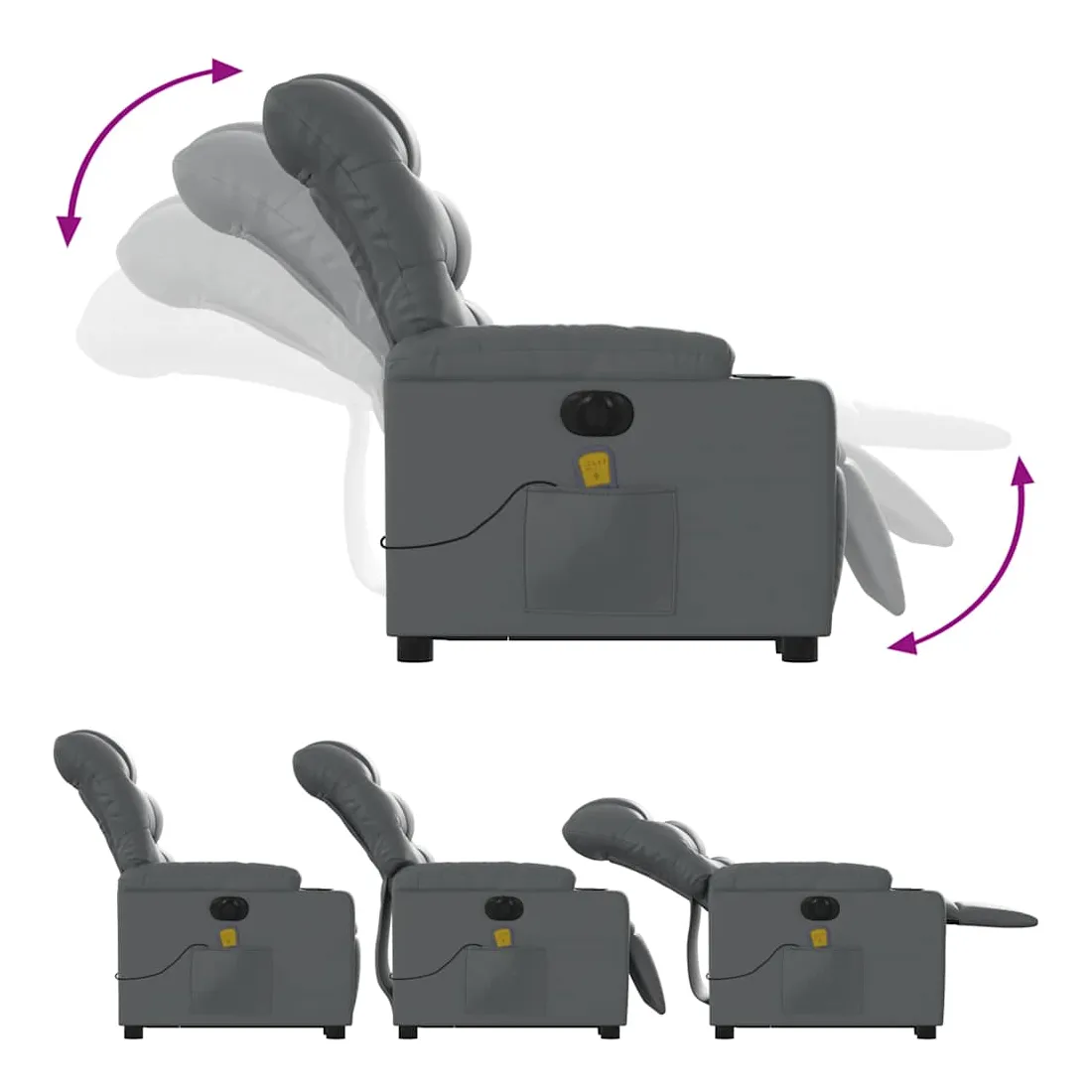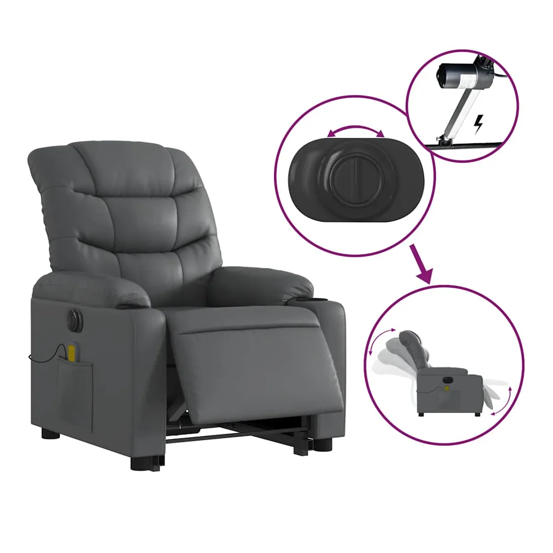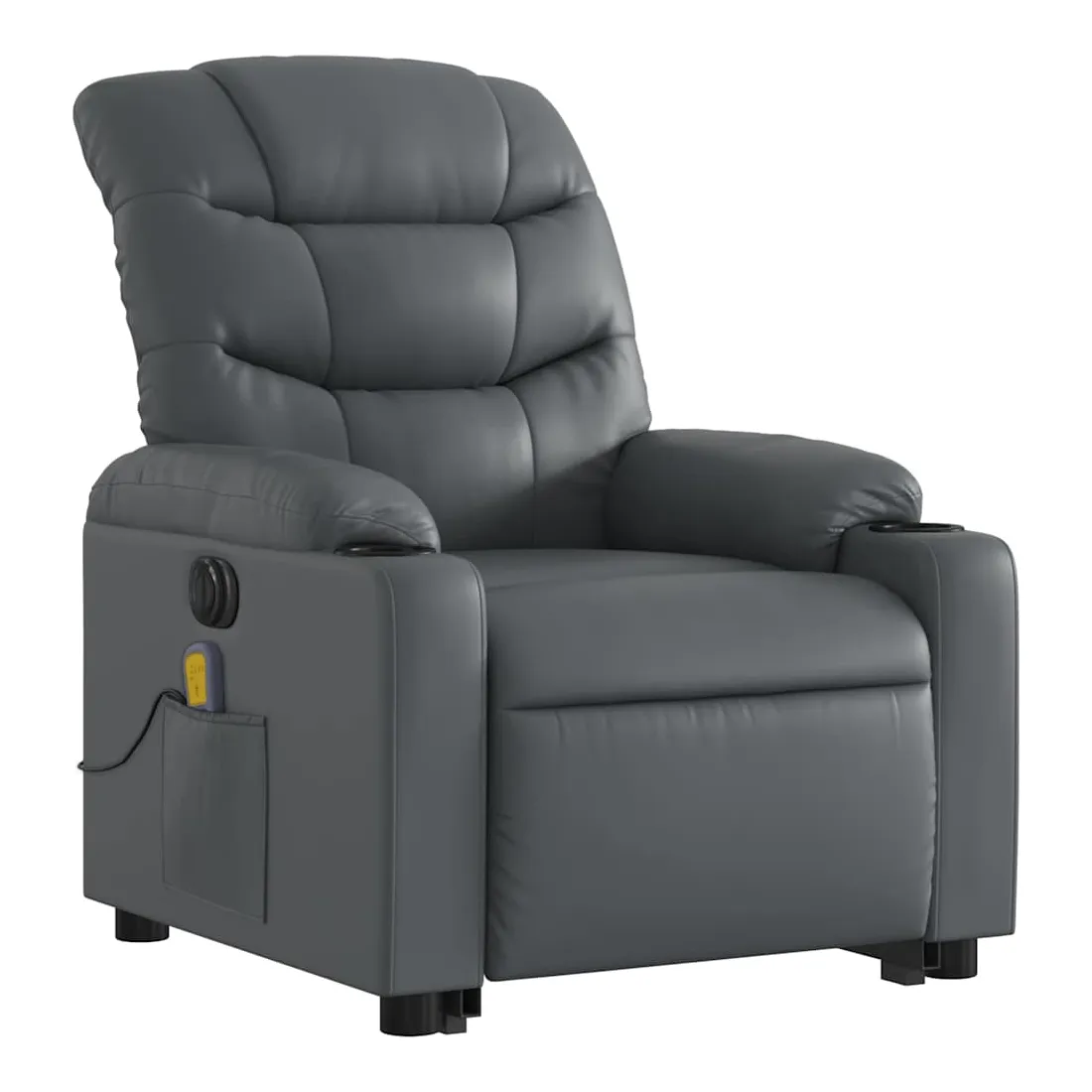 Asseyez-vous et détendez-vous dans ce fauteuil inclinable de massage électrique très confortable ! Fonction de levage électrique : ce fauteuil inclinable pour personnes âgées est équipé d'un moteur électrique pour la fonction de levage. Grâce à la fonction qui pousse toute la chaise vers le haut, vous pouvez facilement vous tenir debout sans stresser votre dos et vos genoux en appuyant simplement sur le bouton.Fonction d'inclinaison électrique : ce fauteuil inclinable est également équipé d'un moteur électrique qui permet de régler automatiquement le repose-pied et le dossier dans n'importe quelle position, selon votre confort, en appuyant simplement sur le bouton situé sur le côté du fauteuil. Cette fonction permet une inclinaison maximale de 135 degrés. En outre, le dossier peut revenir automatiquement à sa position d'origine par une simple pression sur le bouton.Fonction de vibration : les 6 points de massage vous permettent de faire l'expérience d'un massage mieux ciblé. De plus, la télécommande incluse vous permet de choisir différents programmes de massage. La fonction de massage est alimentée par le connecteur USB qui nécessite une source d'alimentation USB certifiée de 5 V (non fournie).Expérience de siège confortable : le siège, le dossier et les larges accoudoirs rembourrés épais recouverts de similicuir procurent une sensation confortable et chaleureuse, vous faisant vous sentir enlacé lorsque vous êtes assis. Le simili cuir est un matériau très résistant. Il est résistant aux taches, ce qui le rend facile à nettoyer avec un chiffon humide. La surface lisse donne également un aspect luxueux et la beauté du cuir véritable.Poche latérale pratique : ce fauteuil est doté d'une poche latérale pour ranger votre télécommande ou garder vos objets essentiels à portée de main.Cadre solide et stable : le cadre en bois et en métal offre une structure solide et une grande stabilité. Ce fauteuil inclinable est confortable et durable.