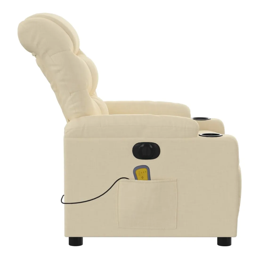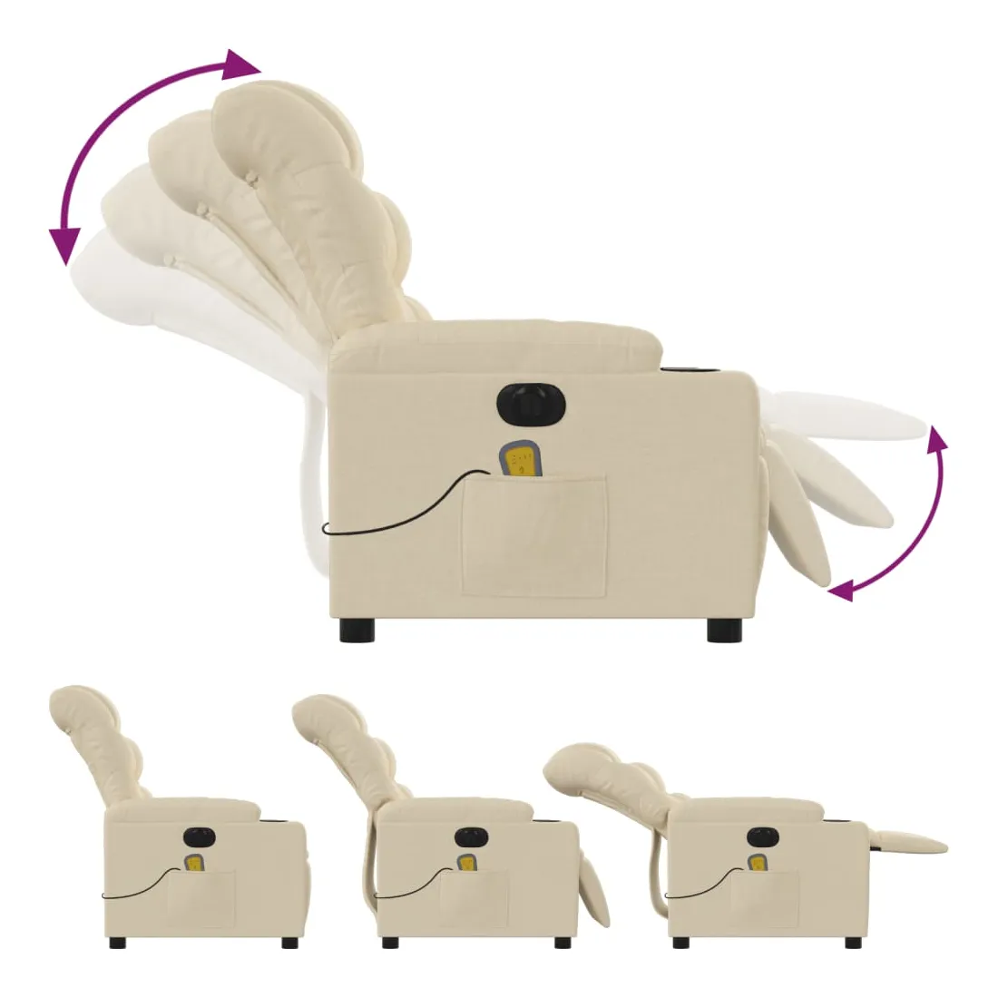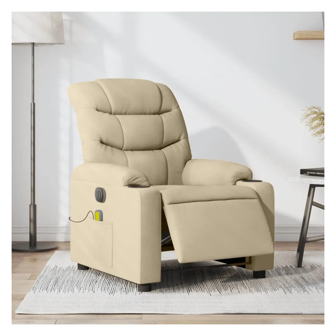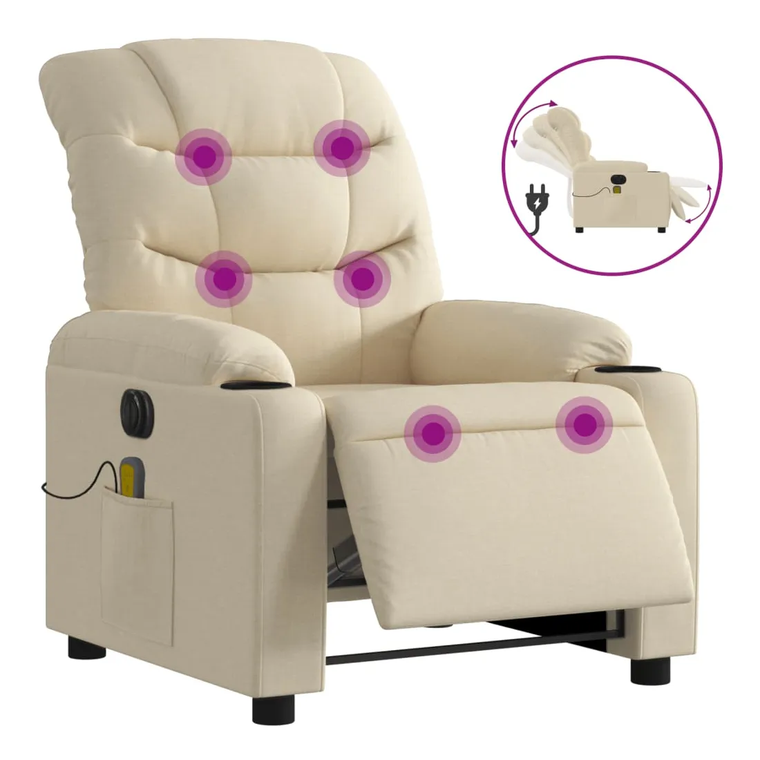 Asseyez-vous et détendez-vous dans ce fauteuil inclinable de massage électrique très confortable ! Fonction d'inclinaison électrique : ce fauteuil inclinable est équipé d'un moteur électrique qui permet de régler automatiquement le repose-pied et le dossier dans n'importe quelle position, selon votre confort, en appuyant simplement sur le bouton situé sur le côté du fauteuil. Cette fonction permet une inclinaison maximale de 135 degrés. En outre, le dossier peut revenir automatiquement à sa position d'origine par une simple pression sur le bouton.Fonction de vibration : les 6 points de massage vous permettent de faire l'expérience d'un massage mieux ciblé. De plus, la télécommande incluse vous permet de choisir différents programmes de massage. La fonction de massage est alimentée par le connecteur USB qui nécessite une source d'alimentation USB certifiée de 5 V (non fournie).Expérience d'assise confortable : le siège, le dossier et les larges accoudoirs bien rembourrés recouverts de tissu procurent une sensation confortable et chaleureuse, vous permettant de vous sentir enveloppé lorsque vous êtes assis. Le tissu présente un aspect simple et épuré et est respirant et durable.Poche latérale pratique : ce fauteuil est doté d'une poche latérale pour ranger votre télécommande ou garder vos objets essentiels à portée de main.Cadre solide et stable : le cadre en bois et en métal offre une structure solide et une grande stabilité. Ce fauteuil inclinable est confortable et durable.