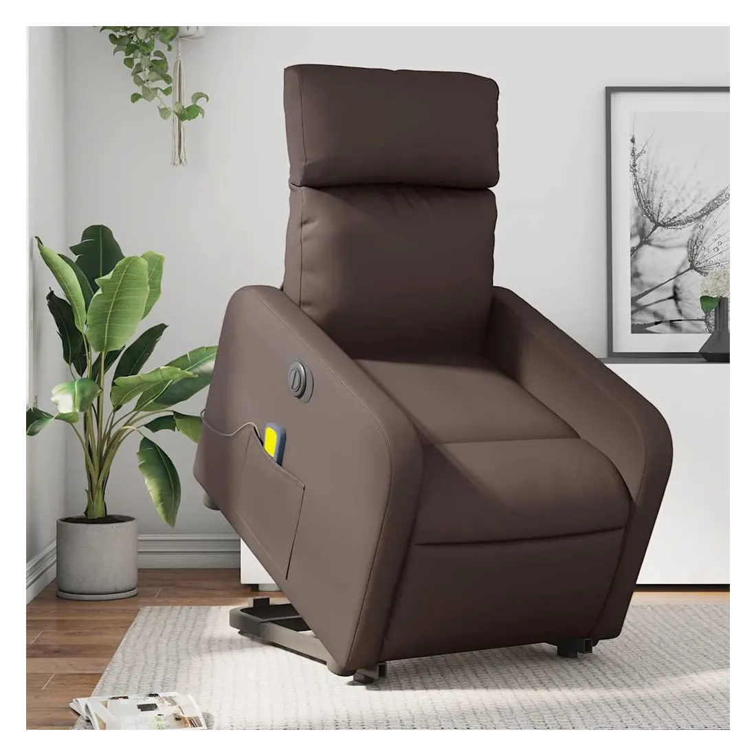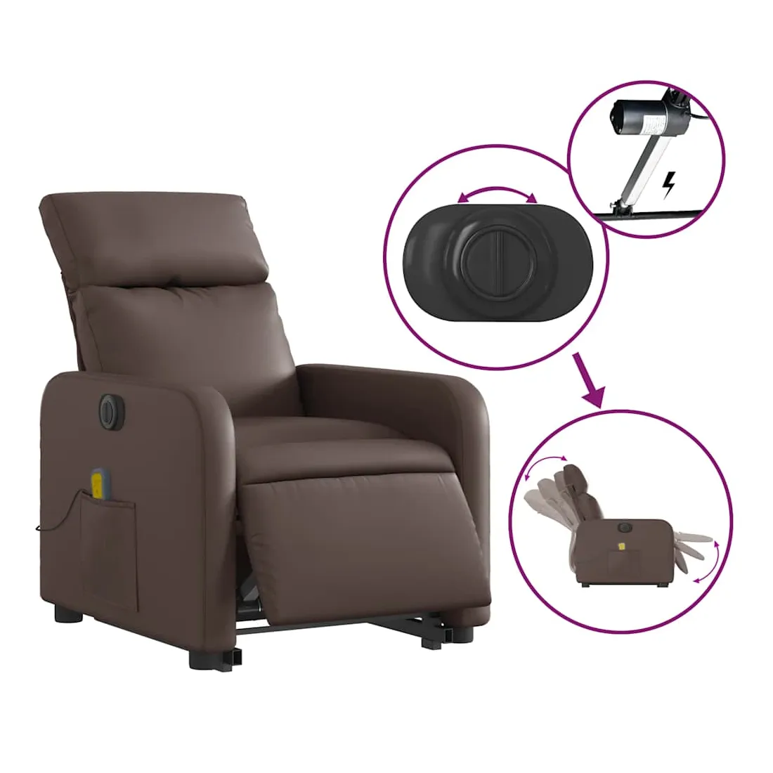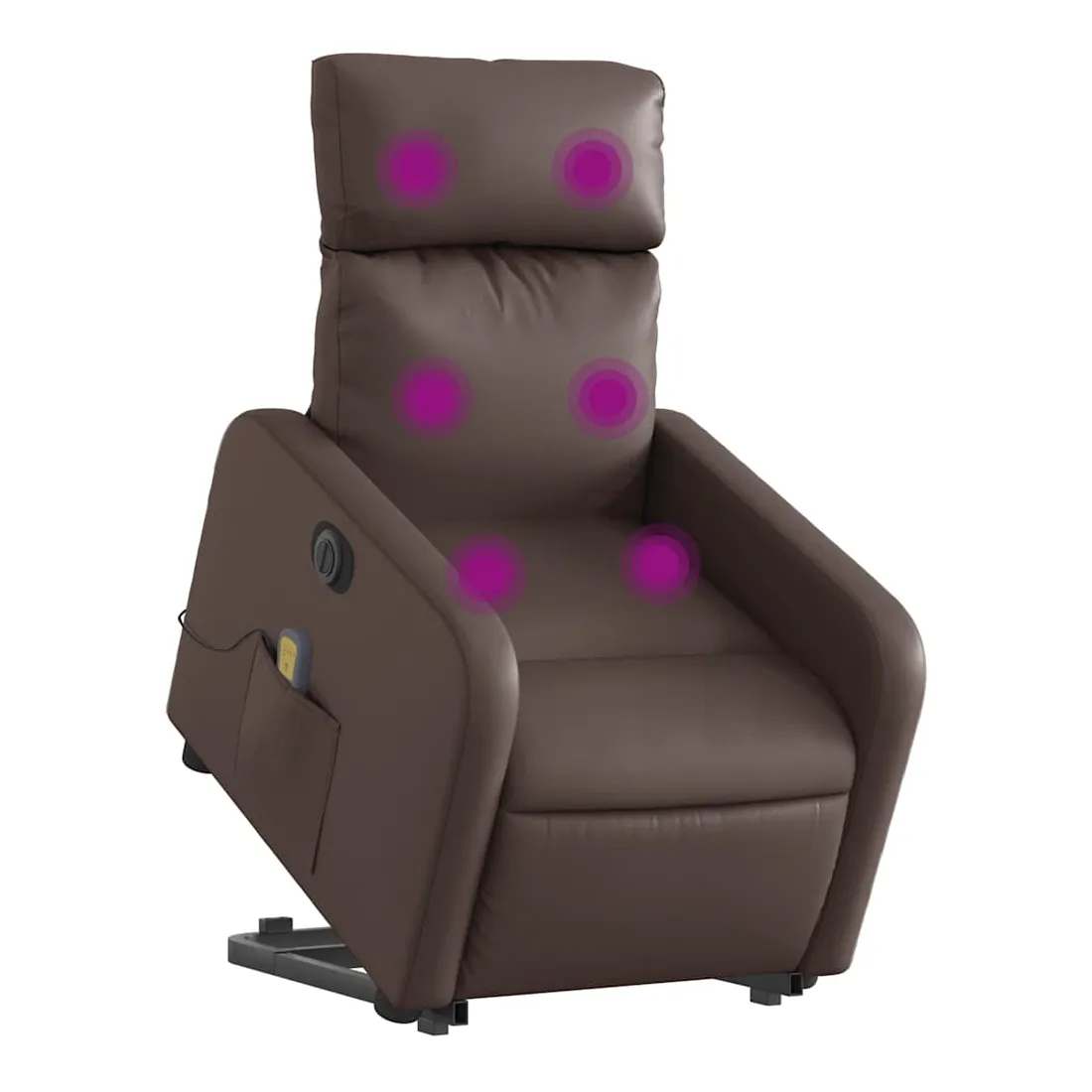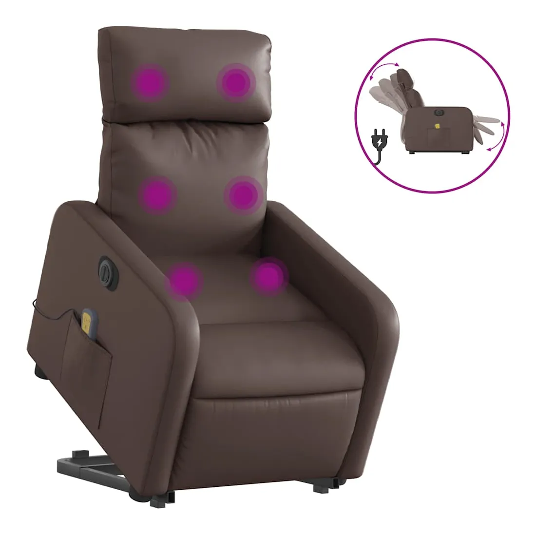 Asseyez-vous et détendez-vous dans ce fauteuil inclinable de massage électrique très confortable ! Fonction de levage électrique : ce fauteuil inclinable pour personnes âgées est équipé d'un moteur électrique pour la fonction de levage. Grâce à la fonction qui pousse toute la chaise vers le haut, vous pouvez facilement vous tenir debout sans stresser votre dos et vos genoux en appuyant simplement sur le bouton.Fonction d'inclinaison électrique : ce fauteuil inclinable est également équipé d'un moteur électrique qui permet de régler automatiquement le repose-pied et le dossier dans n'importe quelle position, selon votre confort, en appuyant simplement sur le bouton situé sur le côté du fauteuil. Cette fonction permet une inclinaison maximale de 135 degrés. En outre, le dossier peut revenir automatiquement à sa position d'origine par une simple pression sur le bouton.Fonction de vibration : les 6 points de massage vous permettent de faire l'expérience d'un massage mieux ciblé. De plus, la télécommande incluse vous permet de choisir différents programmes de massage. La fonction de massage est alimentée par le connecteur USB qui nécessite une source d'alimentation USB certifiée de 5 V (non fournie).Expérience de siège confortable : le siège, le dossier et les larges accoudoirs rembourrés épais recouverts de similicuir procurent une sensation confortable, vous faisant vous sentir enlacé lorsque vous êtes assis. Le similicuir est un matériau très résistant. Il est résistant aux taches, ce qui le rend facile à nettoyer avec un chiffon humide. La surface lisse donne également un aspect luxueux et la beauté du cuir véritable.Poche latérale pratique : ce fauteuil est doté d'une poche latérale pour vous permettre de garder vos objets essentiels à portée de main.Cadre solide et stable : le cadre en bois et en métal offre une structure solide et une grande stabilité. Ce fauteuil inclinable est confortable et durable.