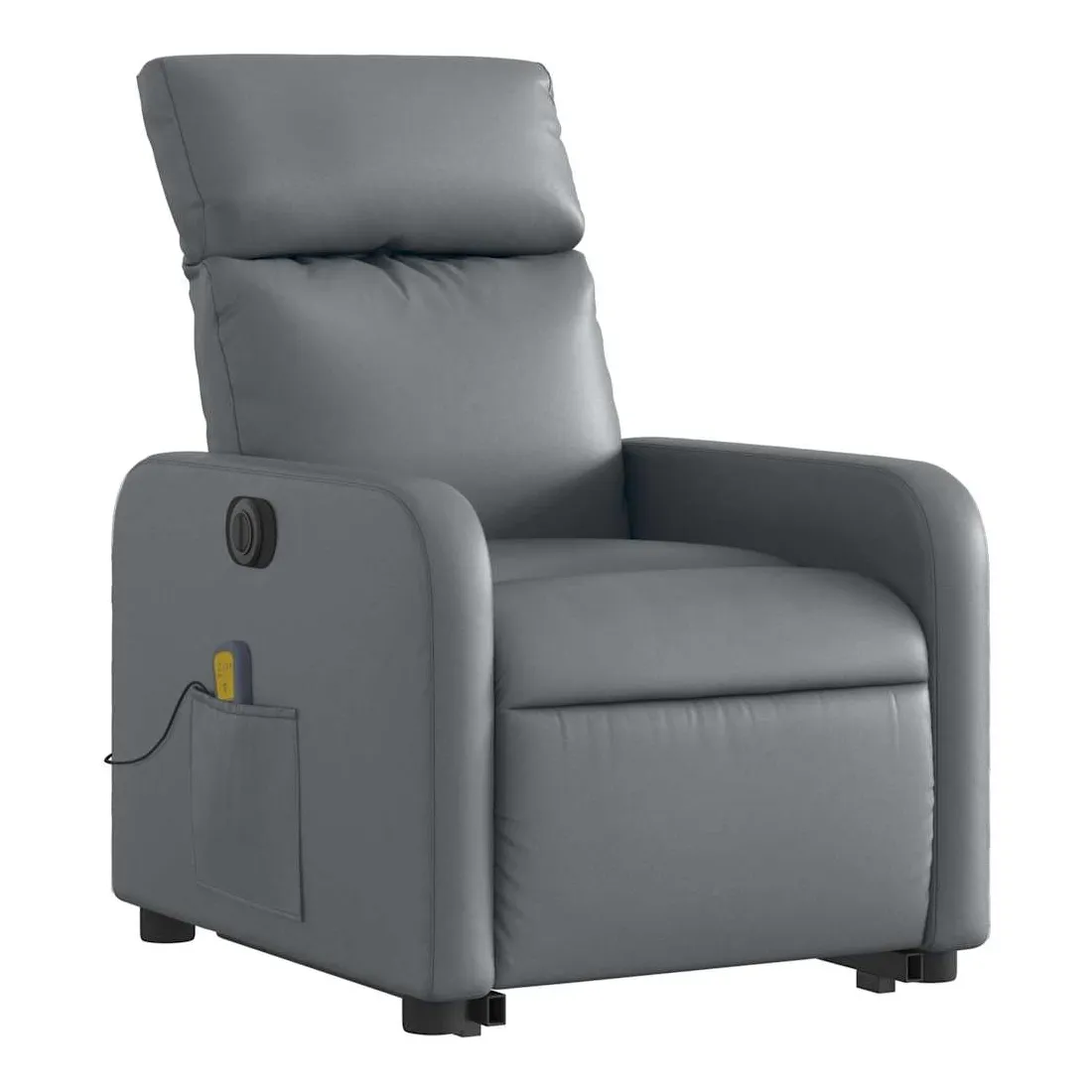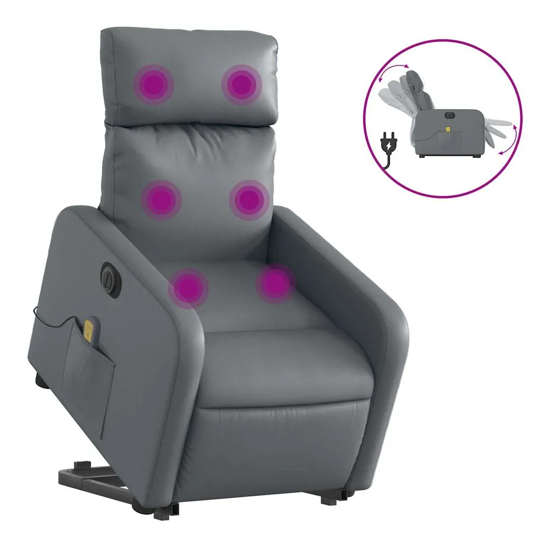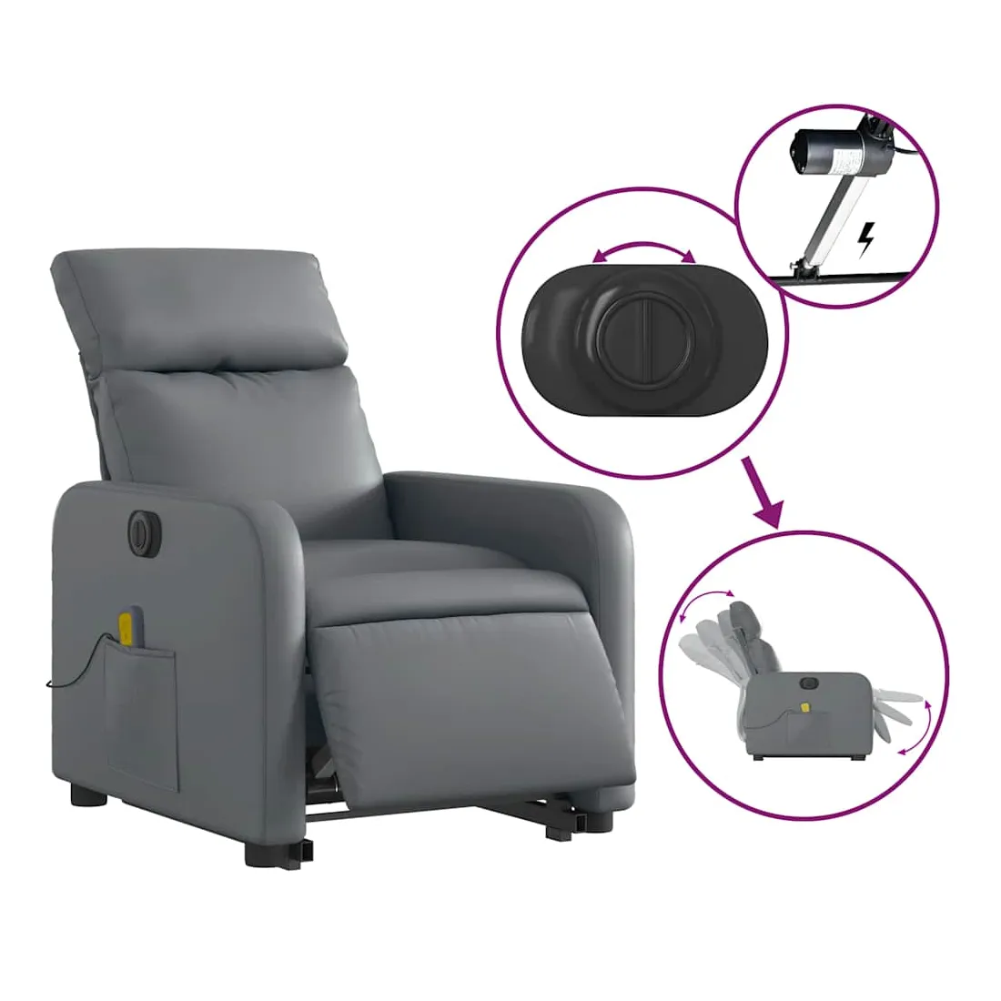 Asseyez-vous et détendez-vous dans ce fauteuil inclinable de massage électrique très confortable ! Fonction de levage électrique : ce fauteuil inclinable pour personnes âgées est équipé d'un moteur électrique pour la fonction de levage. Grâce à la fonction qui pousse toute la chaise vers le haut, vous pouvez facilement vous tenir debout sans stresser votre dos et vos genoux en appuyant simplement sur le bouton.Fonction d'inclinaison électrique : ce fauteuil inclinable est également équipé d'un moteur électrique qui permet de régler automatiquement le repose-pied et le dossier dans n'importe quelle position, selon votre confort, en appuyant simplement sur le bouton situé sur le côté du fauteuil. Cette fonction permet une inclinaison maximale de 135 degrés. En outre, le dossier peut revenir automatiquement à sa position d'origine par une simple pression sur le bouton.Fonction de vibration : les 6 points de massage vous permettent de faire l'expérience d'un massage mieux ciblé. De plus, la télécommande incluse vous permet de choisir différents programmes de massage. La fonction de massage est alimentée par le connecteur USB qui nécessite une source d'alimentation USB certifiée de 5 V (non fournie).Expérience de siège confortable : le siège, le dossier et les larges accoudoirs rembourrés épais recouverts de similicuir procurent une sensation confortable, vous faisant vous sentir enlacé lorsque vous êtes assis. Le similicuir est un matériau très résistant. Il est résistant aux taches, ce qui le rend facile à nettoyer avec un chiffon humide. La surface lisse donne également un aspect luxueux et la beauté du cuir véritable.Poche latérale pratique : ce fauteuil est doté d'une poche latérale pour vous permettre de garder vos objets essentiels à portée de main.Cadre solide et stable : le cadre en bois et en métal offre une structure solide et une grande stabilité. Ce fauteuil inclinable est confortable et durable.