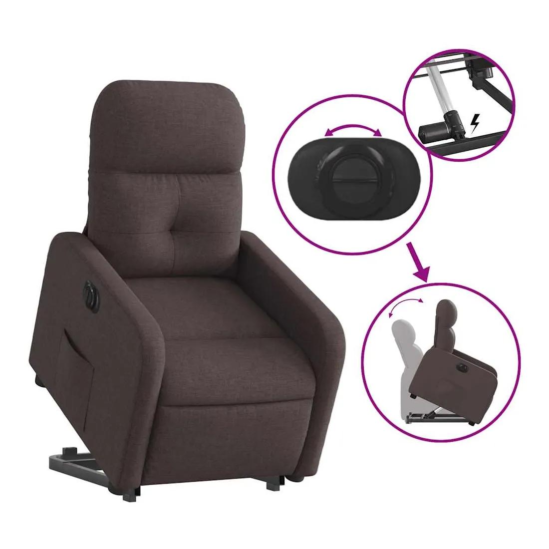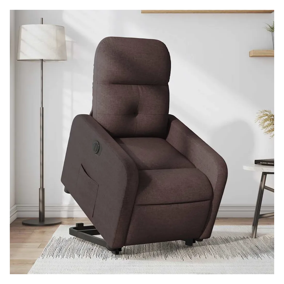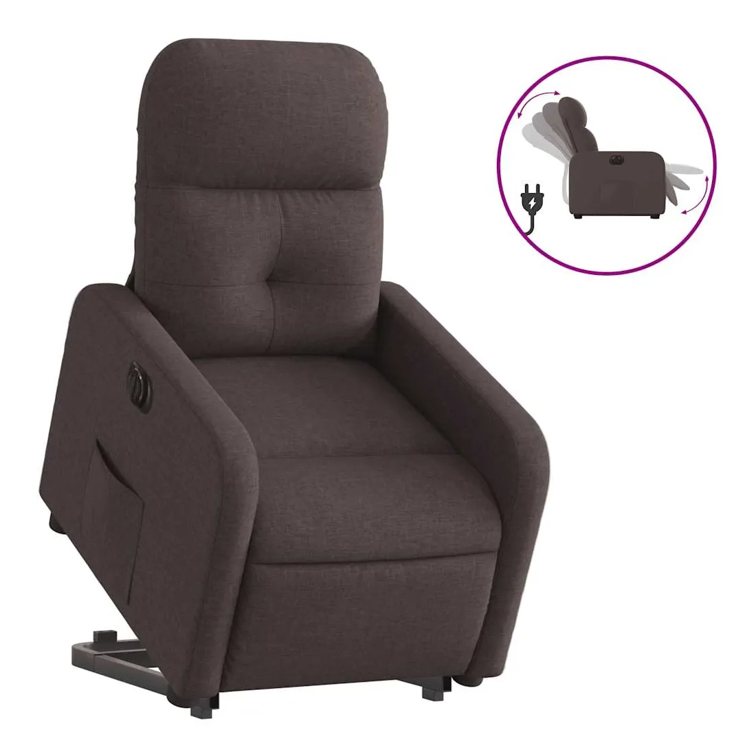 Asseyez-vous et détendez-vous dans ce fauteuil inclinable électrique très confortable ! Fonction de levage électrique : ce fauteuil inclinable pour personnes âgées est équipé d'un moteur électrique pour la fonction de levage. Grâce à la fonction qui pousse toute la chaise vers le haut, vous pouvez facilement vous tenir debout sans stresser votre dos et vos genoux en appuyant simplement sur le bouton.Fonction d'inclinaison électrique : ce fauteuil inclinable est également équipé d'un moteur électrique qui permet de régler automatiquement le repose-pied et le dossier dans n'importe quelle position, selon votre confort, en appuyant simplement sur le bouton situé sur le côté du fauteuil. Cette fonction permet une inclinaison maximale de 135 degrés. En outre, le dossier peut revenir automatiquement à sa position d'origine par une simple pression sur le bouton.Expérience d'assise confortable : le siège, le dossier et les larges accoudoirs bien rembourrés recouverts de tissu procurent une sensation confortable et chaleureuse, vous permettant de vous sentir enveloppé lorsque vous êtes assis. Le tissu présente un aspect simple et épuré et est respirant et durable.Poche latérale pratique : ce fauteuil est doté d'une poche latérale pour vous permettre de garder vos objets essentiels à portée de main.Cadre solide et stable : le cadre en bois et en métal offre une structure solide et une grande stabilité. Ce fauteuil inclinable est confortable et durable.