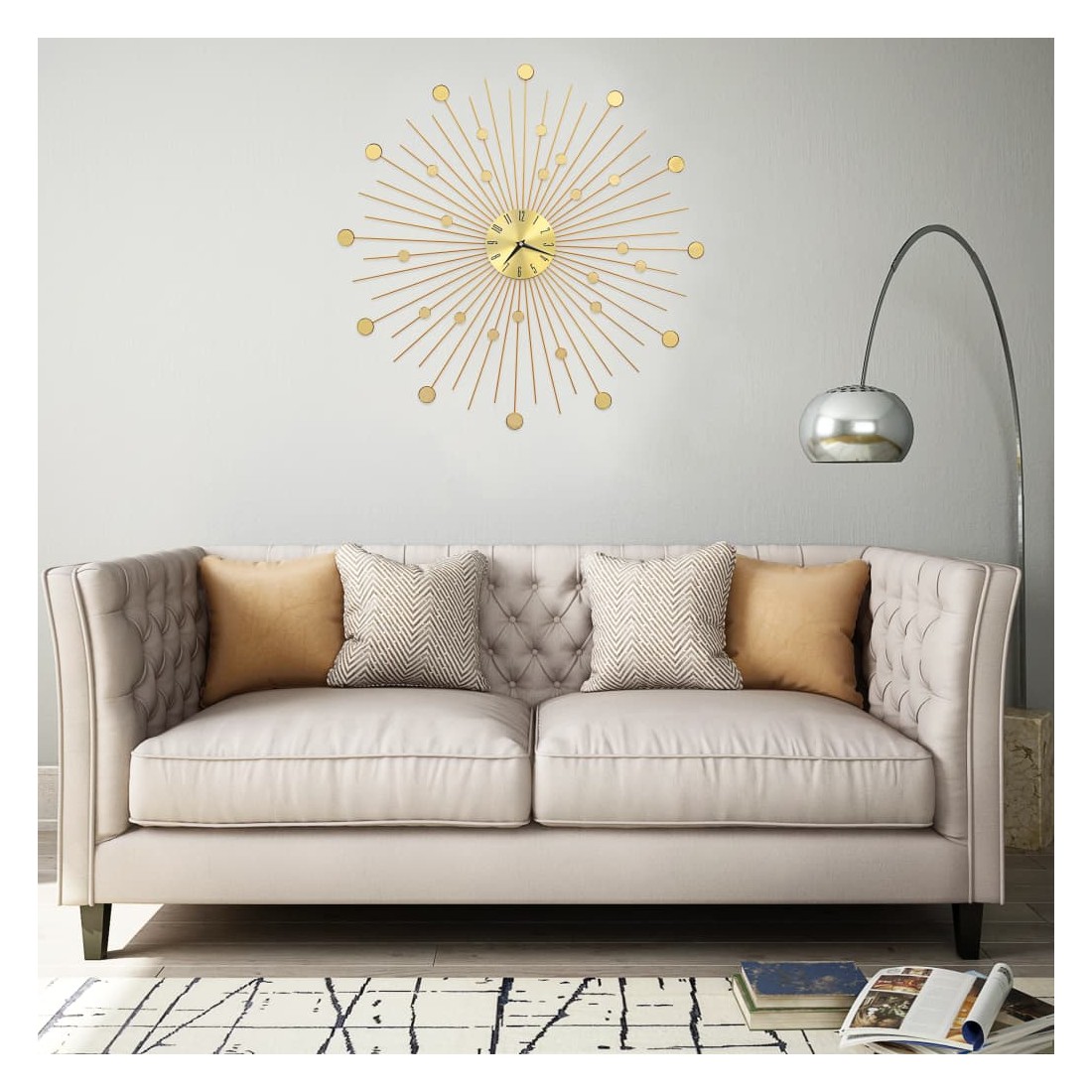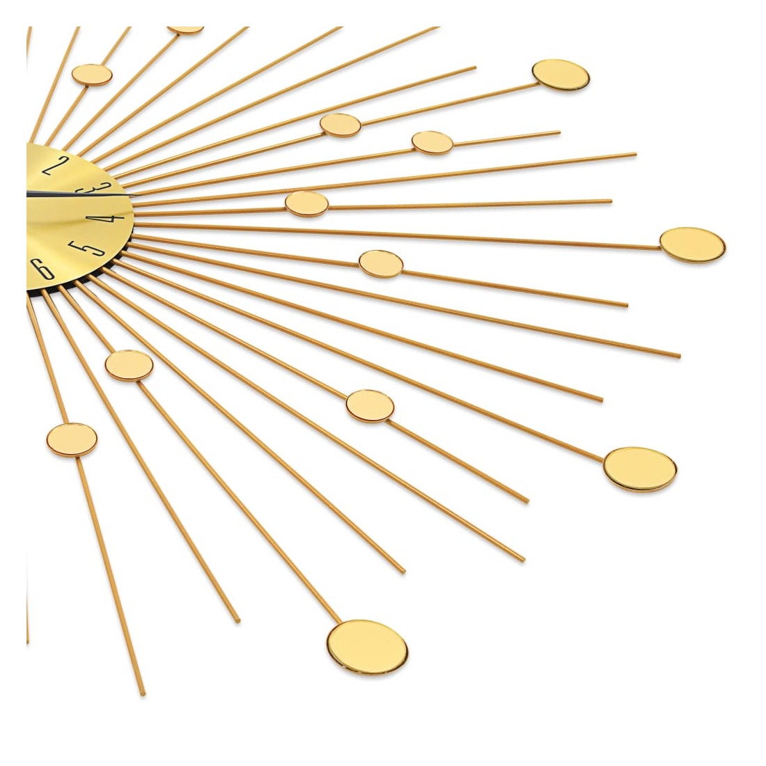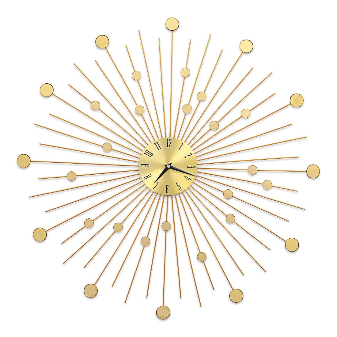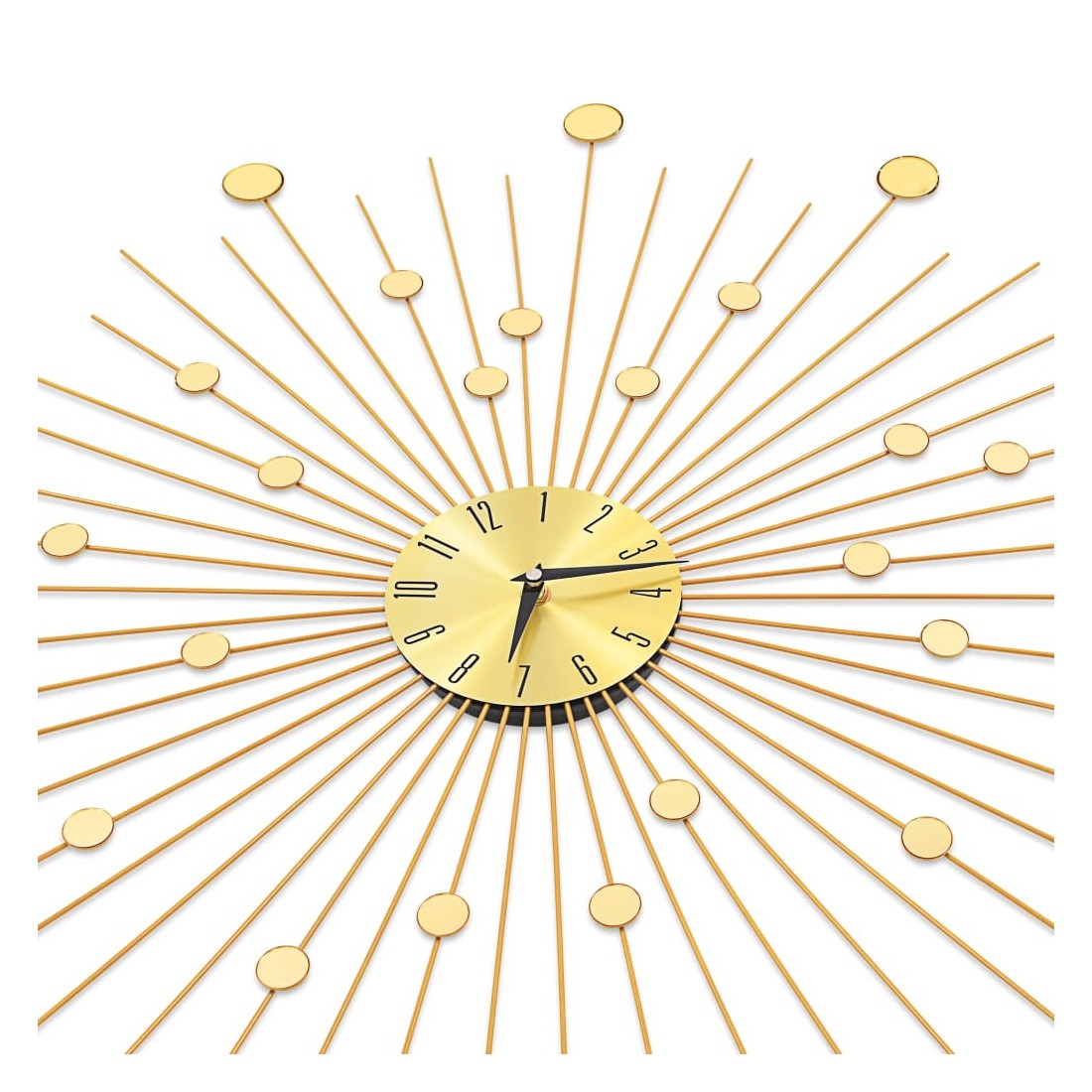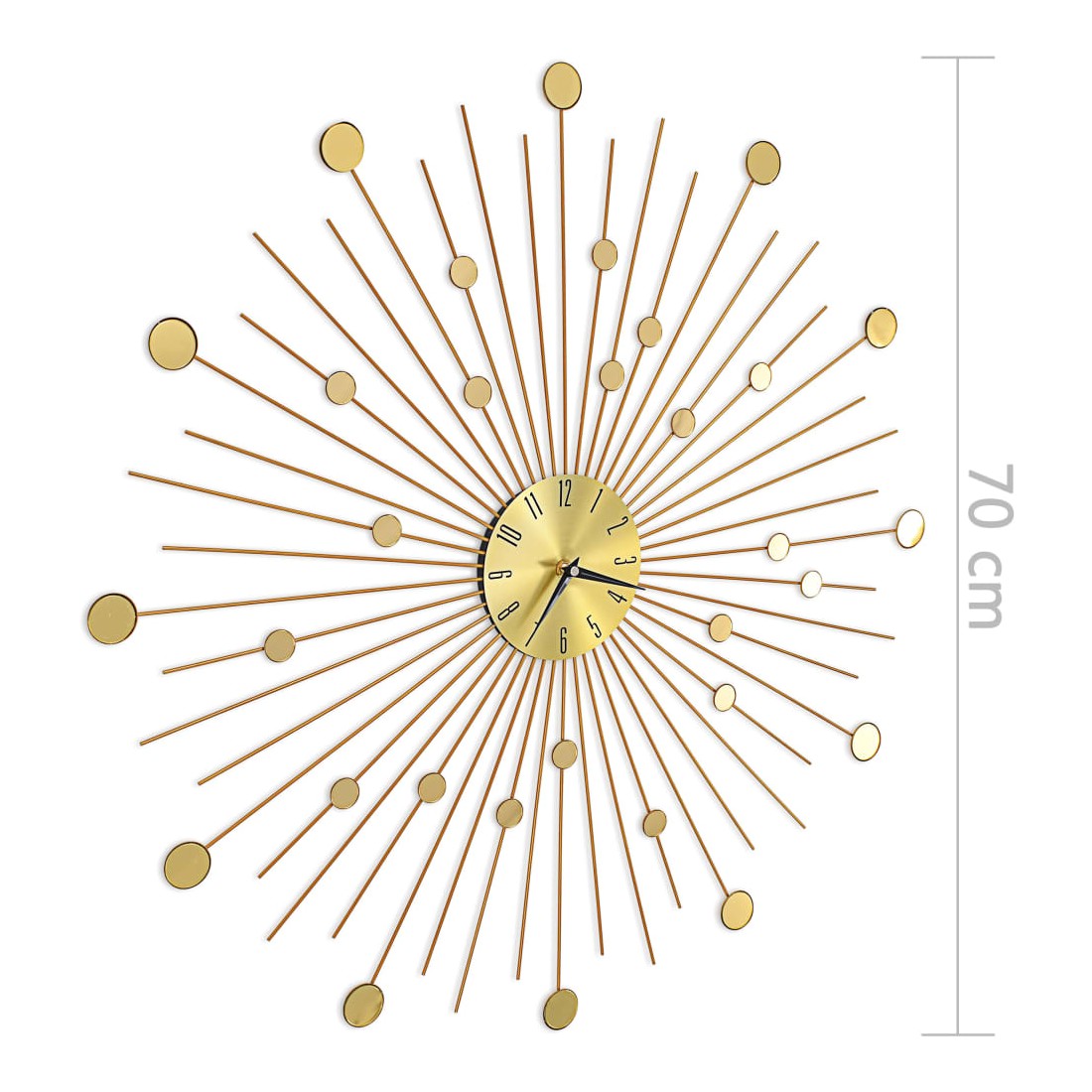 Apportez une pièce maîtresse dans votre espace avec notre superbe horloge murale en métal doré ! Distinguée par des détails brillants, cette horloge murale est une pièce vraiment magnifique et sera un excellent supplément à l'intérieur de votre maison. L'horloge a une construction robuste en métal, ce qui la rend très durable. Avec des mouvements à quartz, l'horloge est précise à tenir l'heure. Grâce au cadran doré brillant et aux chiffres clairs, l'horloge peut être lue clairement, même à partir de longues distances. Elle peut être facilement accrochée au mur.