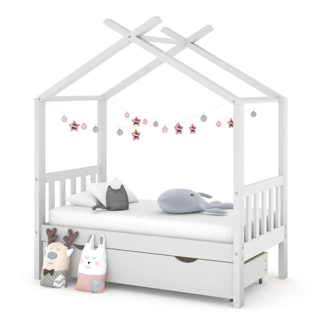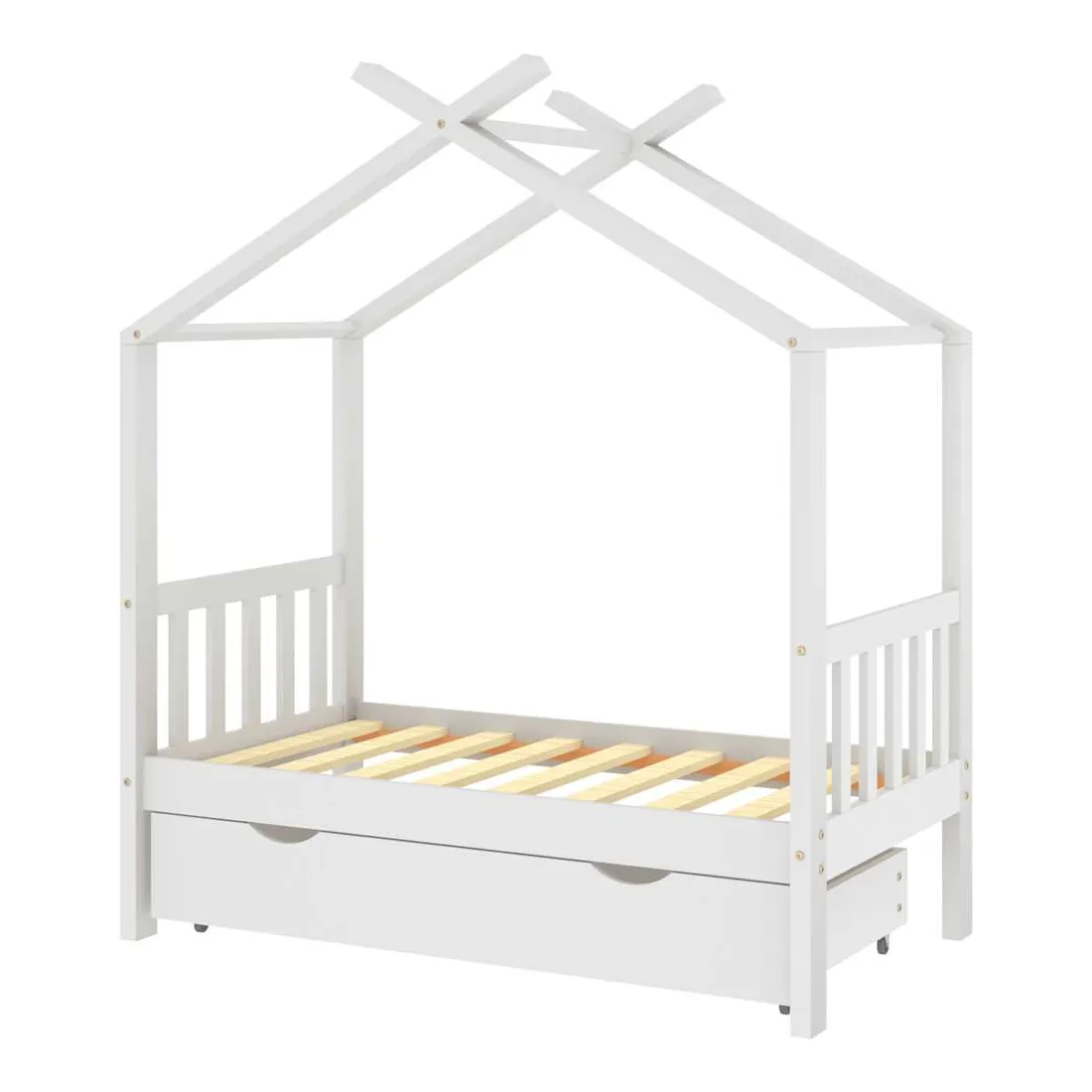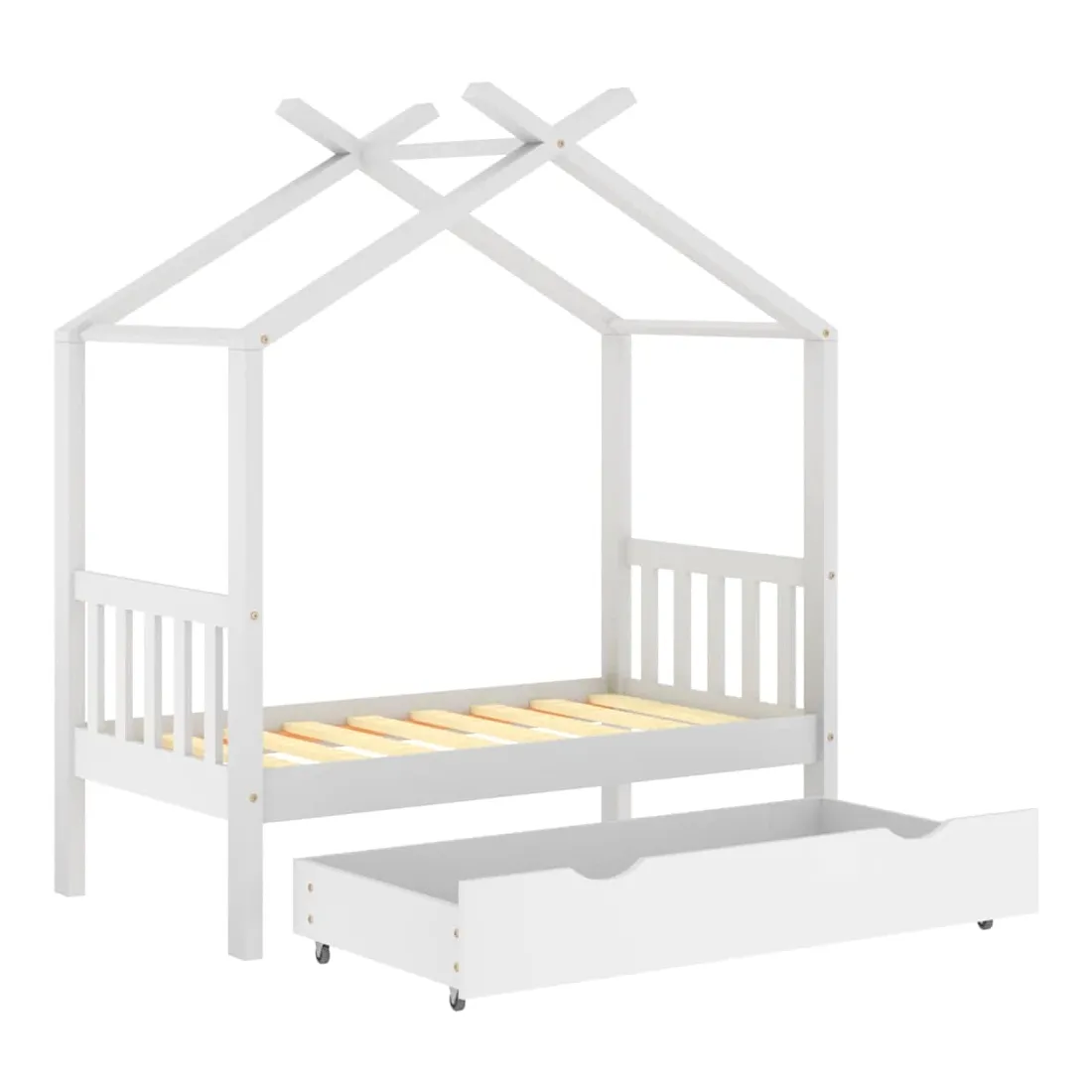 Ce cadre de lit enfant en bois avec tiroir est un supplément pratique et décoratif à la décoration de toute chambre à coucher. Le lit est intelligemment conçu avec un cadre de style maison d'arbre où vous pouvez accrocher des rideaux de lit pour créer de l'intimité pour votre enfant. Il peut aussi servir de soutien pour lire un livre ou de maisonnette pour votre enfant. Fabriqué en bois de pin massif, ce cadre de lit est extrêmement robuste et durable. Les lattes solides offrent le soutien nécessaire et sont très confortables. Le tiroir de lit inclus avec 2 poignées offre un grand espace de rangement pour ranger les vêtements pliés, les jouets, etc. et garder votre pièce propre et bien rangée. Les roues à glissement facile peuvent rouler sur la moquette et le parquet. Ce cadre de lit convient à un matelas mesurant 70 x 140 cm. Veuillez noter que la livraison comprend uniquement un cadre de lit, le matelas et les rideaux ne sont pas inclus. Le lit est facile à assembler. Vous pouvez consulter notre boutique pour les matelas assortis.