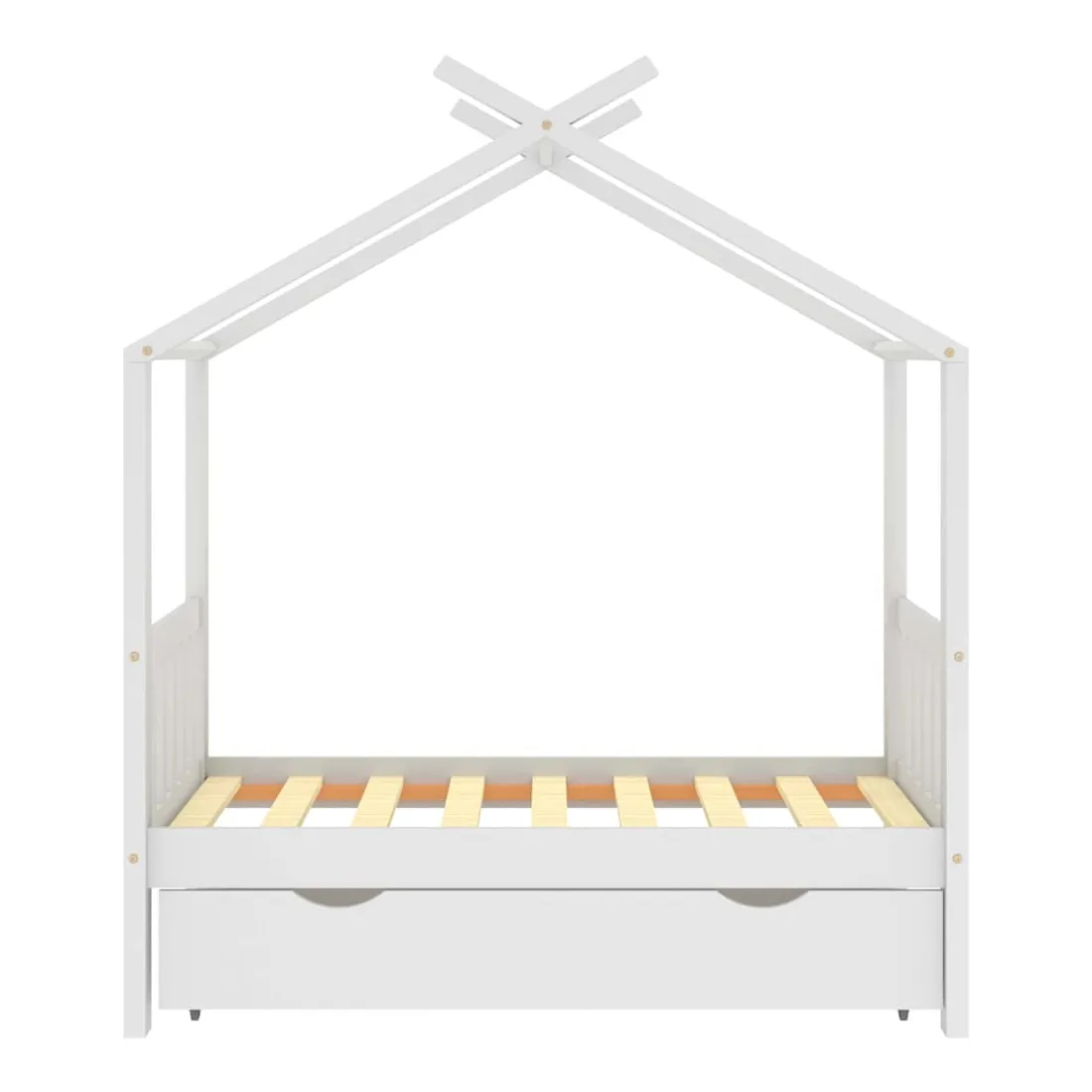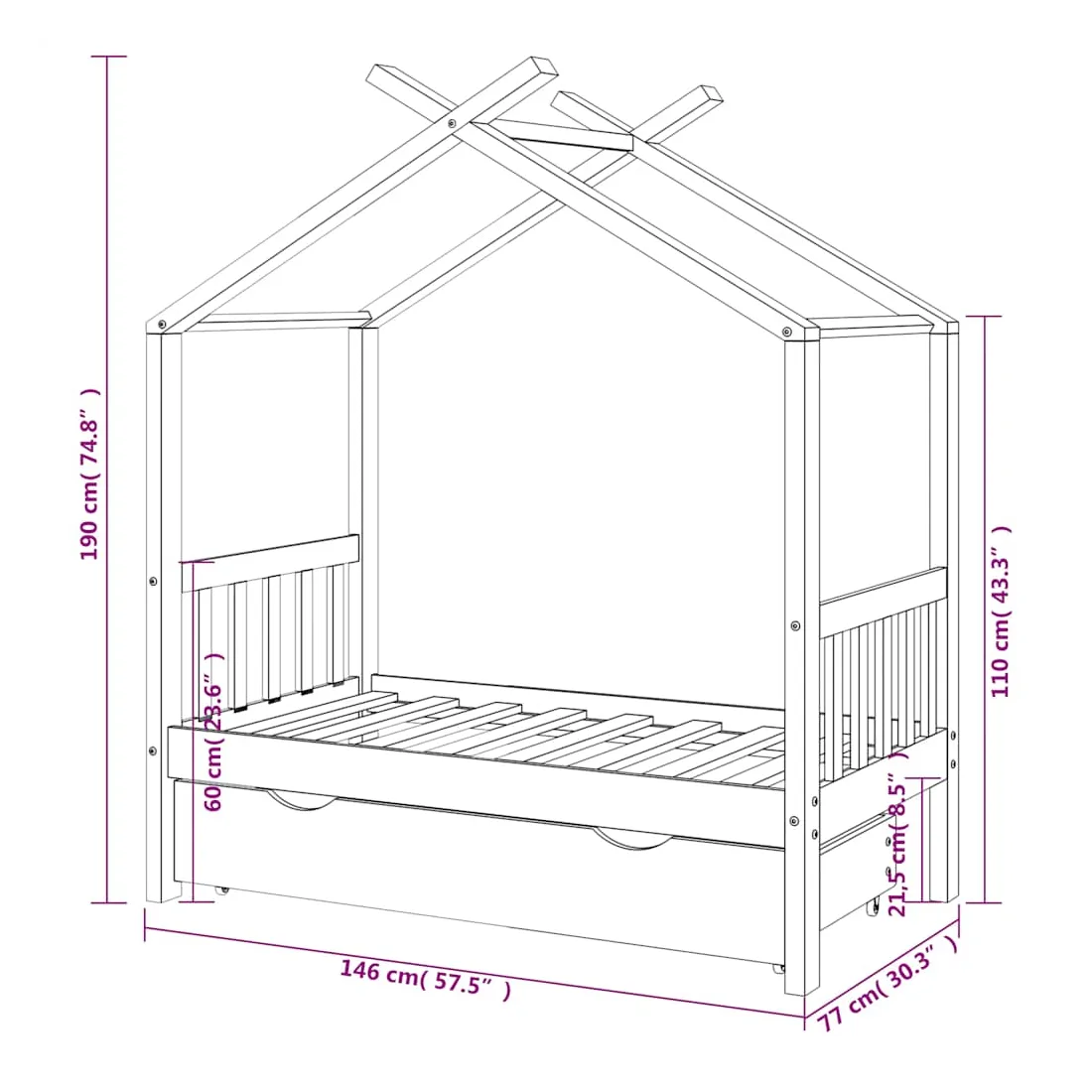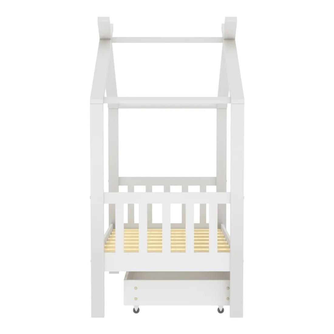 Ce cadre de lit enfant en bois avec tiroir est un supplément pratique et décoratif à la décoration de toute chambre à coucher. Le lit est intelligemment conçu avec un cadre de style maison d'arbre où vous pouvez accrocher des rideaux de lit pour créer de l'intimité pour votre enfant. Il peut aussi servir de soutien pour lire un livre ou de maisonnette pour votre enfant. Fabriqué en bois de pin massif, ce cadre de lit est extrêmement robuste et durable. Les lattes solides offrent le soutien nécessaire et sont très confortables. Le tiroir de lit inclus avec 2 poignées offre un grand espace de rangement pour ranger les vêtements pliés, les jouets, etc. et garder votre pièce propre et bien rangée. Les roues à glissement facile peuvent rouler sur la moquette et le parquet. Ce cadre de lit convient à un matelas mesurant 70 x 140 cm. Veuillez noter que la livraison comprend uniquement un cadre de lit, le matelas et les rideaux ne sont pas inclus. Le lit est facile à assembler. Vous pouvez consulter notre boutique pour les matelas assortis.