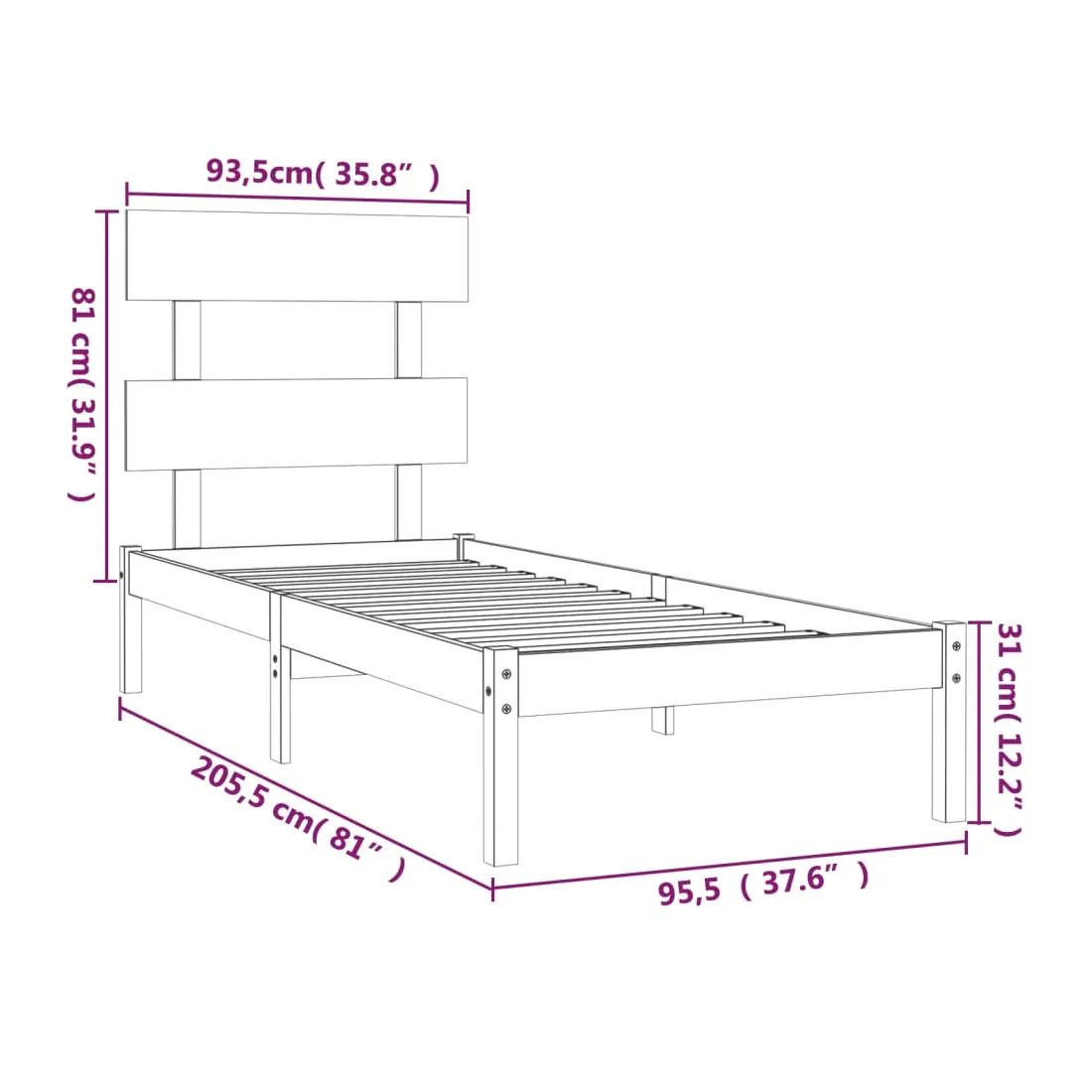 • Dimensions du cadre du lit : 205,5 x 95,5 x 31 cm (L x l x H)