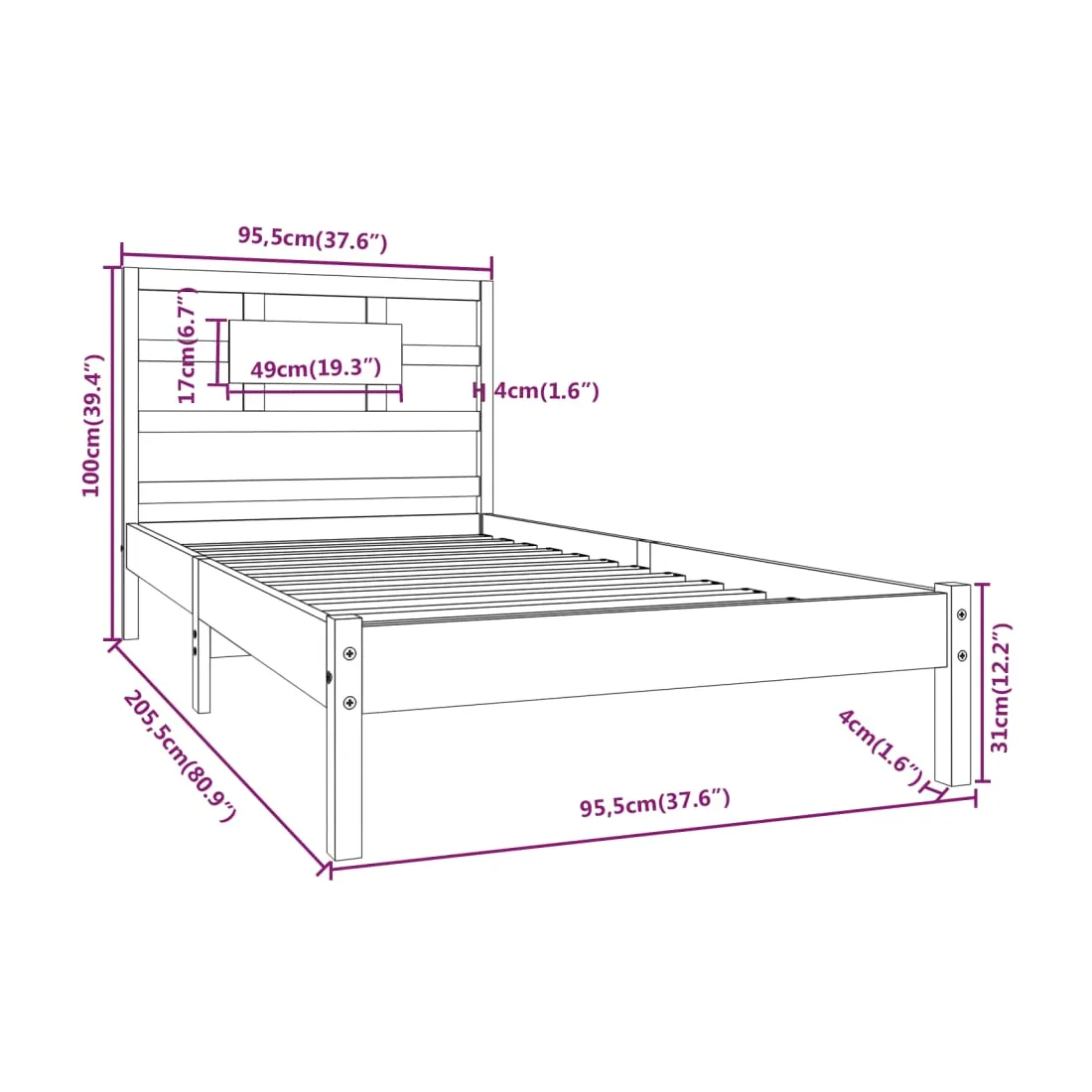 • Dimensions totales du cadre de lit : 205,5 x 95,5 x 100 cm (L x l x H)