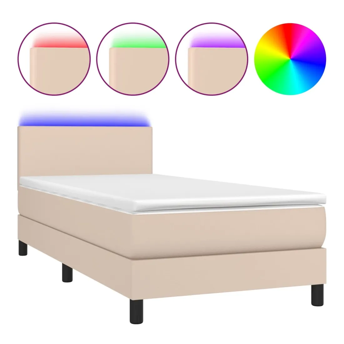 Utilisez ce sommier tapissier avec matelas et LED pour profiter d'un sommeil réparateur ! C'est le point central de votre chambre à coucher. Similicuir durable : le similicuir de qualité supérieure est un matériau très durable. Il est résistant aux taches, ce qui le rend facile à nettoyer avec un chiffon humide. La surface lisse donne également un aspect luxueux et la beauté du cuir véritable.Tête de lit pratique : la tête de lit est réglable en hauteur selon vos préférences. La tête de lit vous offre un excellent soutien du dos lorsque vous êtes assis dans votre lit pour lire ou regarder la télévision.Bande LED colorée : apportez de l'éclairage dans l'obscurité avec des lumières LED colorées !Matelas à ressorts ensachés : le ressort ensaché individuel intégré est connu pour sa très haute qualité tout en assurant un haut niveau de durabilité et d'adaptabilité. Il peut absorber efficacement le bruit et les chocs causés par les sauts et les rotations.Protège-matelas doux pour la peau : le protège-matelas est recouvert d'un tissu résistant et doux pour la peau, ce qui le rend souple et confortable. Remarque :Pour des raisons d'hygiène, le matelas ne peut pas être retourné si l'emballage est retiré ou ouvert.Chaque produit est livré avec un manuel de montage dans la boîte pour un montage facile.Seule la partie avec un symbole de ciseaux peut être coupée et seule la partie avec l'USB continuera à fonctionner comme avant.Ce produit est doté d'un connecteur USB, mais la source d'alimentation certifiée de USB 5V n'est pas incluse.