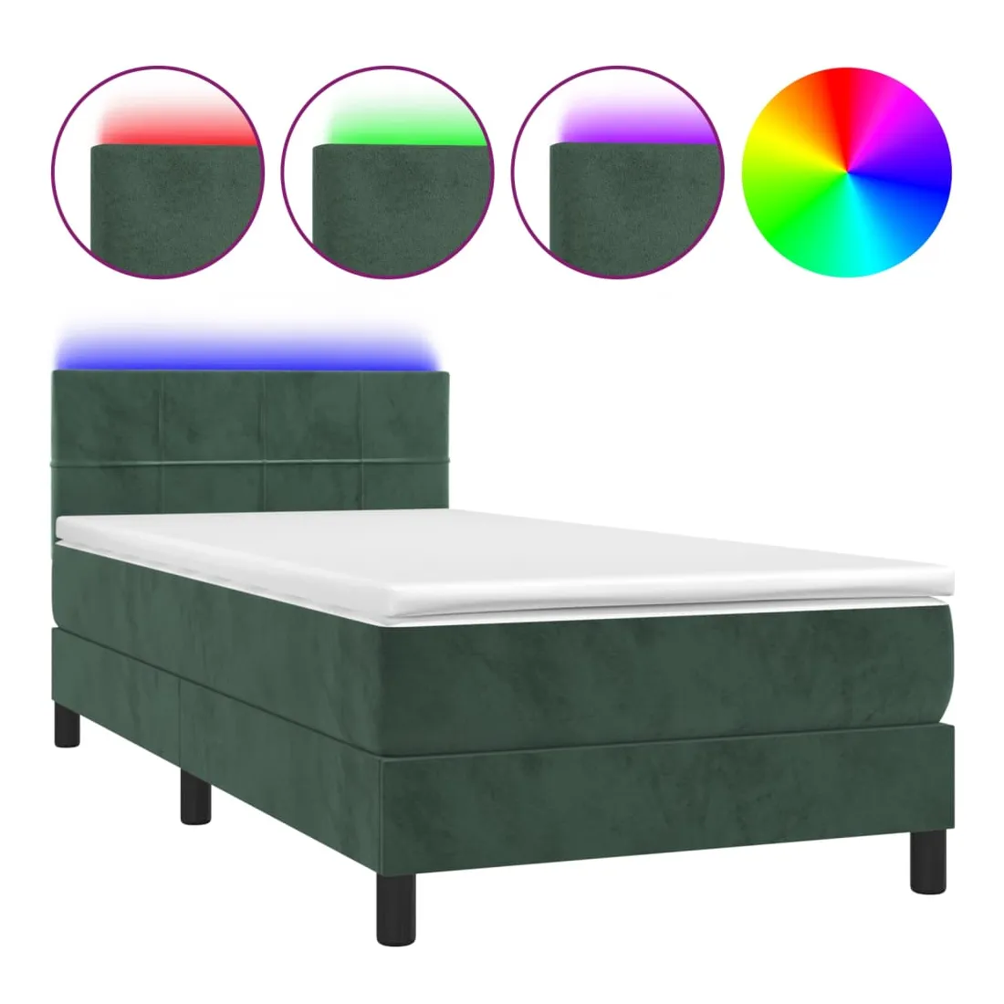 Utilisez ce sommier tapissier avec matelas et LED pour profiter d'un sommeil réparateur ! C'est le point central de votre chambre à coucher. Velours doux : le velours est un tissu doux et luxueux qui se reconnaît à son tas dense de fibres uniformément coupées qui ont une touche lisse. Le tissu en velours présente un toucher doux distinctif, ce qui le rend confortable au toucher.Tête de lit pratique : la tête de lit est réglable en hauteur selon vos préférences. La tête de lit vous offre un excellent soutien du dos lorsque vous êtes assis dans votre lit pour lire ou regarder la télévision.Bande LED colorée : apportez de l'éclairage dans l'obscurité avec des lumières LED colorées !Matelas à ressorts ensachés : le ressort ensaché individuel intégré est connu pour sa très haute qualité tout en assurant un haut niveau de durabilité et d'adaptabilité. Il peut absorber efficacement le bruit et les chocs causés par les sauts et les rotations.Protège-matelas doux pour la peau : le protège-matelas est recouvert d'un tissu résistant et doux pour la peau, ce qui le rend souple et confortable. Remarque :Pour des raisons d'hygiène, le matelas ne peut pas être retourné si l'emballage est retiré ou ouvert.Chaque produit est livré avec un manuel de montage dans la boîte pour un montage facile.Seule la partie avec un symbole de ciseaux peut être coupée et seule la partie avec l'USB continuera à fonctionner comme avant.Ce produit est doté d'un connecteur USB, mais la source d'alimentation certifiée de USB 5V n'est pas incluse.