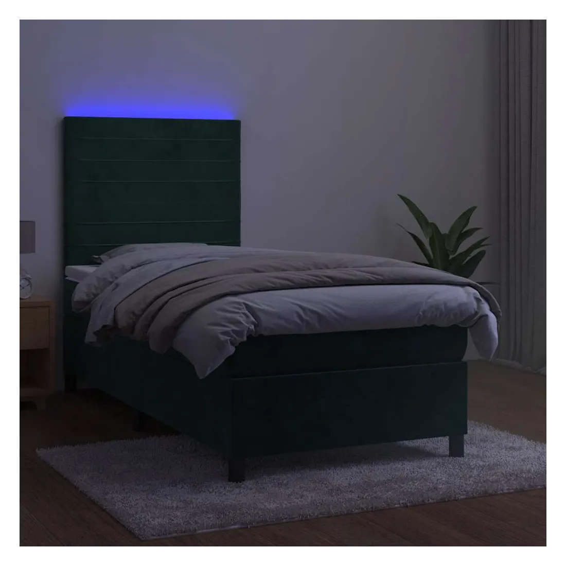 Utilisez ce sommier tapissier avec matelas et LED pour profiter d'un sommeil réparateur ! C'est le point central de votre chambre à coucher. Velours doux : le velours est un tissu doux et luxueux qui se reconnaît à son tas dense de fibres uniformément coupées qui ont une touche lisse. Le tissu en velours présente un toucher doux distinctif, ce qui le rend confortable au toucher.Tête de lit pratique : la tête de lit est réglable en hauteur selon vos préférences. La tête de lit vous offre un excellent soutien du dos lorsque vous êtes assis dans votre lit pour lire ou regarder la télévision.Bande LED colorée : apportez de l'éclairage dans l'obscurité avec des lumières LED colorées !Matelas à ressorts ensachés : le ressort ensaché individuel intégré est connu pour sa très haute qualité tout en assurant un haut niveau de durabilité et d'adaptabilité. Il peut absorber efficacement le bruit et les chocs causés par les sauts et les rotations.Protège-matelas doux pour la peau : le protège-matelas est recouvert d'un tissu résistant et doux pour la peau, ce qui le rend souple et confortable. Remarque :Pour des raisons d'hygiène, le matelas ne peut pas être retourné si l'emballage est retiré ou ouvert.Seule la partie avec un symbole de ciseaux peut être coupée et seule la partie avec l'USB continuera à fonctionner comme avant.Chaque produit est livré avec un manuel de montage dans la boîte pour un montage facile.Ce produit est doté d'un connecteur USB, mais la source d'alimentation certifiée de USB 5V n'est pas incluse.