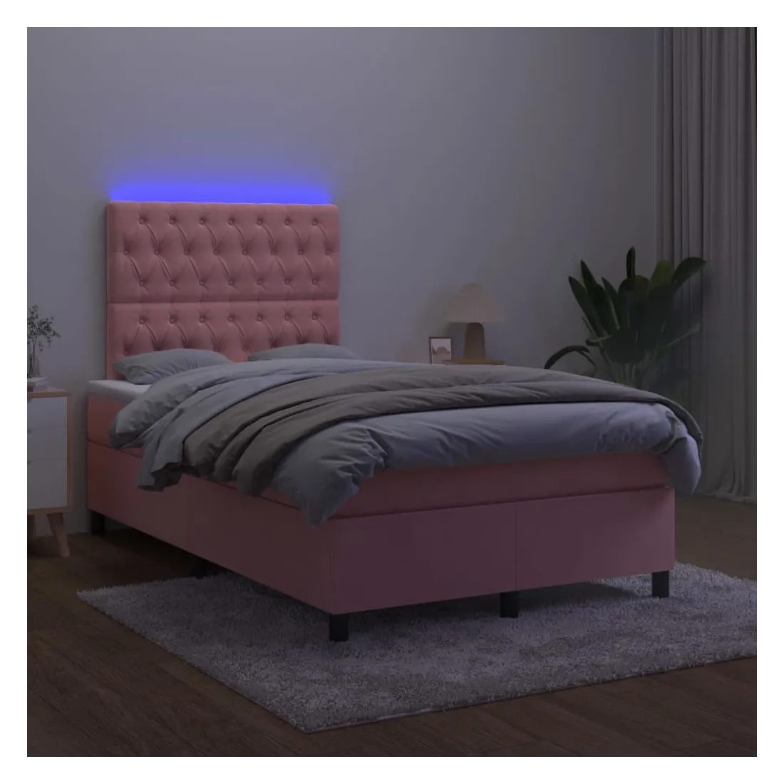 Utilisez ce sommier tapissier avec matelas et LED pour profiter d'un sommeil réparateur ! C'est le point central de votre chambre à coucher. Velours doux : le velours est un tissu doux et luxueux qui se reconnaît à son tas dense de fibres uniformément coupées qui ont une touche lisse. Le tissu en velours présente un toucher doux distinctif, ce qui le rend confortable au toucher.Tête de lit pratique : la tête de lit est réglable en hauteur selon vos préférences. La tête de lit vous offre un excellent soutien du dos lorsque vous êtes assis dans votre lit pour lire ou regarder la télévision.Bande LED colorée : apportez de l'éclairage dans l'obscurité avec des lumières LED colorées !Matelas à ressorts ensachés : le ressort ensaché individuel intégré est connu pour sa très haute qualité tout en assurant un haut niveau de durabilité et d'adaptabilité. Il peut absorber efficacement le bruit et les chocs causés par les sauts et les rotations.Protège-matelas doux pour la peau : le protège-matelas est recouvert d'un tissu résistant et doux pour la peau, ce qui le rend souple et confortable. Remarque :Pour des raisons d'hygiène, le matelas ne peut pas être retourné si l'emballage est retiré ou ouvert.Seule la partie avec un symbole de ciseaux peut être coupée et seule la partie avec l'USB continuera à fonctionner comme avant.Chaque produit est livré avec un manuel de montage dans la boîte pour un montage facile.Ce produit est doté d'un connecteur USB, mais la source d'alimentation certifiée de USB 5V n'est pas incluse.