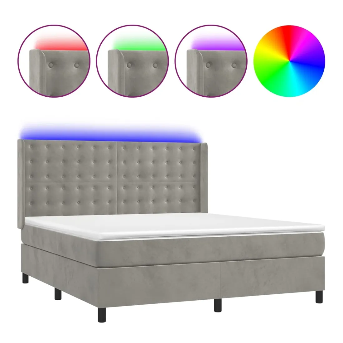 Utilisez ce sommier tapissier avec matelas et LED pour profiter d'un sommeil réparateur ! C'est le point central de votre chambre à coucher. Velours doux : le velours est un tissu doux et luxueux qui se reconnaît à son tas dense de fibres uniformément coupées qui ont une touche lisse. Le tissu en velours présente un toucher doux distinctif, ce qui le rend confortable au toucher.Tête de lit pratique : la tête de lit est réglable en hauteur selon vos préférences. La tête de lit vous offre un excellent soutien du dos lorsque vous êtes assis dans votre lit pour lire ou regarder la télévision.Bande LED colorée : apportez de l'éclairage dans l'obscurité avec des lumières LED colorées !Matelas à ressorts ensachés : le ressort ensaché individuel intégré est connu pour sa très haute qualité tout en assurant un haut niveau de durabilité et d'adaptabilité. Il peut absorber efficacement le bruit et les chocs causés par les sauts et les rotations.Protège-matelas doux pour la peau : le protège-matelas est recouvert d'un tissu résistant et doux pour la peau, ce qui le rend souple et confortable. Remarque :Pour des raisons d'hygiène, le matelas ne peut pas être retourné si l'emballage est retiré ou ouvert.Seule la partie avec un symbole de ciseaux peut être coupée et seule la partie avec l'USB continuera à fonctionner comme avant.Chaque produit est livré avec un manuel de montage dans la boîte pour un montage facile.Ce produit est doté d'un connecteur USB, mais la source d'alimentation certifiée de USB 5V n'est pas incluse.