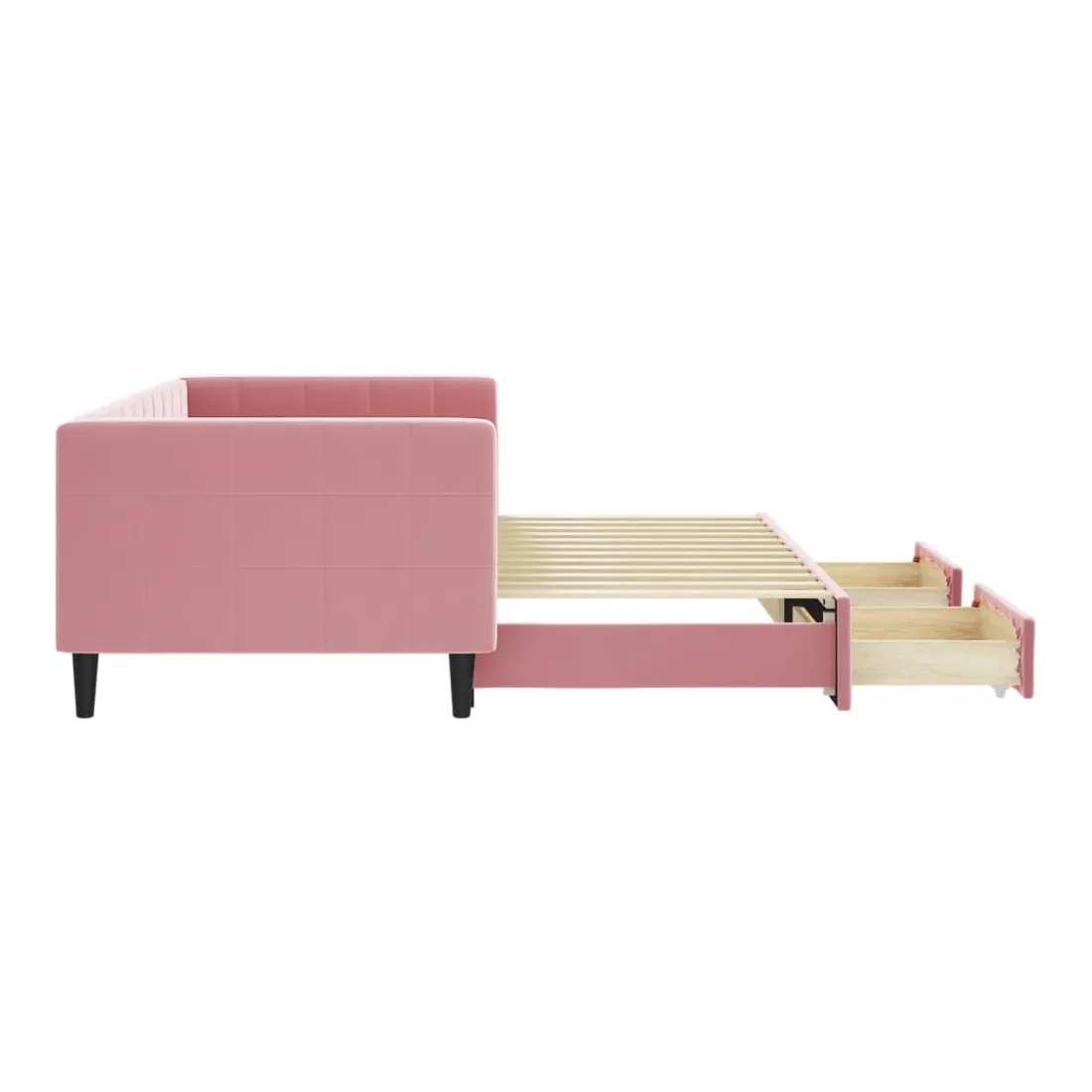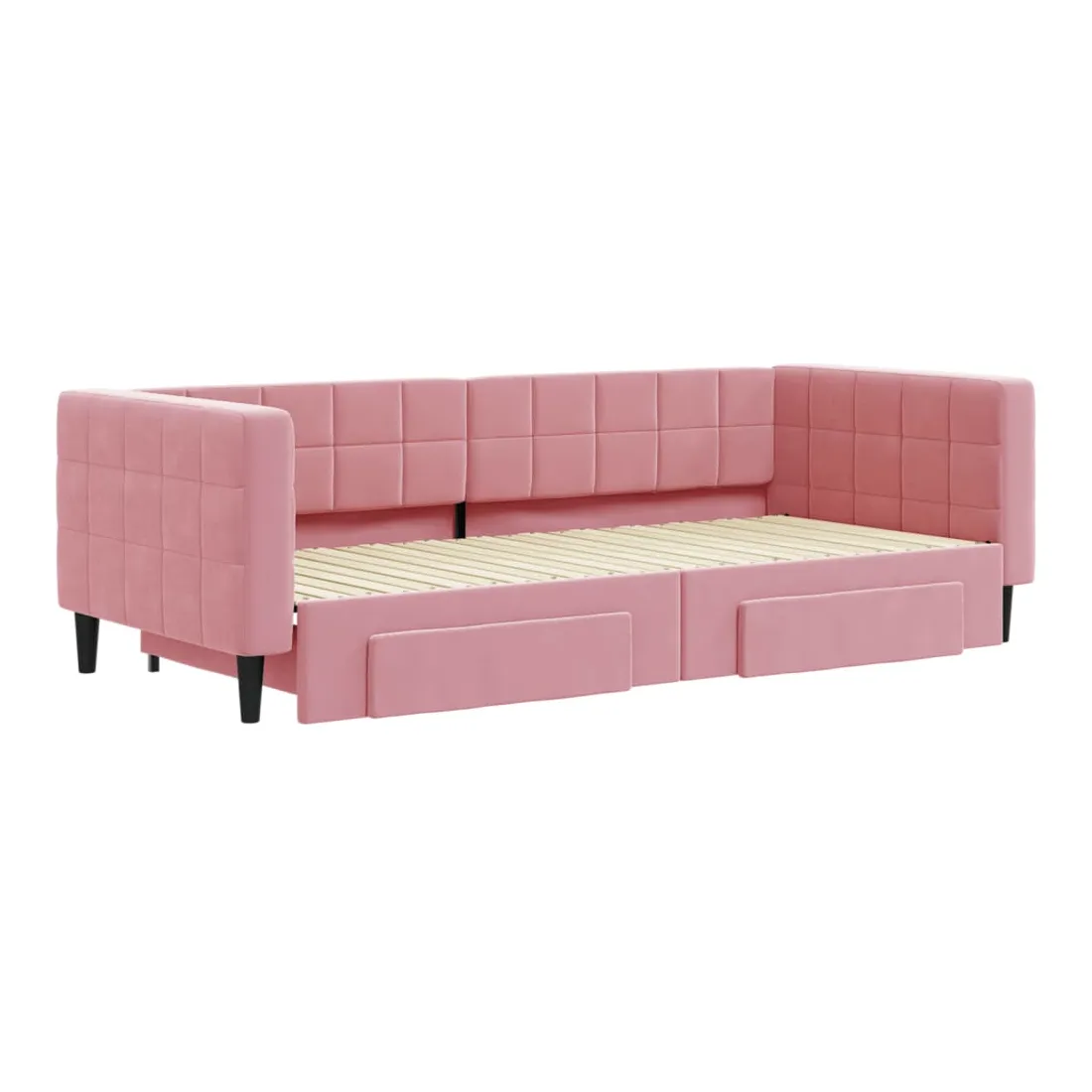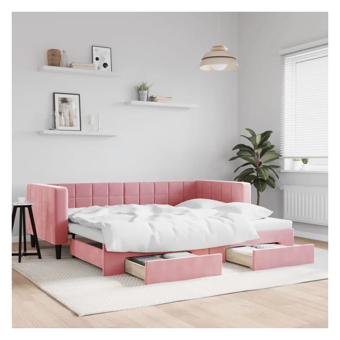 Ce lit de repos 2 en 1 avec lit gigogne, servant à la fois de canapé et de lit, constitue un supplément pratique et accrocheur à votre salon ou chambre à coucher. Lit de repos polyvalent : le canapé-lit fonctionne comme un canapé pendant la journée et se transforme facilement en lit double la nuit en retirant le lit gigogne, offrant une solution pratique pour accueillir des invités et maximiser l'espace.Grand espace de rangement : ce lit d'appoint dispose de deux tiroirs à roulettes qui offrent suffisamment d'espace pour ranger vos vêtements, chaussettes, jouets, coussins, etc.Velours doux et construction solide : ce canapé-lit a un cadre robuste en bois et en métal et est recouvert de velours doux et confortable.Design moderne : le canapé-lit a un design moderne qui présente des lignes épurées, un aspect minimaliste, ainsi que de la lumière naturelle, et ajoutera un style moderne à votre intérieur ! Bon à savoir :Les matelas ne sont pas inclus avec ce lit. Nous proposons une sélection variée de matelas. Vous pouvez consulter notre boutique pour trouver les matelas assortis.