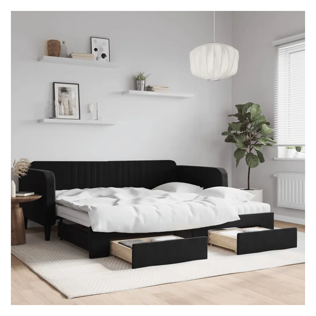 Ce lit de repos 2 en 1 avec lit gigogne, servant à la fois de canapé et de lit, constitue un supplément pratique et accrocheur à votre salon ou chambre à coucher. Lit de repos polyvalent : le canapé-lit fonctionne comme un canapé pendant la journée et se transforme facilement en lit double la nuit en retirant le lit gigogne, offrant une solution pratique pour accueillir des invités et maximiser l'espace.Grand espace de rangement : ce lit d'appoint dispose de deux tiroirs à roulettes qui offrent suffisamment d'espace pour ranger vos vêtements, chaussettes, jouets, coussins, etc.Matelas en mousse confortable : ce lit est fourni avec deux matelas en mousse pour un soutien maximal et un confort optimal.Velours doux et construction solide : ce canapé-lit a un cadre robuste en bois et en métal et est recouvert de velours doux et confortable.