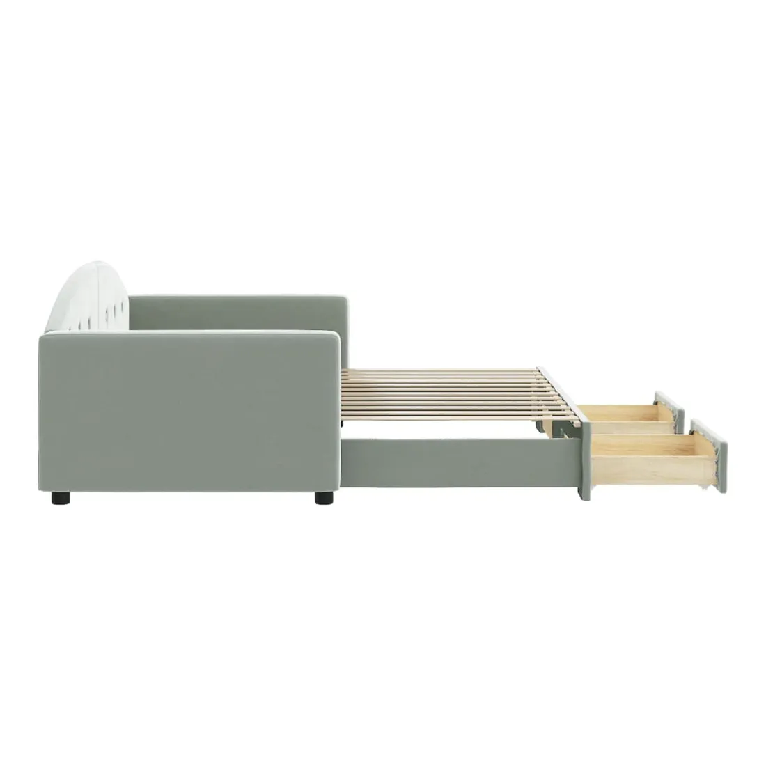 Ce lit de repos 2 en 1 avec lit gigogne et tiroirs, servant à la fois de canapé et de lit, constitue un ajout pratique et accrocheur à votre salon ou chambre à coucher. Lit de repos polyvalent : le canapé-lit fonctionne comme un canapé pendant la journée et se transforme facilement en lit double la nuit en retirant le lit gigogne, offrant une solution pratique pour accueillir des invités et maximiser l'espace.Grand espace de rangement : ce lit d'appoint dispose de deux tiroirs à roulettes qui offrent suffisamment d'espace pour ranger vos vêtements, chaussettes, jouets, coussins, etc.Velours doux et construction solide : ce canapé-lit a un cadre robuste en bois et en métal et est recouvert de velours doux et confortable. Bon à savoir :Les matelas ne sont pas inclus avec ce lit. Nous proposons une sélection variée de matelas. Vous pouvez consulter notre boutique pour trouver les matelas assortis.