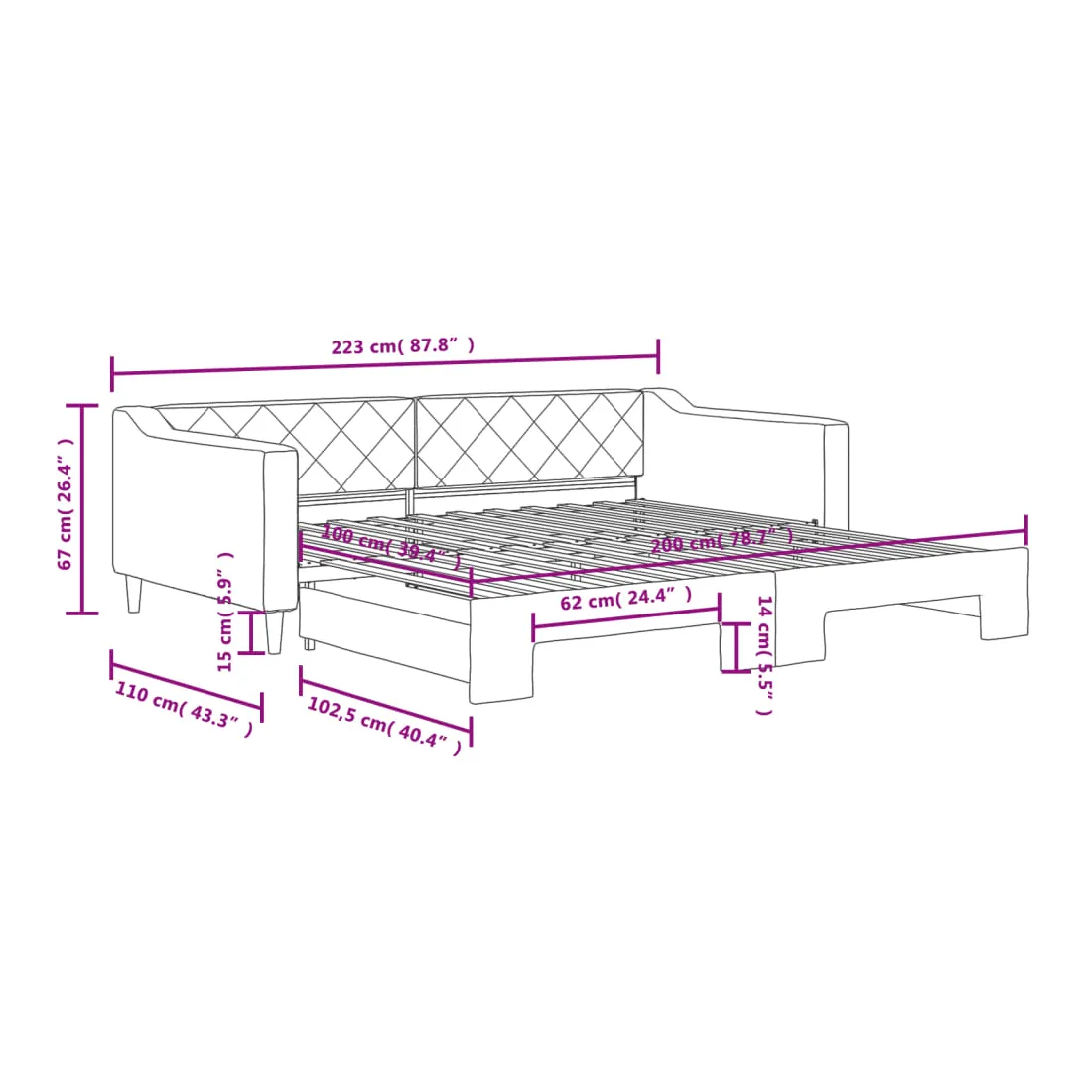 - Dimensions (non étendu) : 223 x 110 x 67 cm (L x l x H)