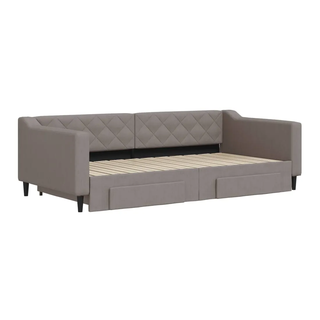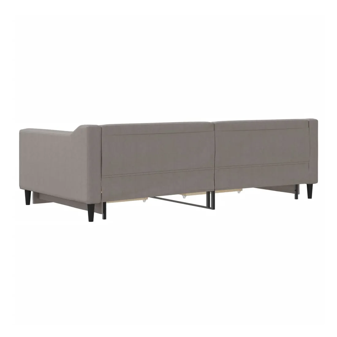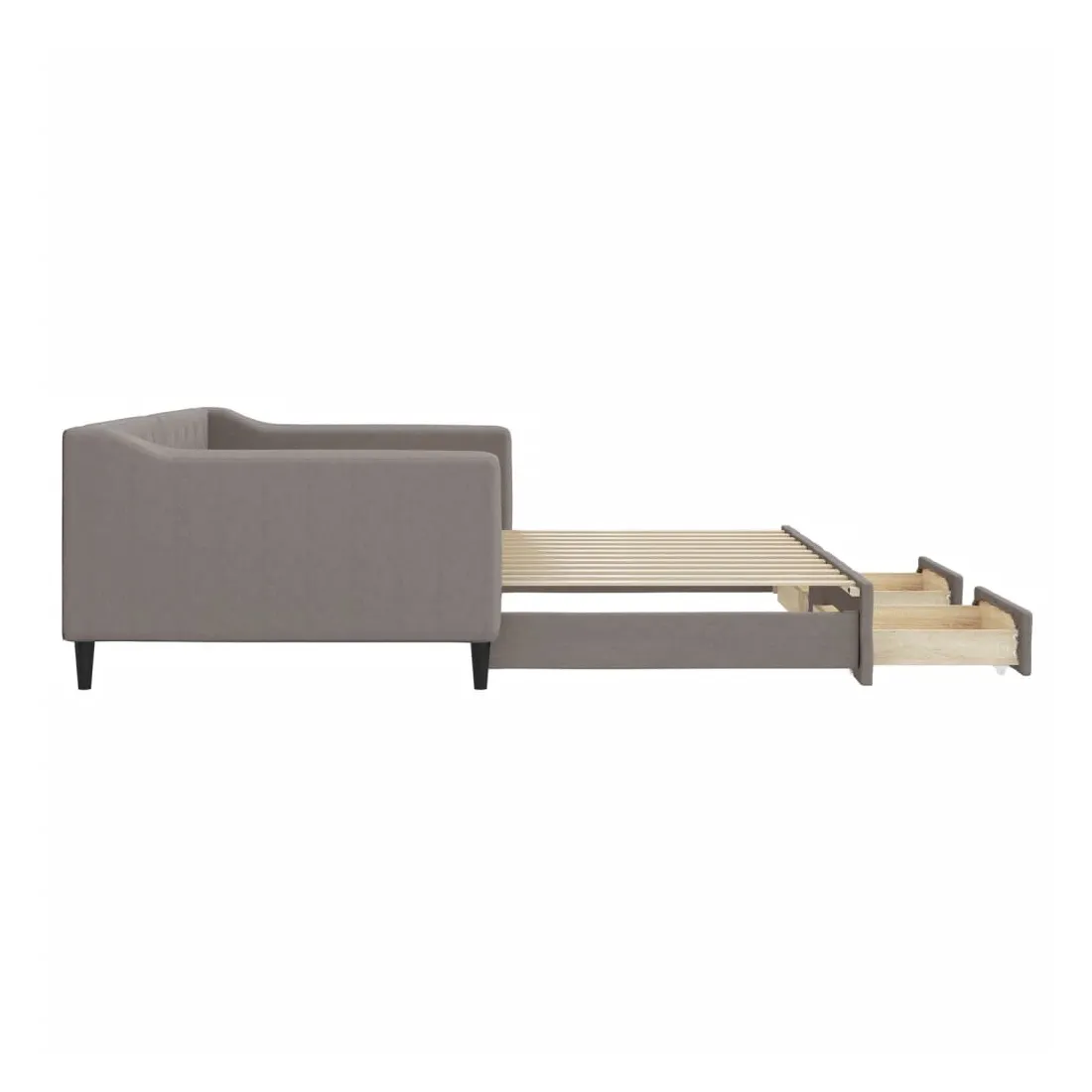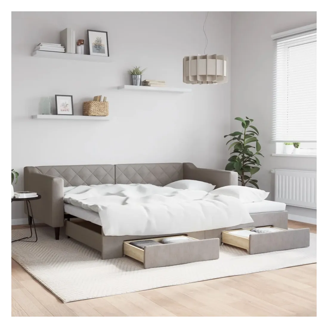 Ce lit de repos 2 en 1 avec lit gigogne, servant à la fois de canapé et de lit, constitue un supplément pratique et accrocheur à votre salon ou chambre à coucher. Lit de repos polyvalent : le canapé-lit fonctionne comme un canapé pendant la journée et se transforme facilement en lit double la nuit en retirant le lit gigogne, offrant une solution pratique pour accueillir des invités et maximiser l'espace. Grand espace de rangement : ce lit d'appoint dispose de deux tiroirs à roulettes qui offrent suffisamment d'espace pour ranger vos vêtements, chaussettes, jouets, coussins, etc. Tissu durable et construction solide : ce canapé-lit a une structure robuste en bois et en métal et est recouvert d'un tissu durable et confortable.Design moderne : le canapé-lit a un design moderne qui présente des lignes épurées, un aspect minimaliste, et ajoutera un style moderne à votre intérieur ! Bon à savoir :Les matelas ne sont pas inclus avec ce lit. Nous proposons une sélection variée de matelas. Vous pouvez consulter notre boutique pour trouver les matelas assortis.