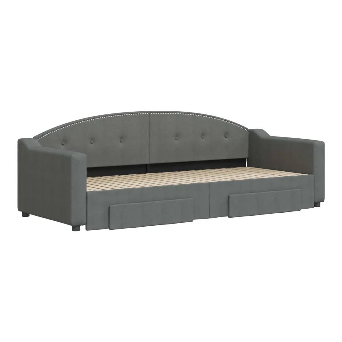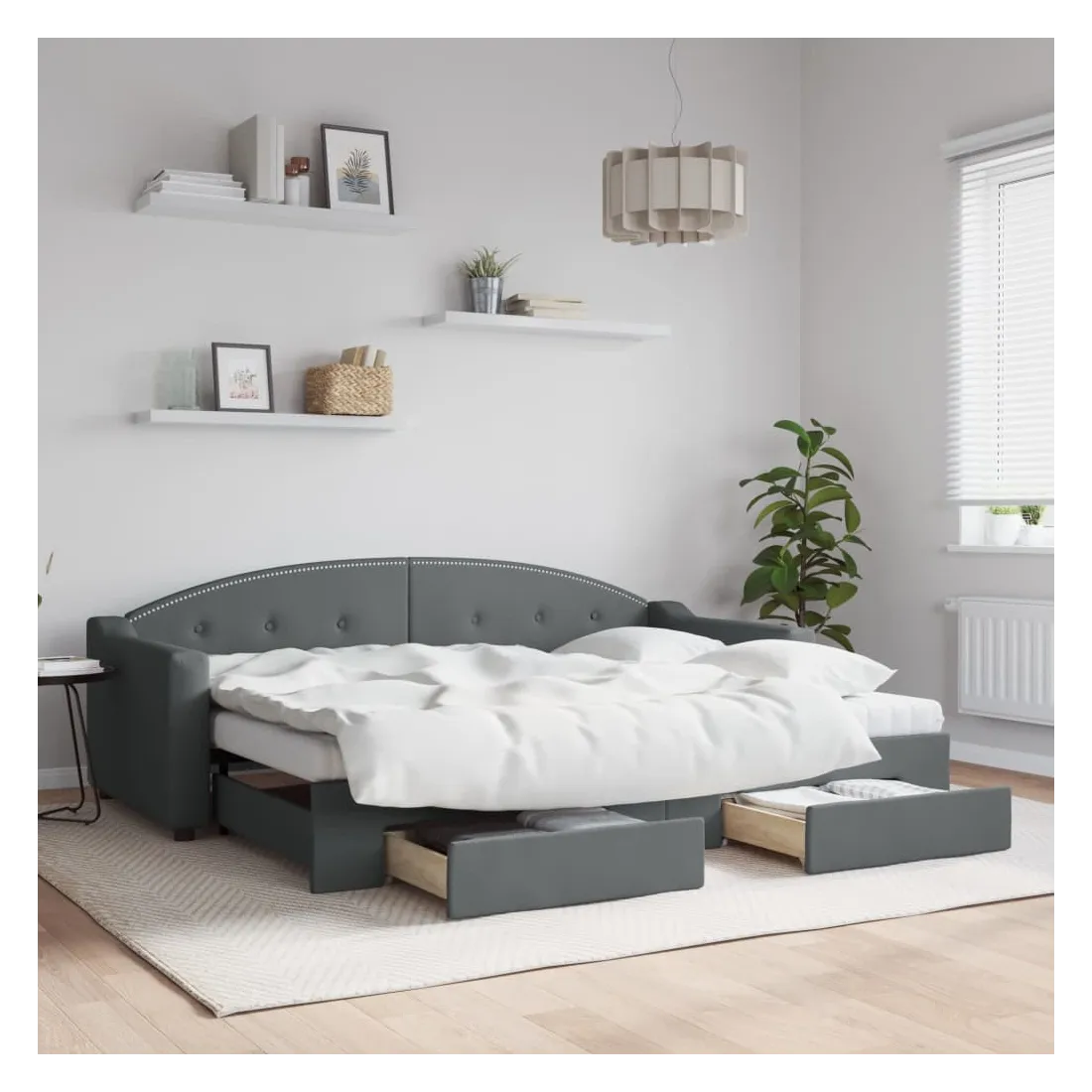 Ce lit de repos 2 en 1 avec lit gigogne, servant à la fois de canapé et de lit, constitue un supplément pratique et accrocheur à votre salon ou chambre à coucher. Lit de repos polyvalent : le canapé-lit fonctionne comme un canapé pendant la journée et se transforme facilement en lit double la nuit en retirant le lit gigogne, offrant une solution pratique pour accueillir des invités et maximiser l'espace. Grand espace de rangement : ce lit d'appoint dispose de deux tiroirs à roulettes qui offrent suffisamment d'espace pour ranger vos vêtements, chaussettes, jouets, coussins, etc. Tissu durable et construction solide : ce canapé-lit a une structure robuste en bois et en métal et est recouvert d'un tissu durable et confortable. Bon à savoir :Les matelas ne sont pas inclus avec ce lit de repos. Nous proposons une sélection variée de matelas. Vous pouvez consulter notre boutique pour les matelas assortis.