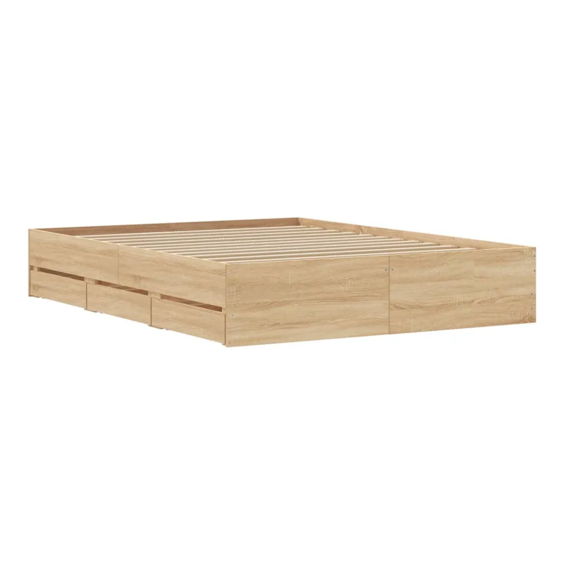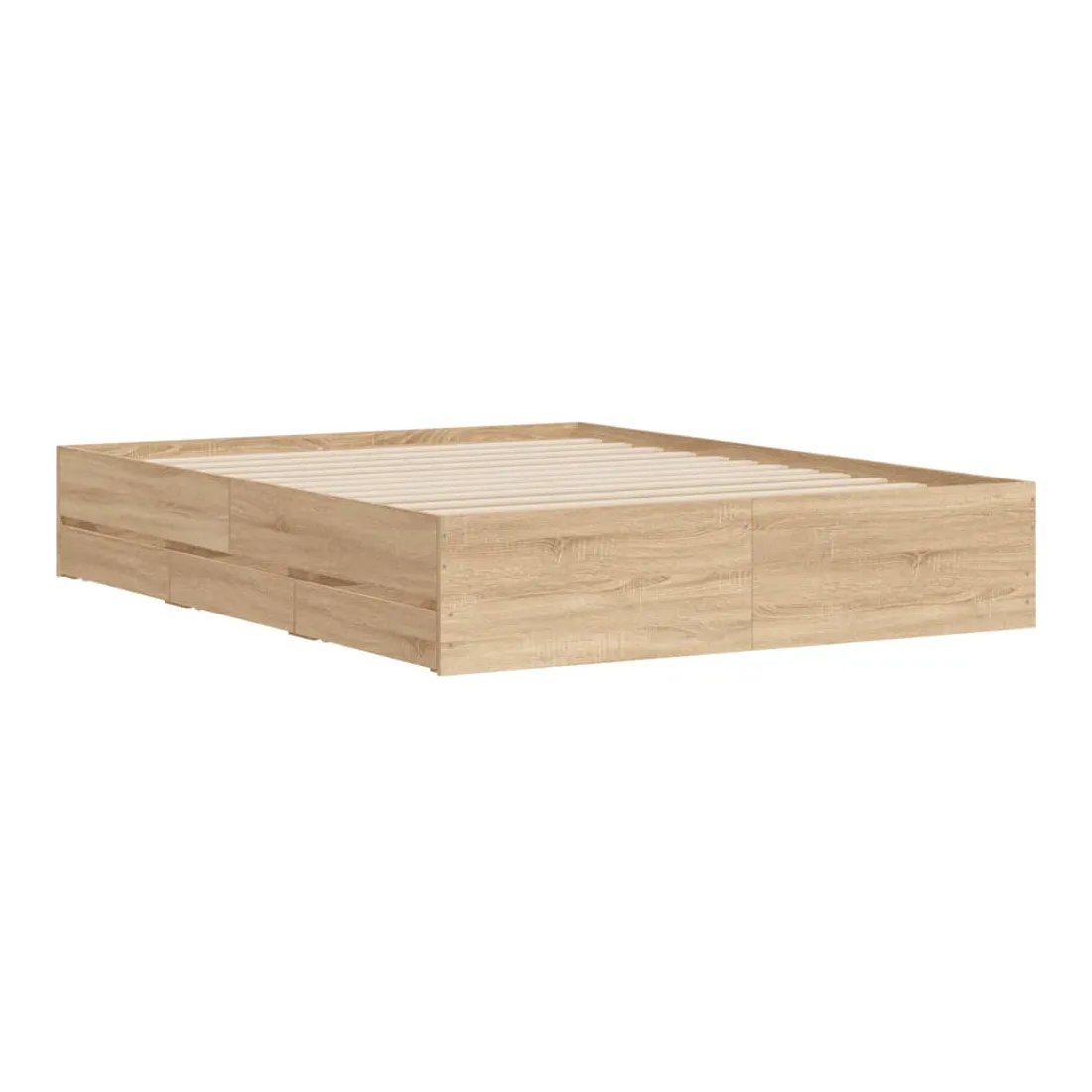 Ajoutez une touche moderne à votre chambre à coucher avec ce cadre de lit avec tiroirs ! Il apportera une touche pratique et décorative à votre espace de vie. Matériau durable : le cadre de lit est fabriquée en bois d'ingénierie. Le bois d'ingénierie est d'une qualité exceptionnelle avec une surface lisse et présente également de la résistance, de la stabilité et de la résistance à l'humidité.Lattes robustes : les lattes de contreplaqué assurent une bonne répartition du poids, garantissant que le matelas reste en place à chaque torsion de votre corps pendant le sommeil.Fonction de rangement : les tiroirs de lit inclus offrent suffisamment d'espace de rangement pour ranger vos articles essentiels, gardant votre pièce propre et bien rangée. Bon à savoir :Un matelas n'est pas inclus avec ce lit. Nous offrons une sélection variée de matelas. Vous pouvez consulter notre boutique pour trouver un matelas assorti.