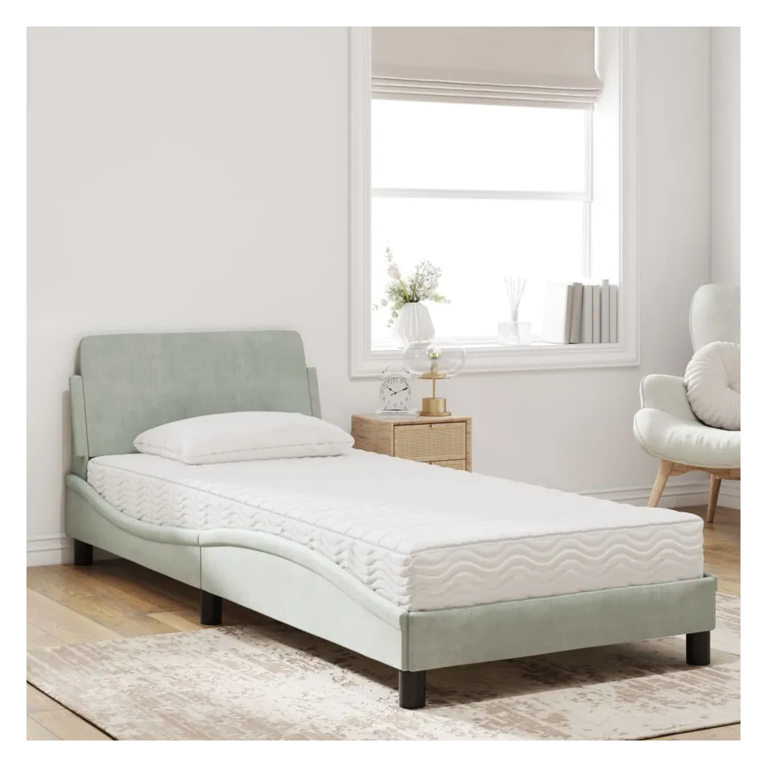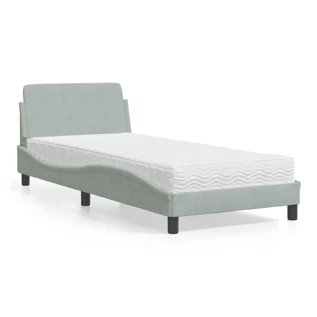 Obtenez une meilleure nuit de sommeil reposante grâce à ce lit avec matelas ! Il est un supplément accueillant à toute chambre à coucher. Velours doux : le velours est un tissu doux et confortable, agréable au toucher.Lattes de contreplaqué : les lattes de contreplaqué assurent une bonne répartition du poids, garantissant que le matelas reste en place à chaque torsion de votre corps pendant le sommeil.Excellent soutien : la tête de lit vous offre un excellent soutien du dos lorsque vous êtes assis dans votre lit pour lire ou regarder la télévision.Matelas en mousse : ce matelas de lit en tissu à 3 couches est rempli de mousse PU 22D pour un confort optimal. Il contribue à soulager la fatigue et à favoriser la circulation sanguine, vous offrant ainsi une relaxation complète et une bonne qualité de sommeil. En outre, le matelas est disponible en dureté H2 et H3, de sorte que vous pouvez simplement tourner le matelas pour choisir la dureté qui vous convient le mieux.Design latéral ondulé : l’aspect ondulé du cadre de lit est élégant et sophistiqué, ajoutant une touche moderne et élégante à votre décor, ce qui en fait le point central de votre chambre à coucher.
