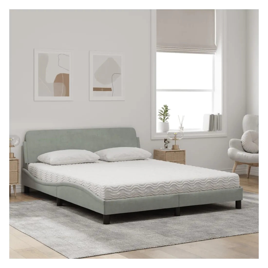 Obtenez une meilleure nuit de sommeil reposante grâce à ce lit avec matelas ! Il est un supplément accueillant à toute chambre à coucher. Velours doux : le velours est un tissu doux et confortable, agréable au toucher.Lattes de contreplaqué : les lattes de contreplaqué assurent une bonne répartition du poids, garantissant que le matelas reste en place à chaque torsion de votre corps pendant le sommeil.Excellent soutien : la tête de lit vous offre un excellent soutien du dos lorsque vous êtes assis dans votre lit pour lire ou regarder la télévision.Matelas en mousse : ce matelas de lit en tissu à 3 couches est rempli de mousse PU 22D pour un confort optimal. Il contribue à soulager la fatigue et à favoriser la circulation sanguine, vous offrant ainsi une relaxation complète et une bonne qualité de sommeil. En outre, le matelas est disponible en dureté H2 et H3, de sorte que vous pouvez simplement tourner le matelas pour choisir la dureté qui vous convient le mieux.Design latéral ondulé : l’aspect ondulé du cadre de lit est élégant et sophistiqué, ajoutant une touche moderne et élégante à votre décor, ce qui en fait le point central de votre chambre à coucher.