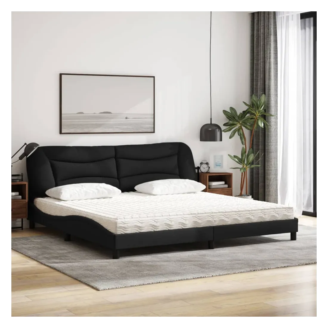 Obtenez une meilleure nuit de sommeil reposante grâce à ce lit avec matelas ! Il est un supplément accueillant à toute chambre à coucher. Tissu durable : le tissu présente un aspect simple et épuré, et il est respirant et durable.Lattes de contreplaqué : les lattes de contreplaqué assurent une bonne répartition du poids, garantissant que le matelas reste en place à chaque torsion de votre corps pendant le sommeil.Excellent soutien : la tête de lit vous offre un excellent soutien du dos lorsque vous êtes assis dans votre lit pour lire ou regarder la télévision.Matelas en mousse : ce matelas de lit en tissu à 3 couches est rempli de mousse PU 22D pour un confort optimal. Il contribue à soulager la fatigue et à favoriser la circulation sanguine, vous offrant ainsi une relaxation complète et une bonne qualité de sommeil. En outre, le matelas est disponible en dureté H2 et H3, de sorte que vous pouvez simplement tourner le matelas pour choisir la dureté qui vous convient le mieux.Design latéral ondulé : l’aspect ondulé du cadre de lit est élégant et sophistiqué, ajoutant une touche moderne et élégante à votre décor, ce qui en fait le point central de votre chambre à coucher.