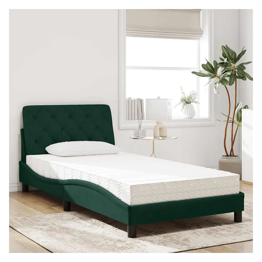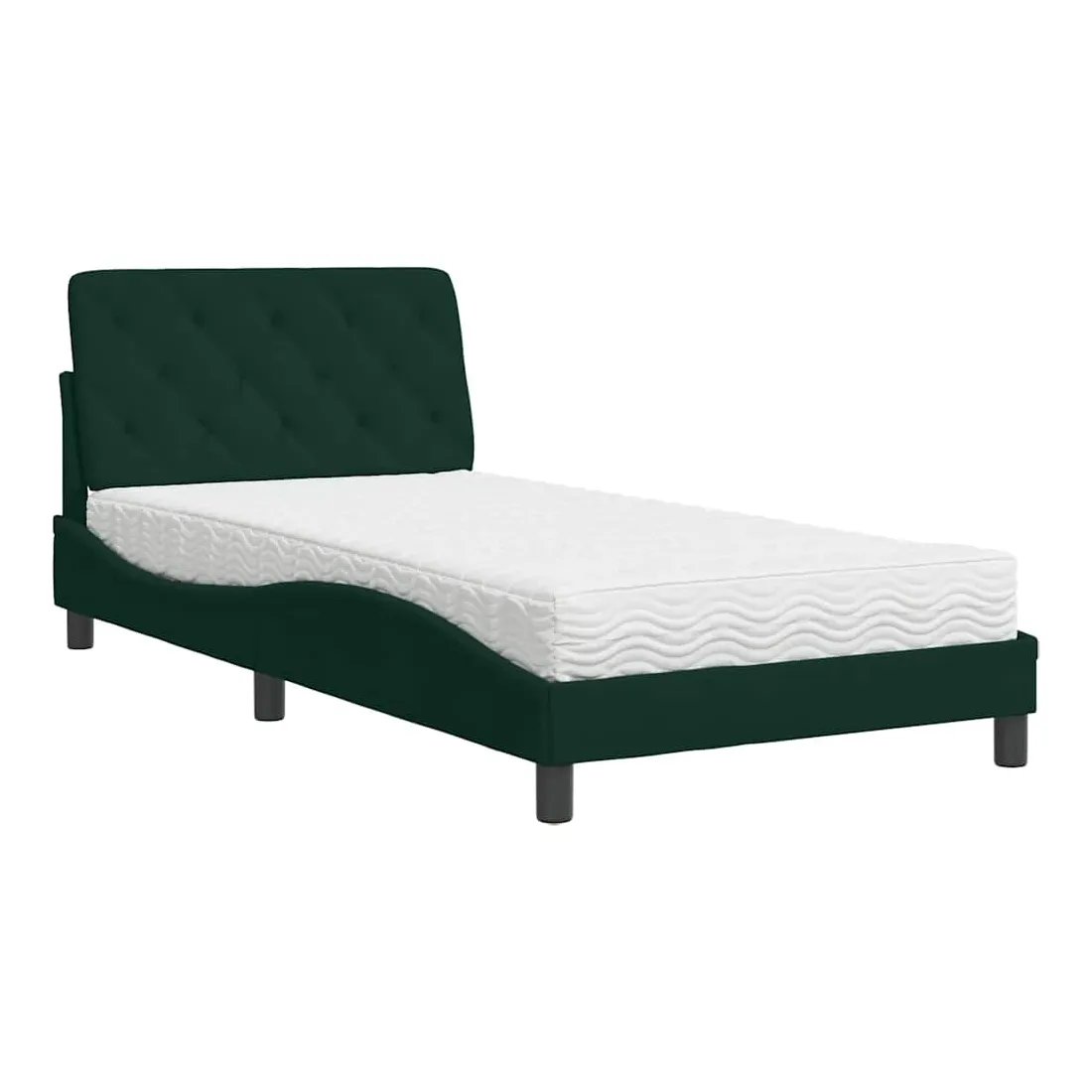 Obtenez une meilleure nuit de sommeil reposante grâce à ce lit avec matelas ! Il est un supplément accueillant à toute chambre à coucher. Velours doux : le velours est un tissu doux et confortable, agréable au toucher.Lattes de contreplaqué : les lattes de contreplaqué assurent une bonne répartition du poids, garantissant que le matelas reste en place à chaque torsion de votre corps pendant le sommeil.Excellent soutien : la tête de lit vous offre un excellent soutien du dos lorsque vous êtes assis dans votre lit pour lire ou regarder la télévision.Matelas en mousse : ce matelas de lit en tissu à 3 couches est rempli de mousse PU 22D pour un confort optimal. Il contribue à soulager la fatigue et à favoriser la circulation sanguine, vous offrant ainsi une relaxation complète et une bonne qualité de sommeil. En outre, le matelas est disponible en dureté H2 et H3, de sorte que vous pouvez simplement tourner le matelas pour choisir la dureté qui vous convient le mieux.Design latéral ondulé : l’aspect ondulé du cadre de lit est élégant et sophistiqué, ajoutant une touche moderne et élégante à votre décor, ce qui en fait le point central de votre chambre à coucher.