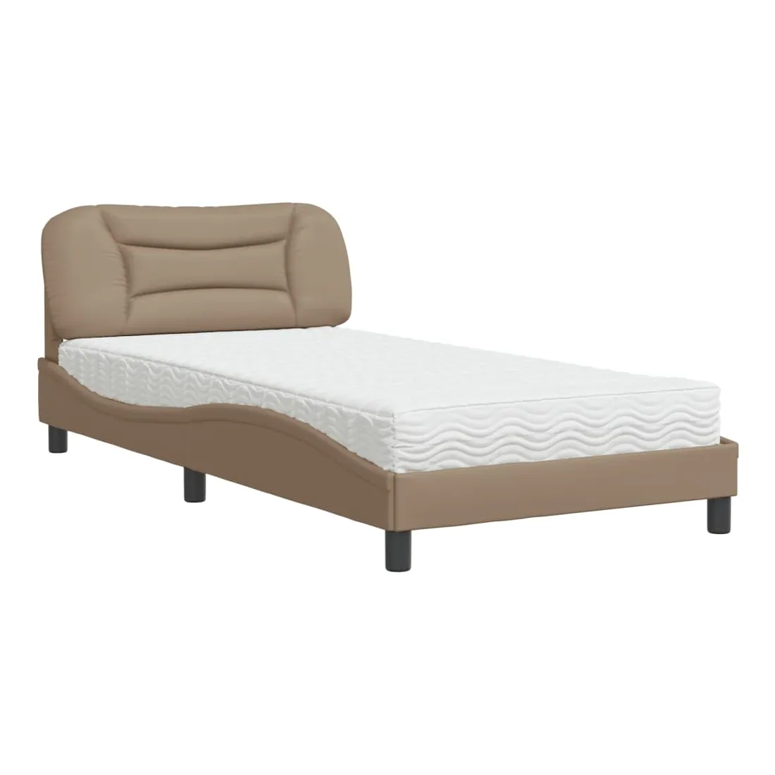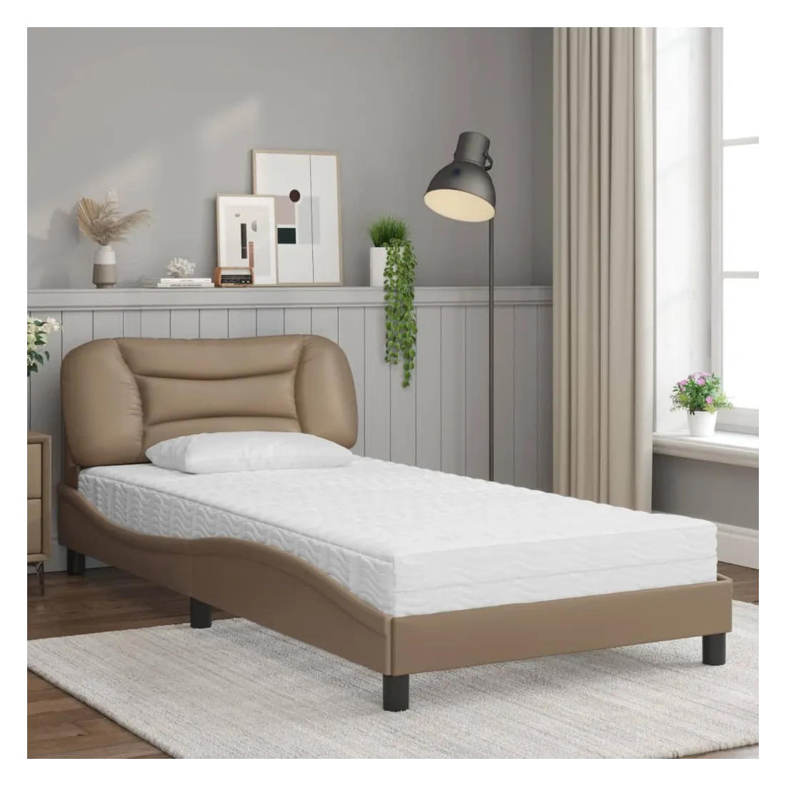 Obtenez une meilleure nuit de sommeil reposante grâce à ce lit avec matelas ! Il est un supplément accueillant à toute chambre à coucher. Similicuir durable : le similicuir de qualité supérieure est un matériau très durable. Il est résistant aux taches, ce qui le rend facile à nettoyer avec un chiffon humide. La surface lisse donne également un aspect luxueux et la beauté du cuir véritable.Lattes de contreplaqué : les lattes de contreplaqué assurent une bonne répartition du poids, garantissant que le matelas reste en place à chaque torsion de votre corps pendant le sommeil.Excellent soutien : la tête de lit vous offre un excellent soutien du dos lorsque vous êtes assis dans votre lit pour lire ou regarder la télévision.Matelas en mousse : ce matelas de lit en tissu à 3 couches est rempli de mousse PU 22D pour un confort optimal. Il contribue à soulager la fatigue et à favoriser la circulation sanguine, vous offrant ainsi une relaxation complète et une bonne qualité de sommeil. En outre, le matelas est disponible en dureté H2 et H3, de sorte que vous pouvez simplement tourner le matelas pour choisir la dureté qui vous convient le mieux.Design latéral ondulé : l’aspect ondulé du cadre de lit est élégant et sophistiqué, ajoutant une touche moderne et élégante à votre décor, ce qui en fait le point central de votre chambre à coucher.